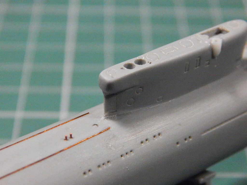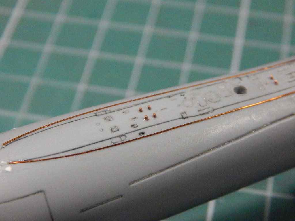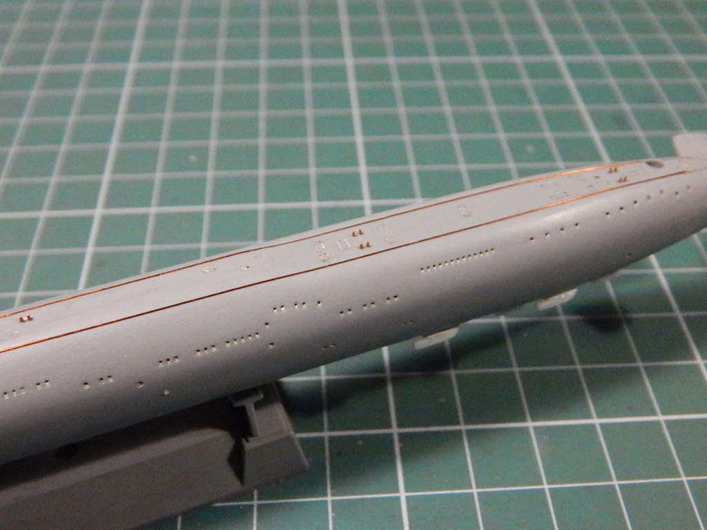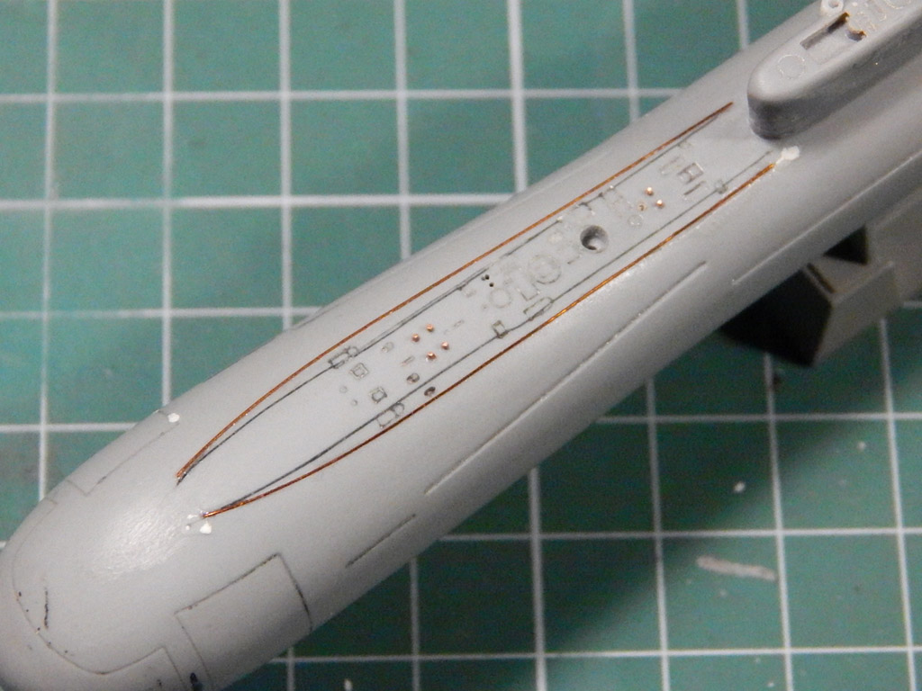 Попробовал ленту HASEGAWA 0,2 мм шириной - не понравилась, рвется. Использовал проверенную AIZU 0,4 мм. В перерывах теряются навыки - поторопился снять маску с ватерлинии. Надо еще выделять антенны ГАК.