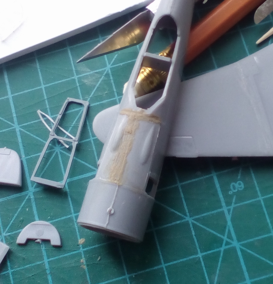 еще подогнал фонарь от Ла-5Ф Проп и Джет, обточив фюзеляж снаружи и сточив внутри плоскость прилегания в районе фонаря, под заднюю секцию срезал ступеньку с "рельсами". так как взял "лишний" (из модели под машину Попкова) фонарь с выпуклым колпаком (ранние Ф), то пришлось эту выпуклость сточить. смола конечно более хрупкая, чем пластик, но вполне поддается шлифовке. трещина правда появилась, но во время отделения с литника( посему думаю делать открытый, благо есть цветное травление такое -