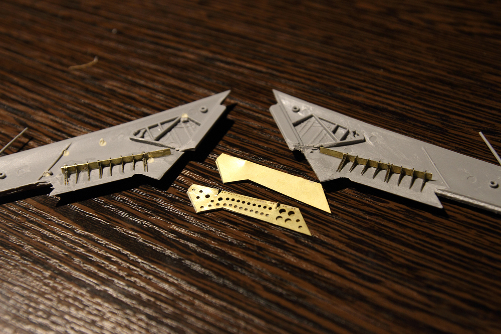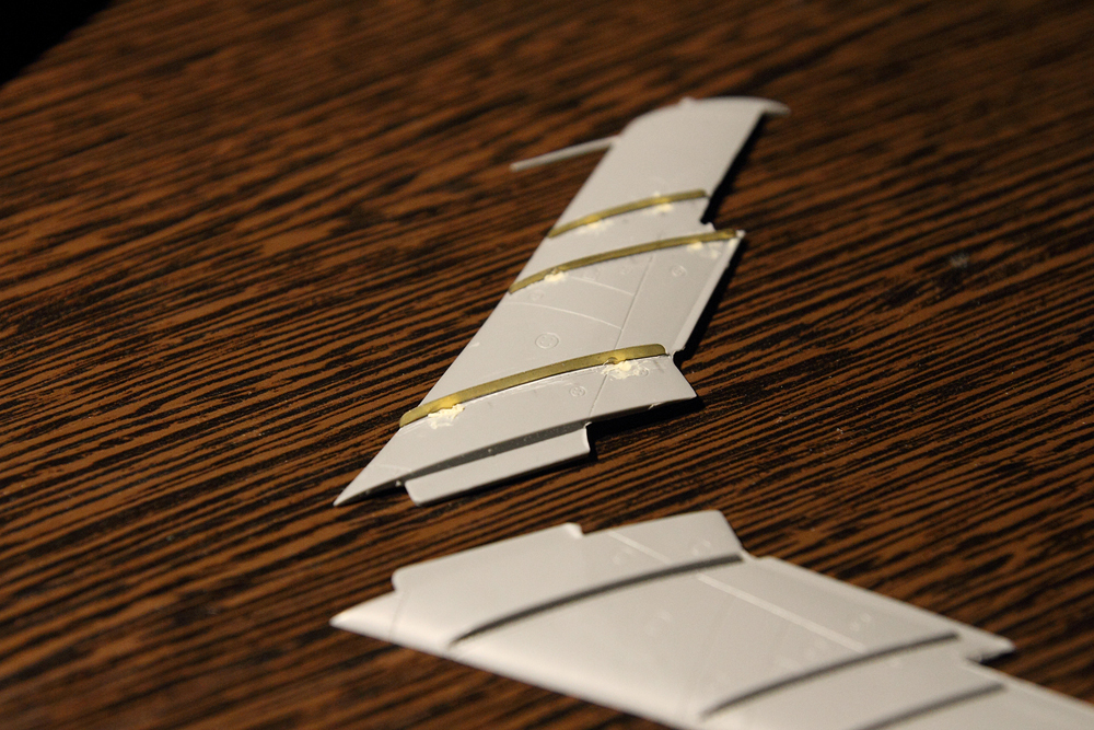 Добрался до модели и немного попортил правую консоль. Пока не было понимания, удастся сделать закрылок или нет - не трогал. Вроде получился. Сточил на пластике закрылок снизу, вырезал элерон. Собрал имитацию хвостовых нервюр, вклеил. Промахнулся относительно нижней половины. Пришлось отрывать и переклеивать. Кронштейны на закрылок оказались короткими, за них прикрепить уже не получится - буду ставить на клей.