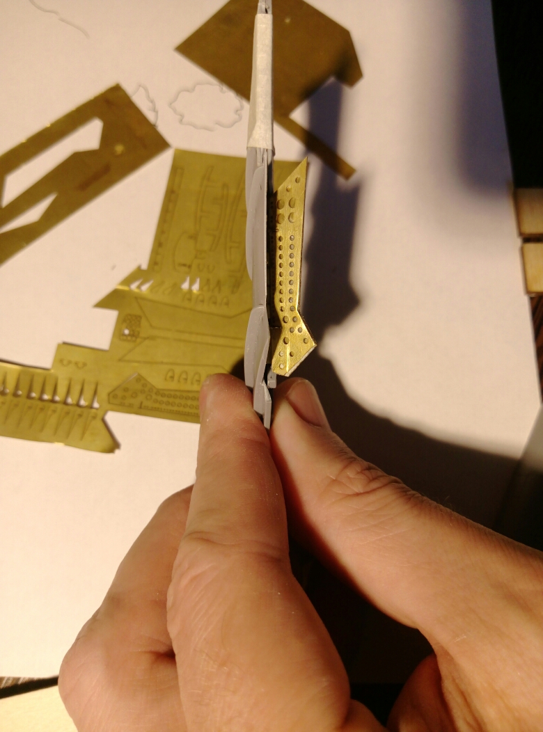 Попробовал посадить аэродинамические гребни. Когда измерял изгиб крыла штангельциркулем, думал получится лажа. Ан нет, когда приложил, сели почти как родные. Не знаю, насколько актуально сверлить отверстия под посадочные ножки. Может секунды хватит и без них. Может нагревом впаять. Но одну консоль сделал так. Выигрыш по толщине явно заметен.