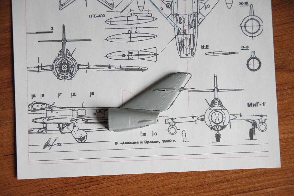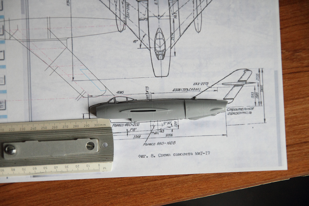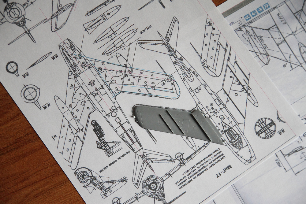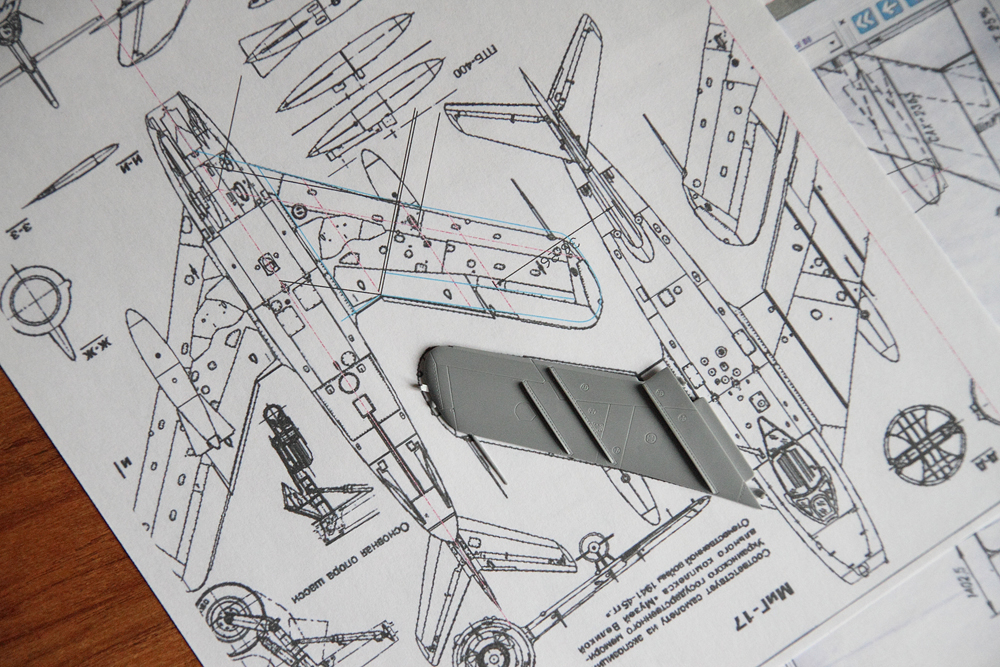 После подробного рассмотрения модели, стало как то совсем грустно (кто не знает - ниже выложил фото). При отличной расшивке, лючки сделаны по мотивам: не там, не такие, не с той модификации. Наложение на чертежи оптимизма тоже не прибавило. Фюзеляж короче на 3-4мм, уже по диаметру. Крыло вроде вписывается в чертежи и даже углы совпадают, но как видно по ПВД угол установки крыла на модели сделан с большим углом. Чертежи "Авиация и Время" считаются одними из самых точных, но углы стреловидности консолей не соответствуют схеме, указанной в ТО на МиГ-17 (голубым цветом показан контур, построенный по чертежам). Соответственно на модели реальный угол стреловидности будет еще больше. Горизонтальное оперение почти совпадает, а вертикальное по задней кромке имеет совсем другие углы.