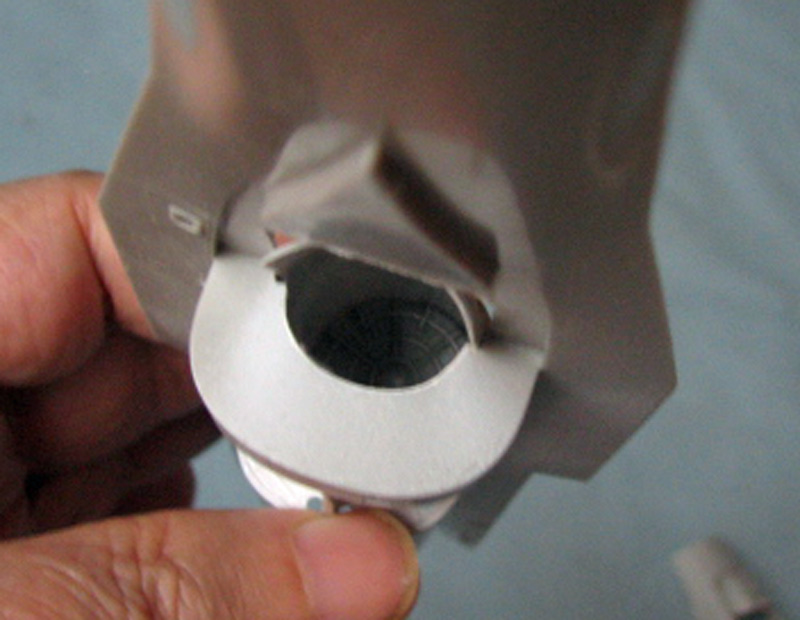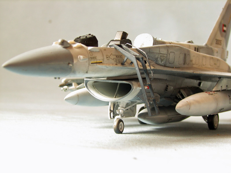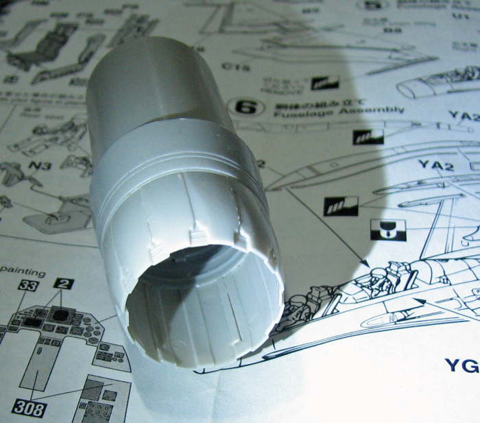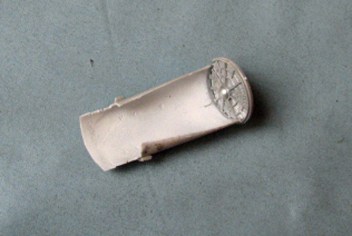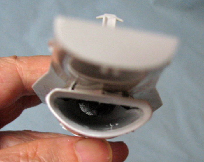 Заглушка хорошо видна и поэтому решил сделать канал воздуховода. Прорезал отверстие, из ВЗ от другой версии Ф-16 сделал канал, установил начало движка и открасил белой краской.