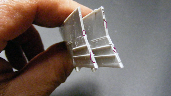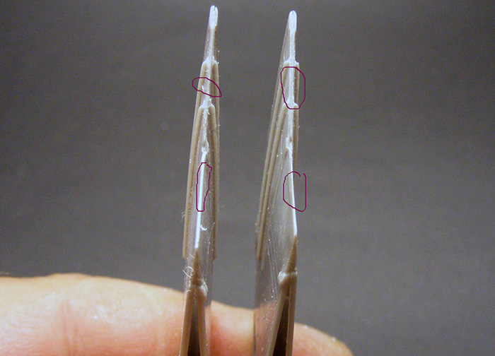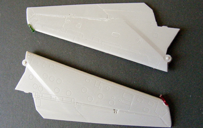 Оказывается, иногда очень полезно просматривать фотографии своей работы. Так собрался было сегодня выложить фотки фюзеляжа с приклеенной мелочевкой и внезапно заметил, что балки тепловых ловушек приклеены наоборот. Естественно, фото тут же в корзину, а работу на переделку. В данном случае производитель дает исключительно точную инструкцию по монтажу, с привязкой к имеющимся линиям расшивки.
