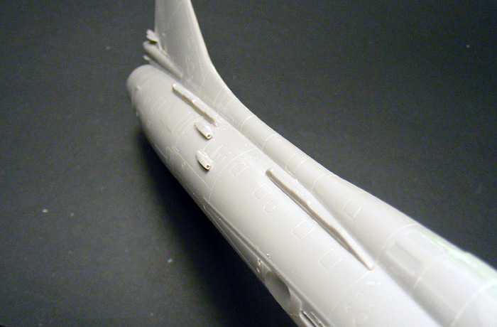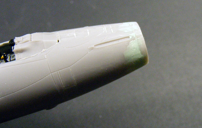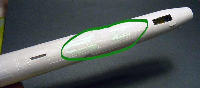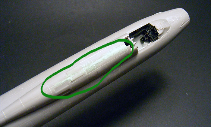 Как рекомендует инструкция, зашпаклевал места для установки подфюзеляжных пилонов. Заморачиваться с ликвидацией ступеньки по стыку сильно не стал - контейнер скроет огрехи.