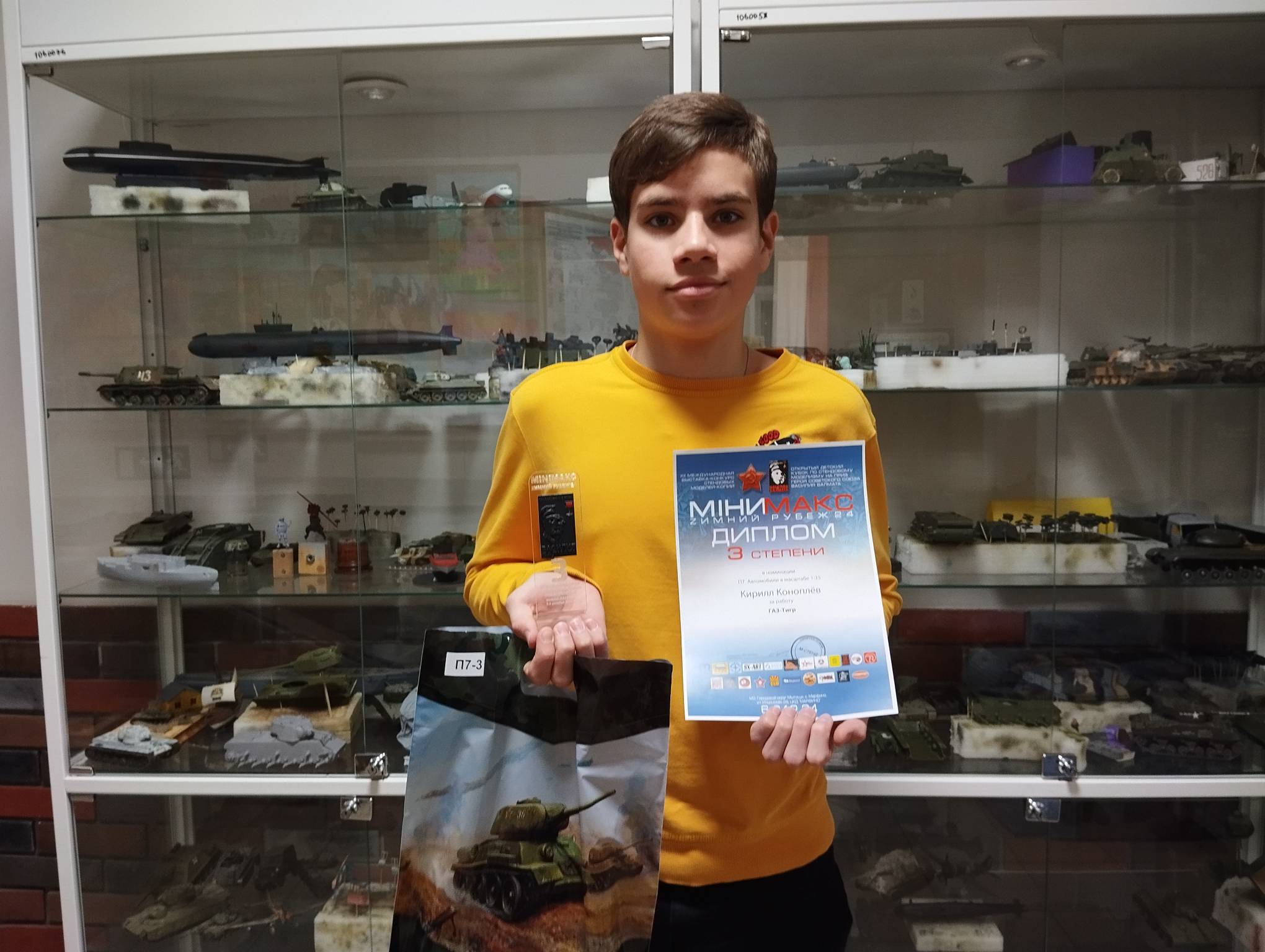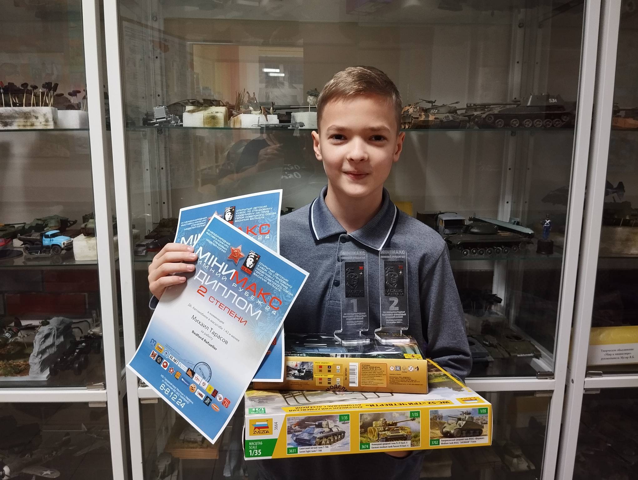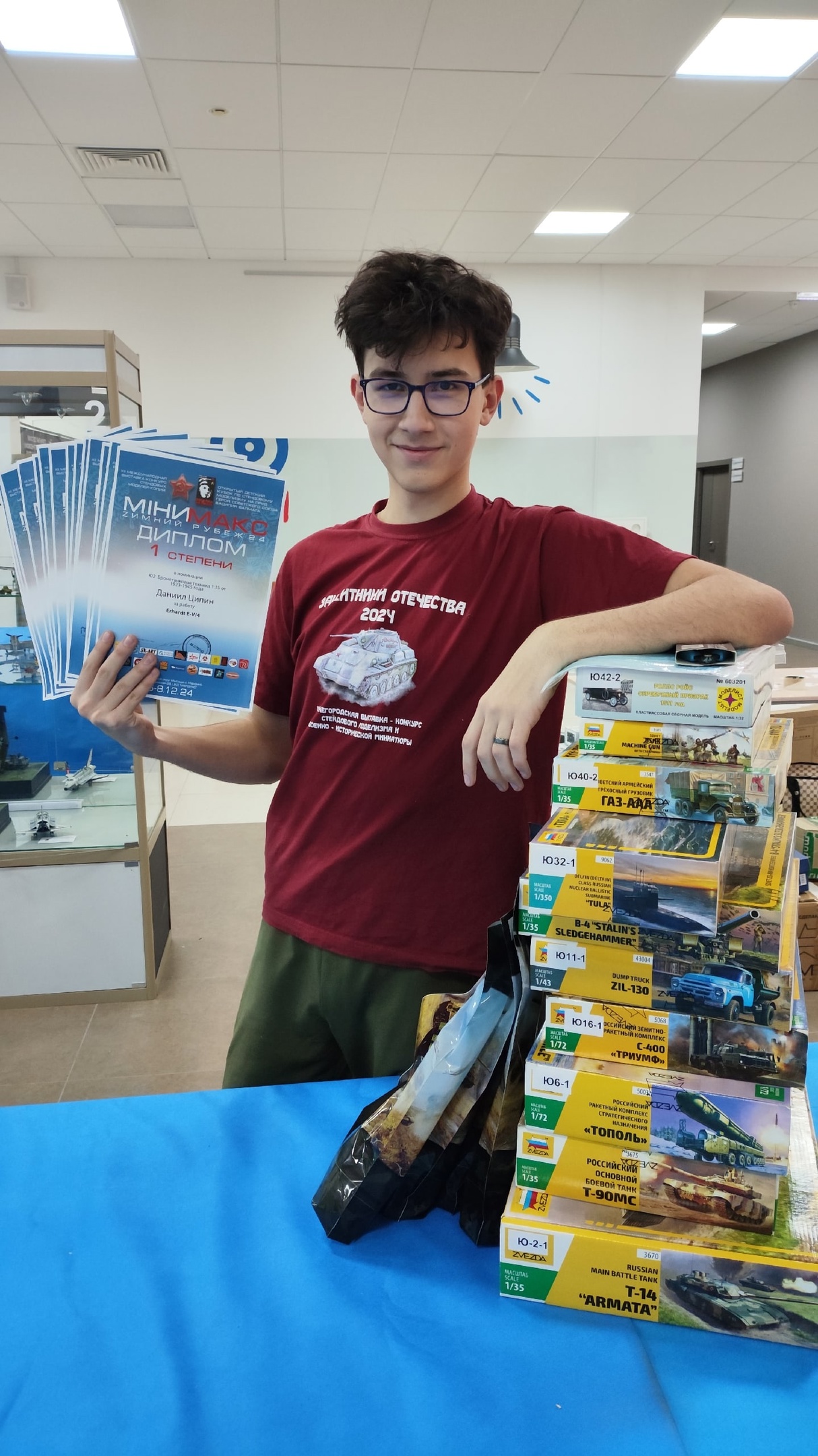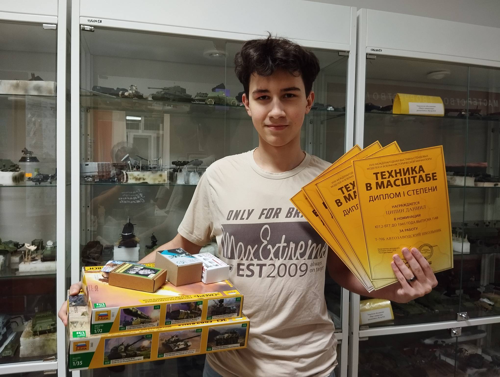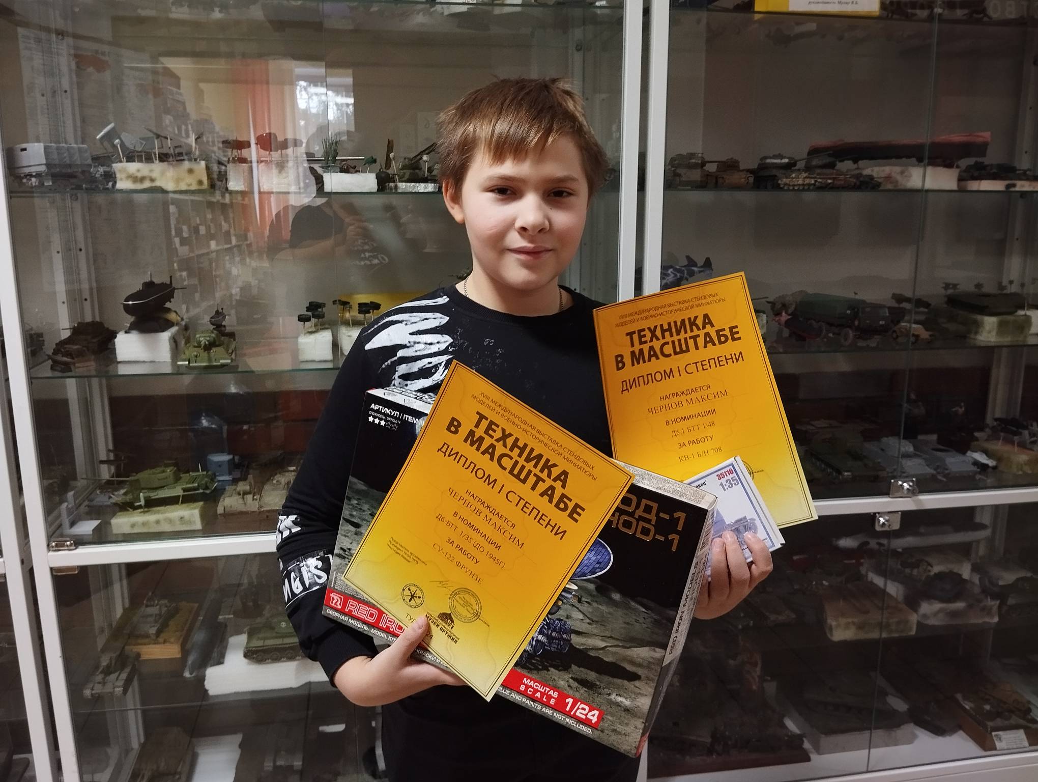 Во вторник занимались, вручил Мише две награды с Минимакса. Первое участие в конкурсе - 1 место в бронетехнике 1/48 и 2 место в автомобилях 1/43 и менее в категории 11 лет и младше. Отличный результат.