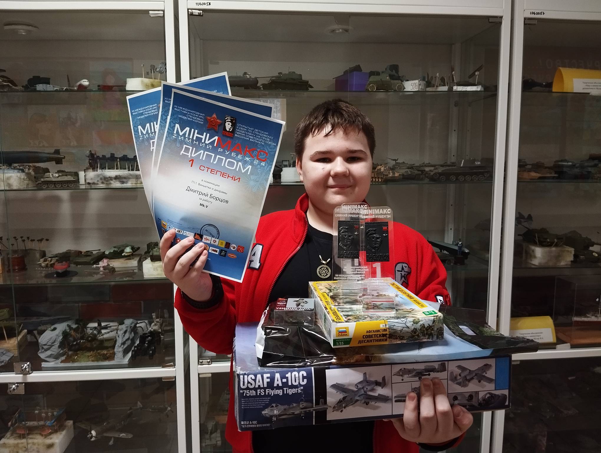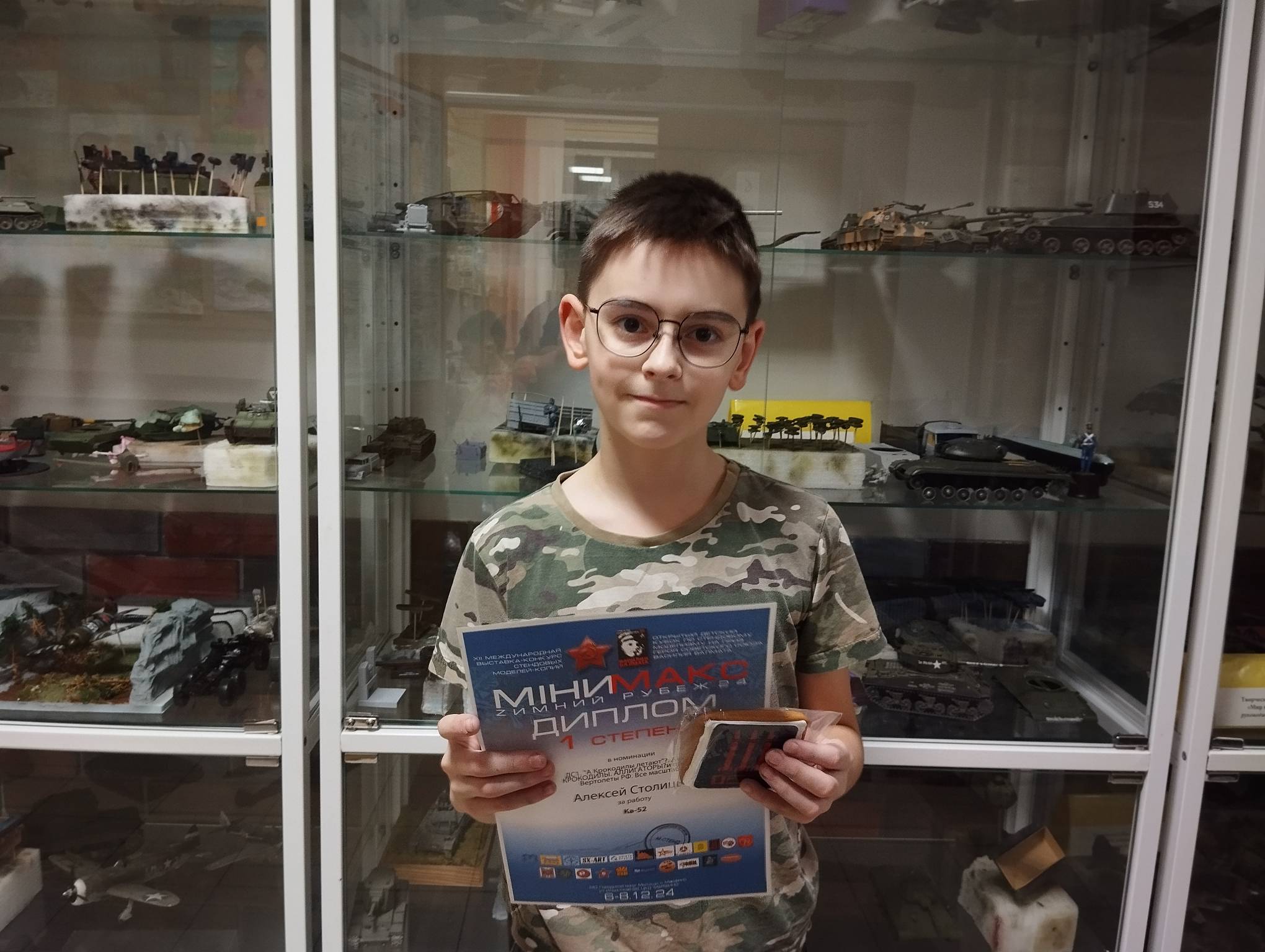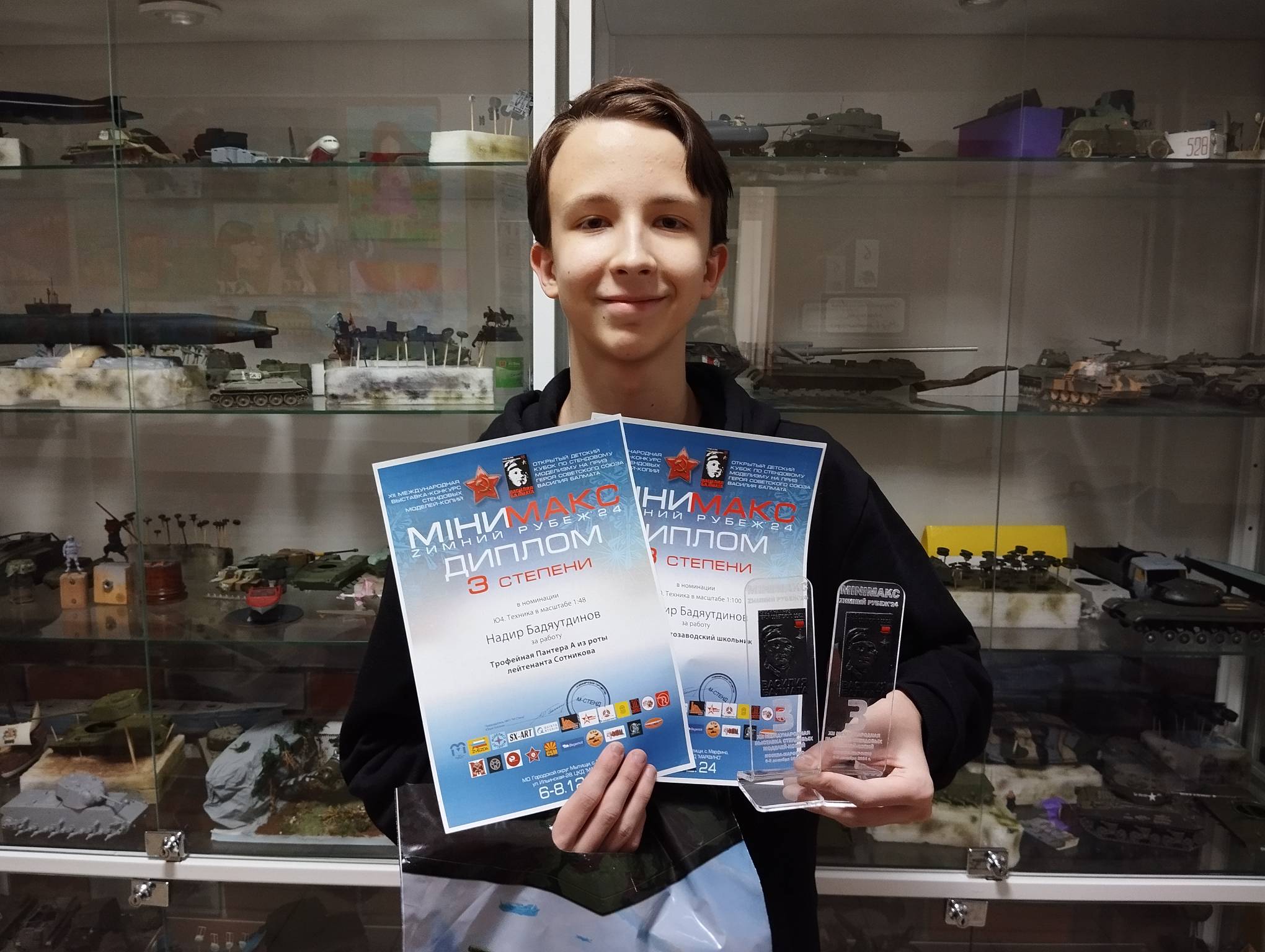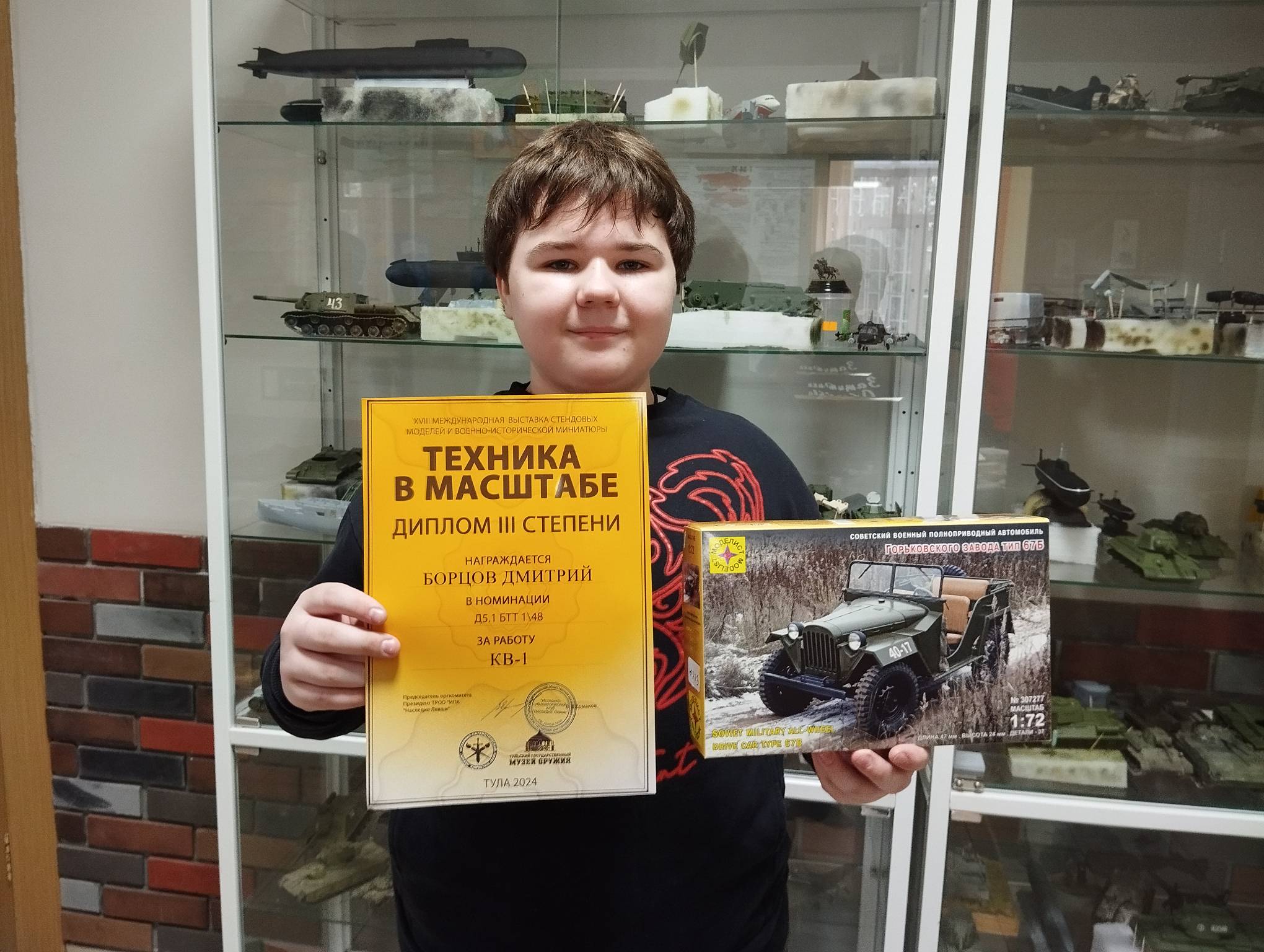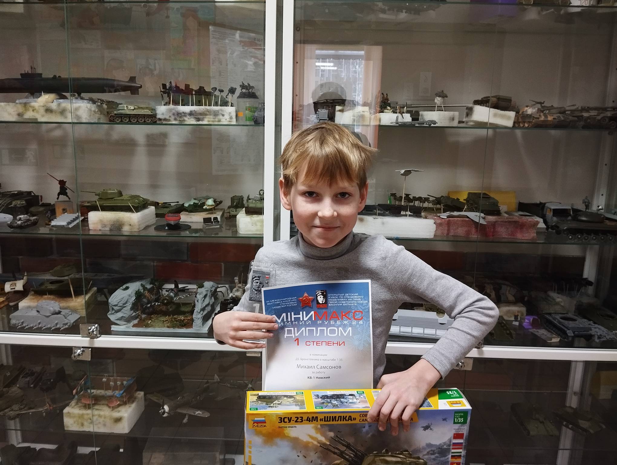 Во вторник занимались, вручил Мише две награды с Минимакса. Первое участие в конкурсе - 1 место в бронетехнике 1/48 и 2 место в автомобилях 1/43 и менее в категории 11 лет и младше. Отличный результат.