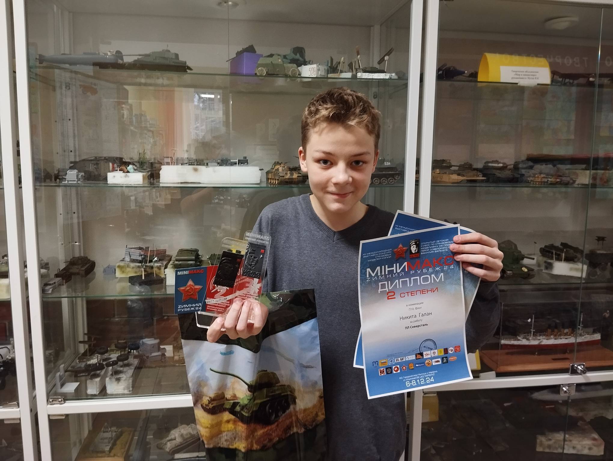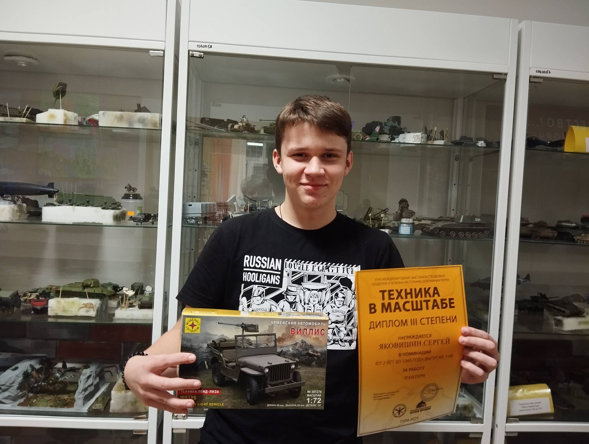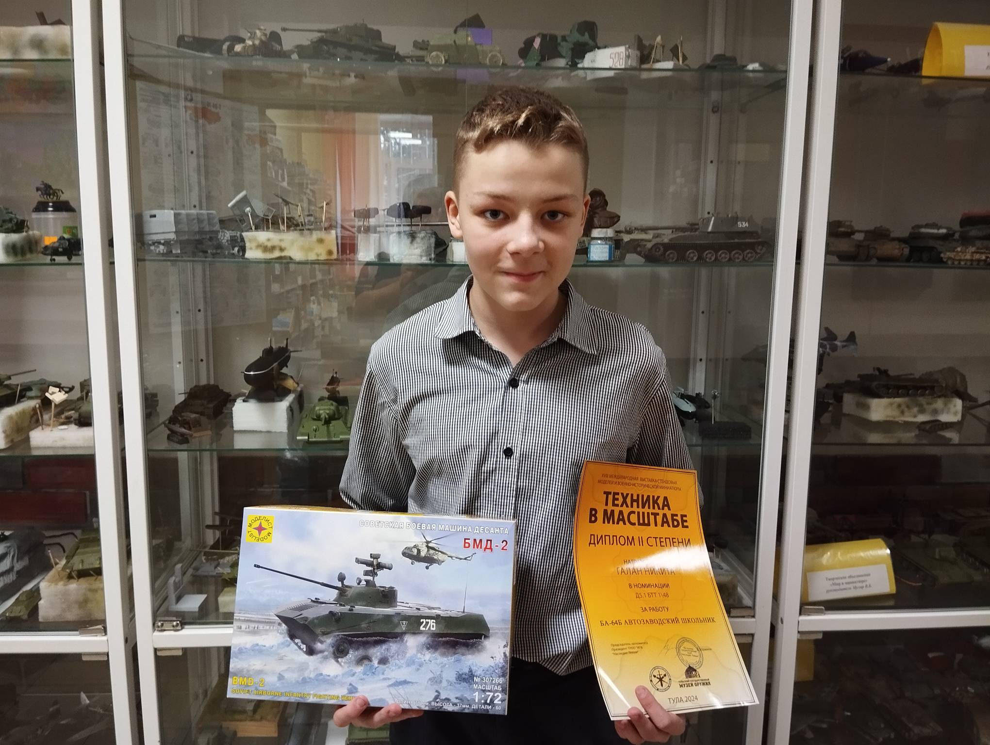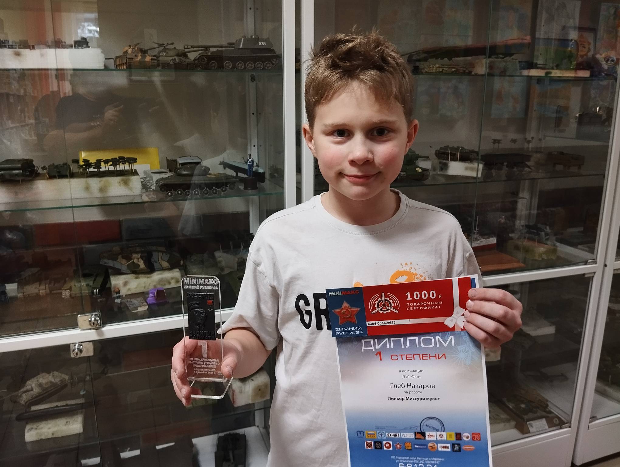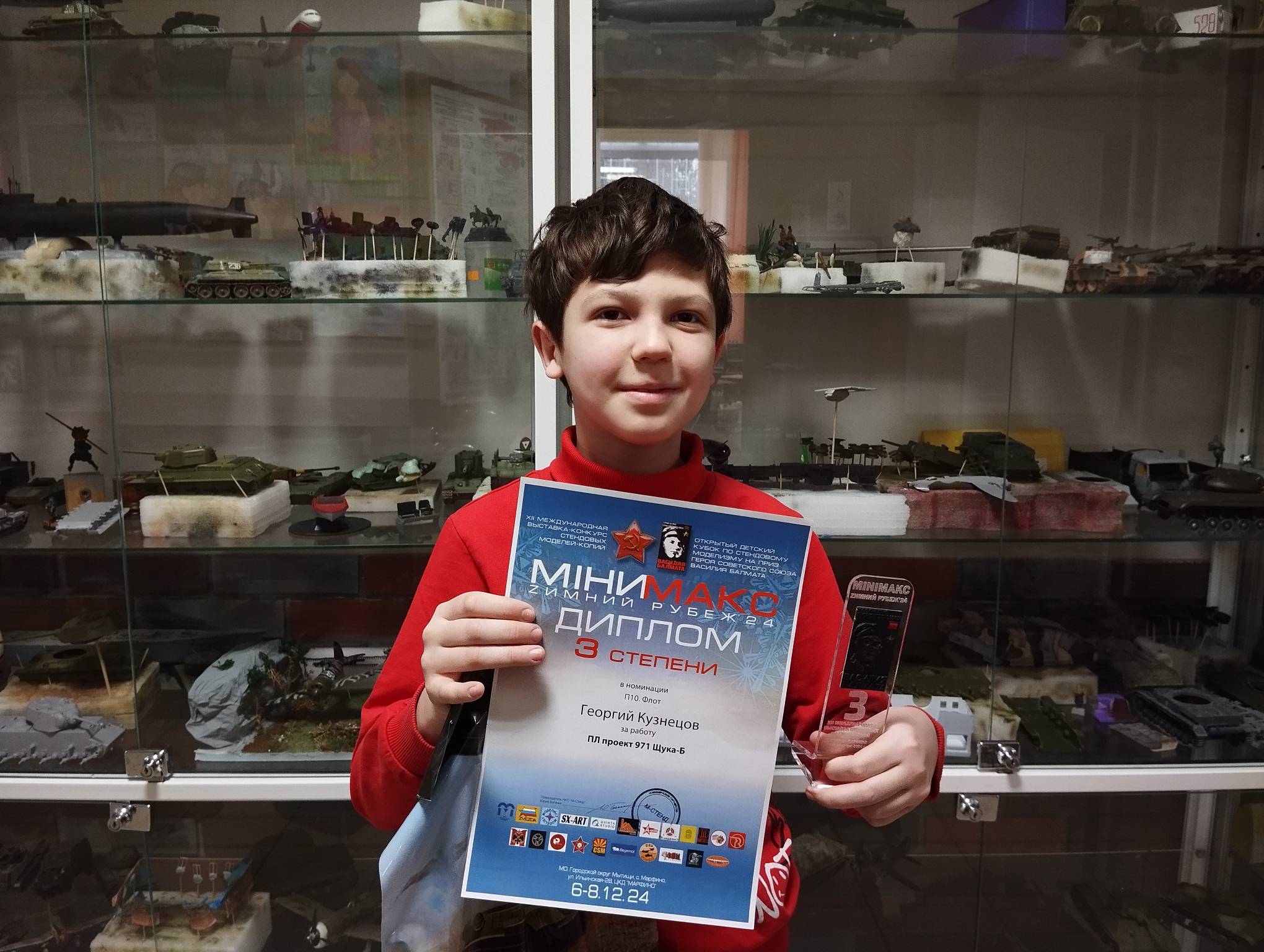 Во вторник занимались, вручил Мише две награды с Минимакса. Первое участие в конкурсе - 1 место в бронетехнике 1/48 и 2 место в автомобилях 1/43 и менее в категории 11 лет и младше. Отличный результат.