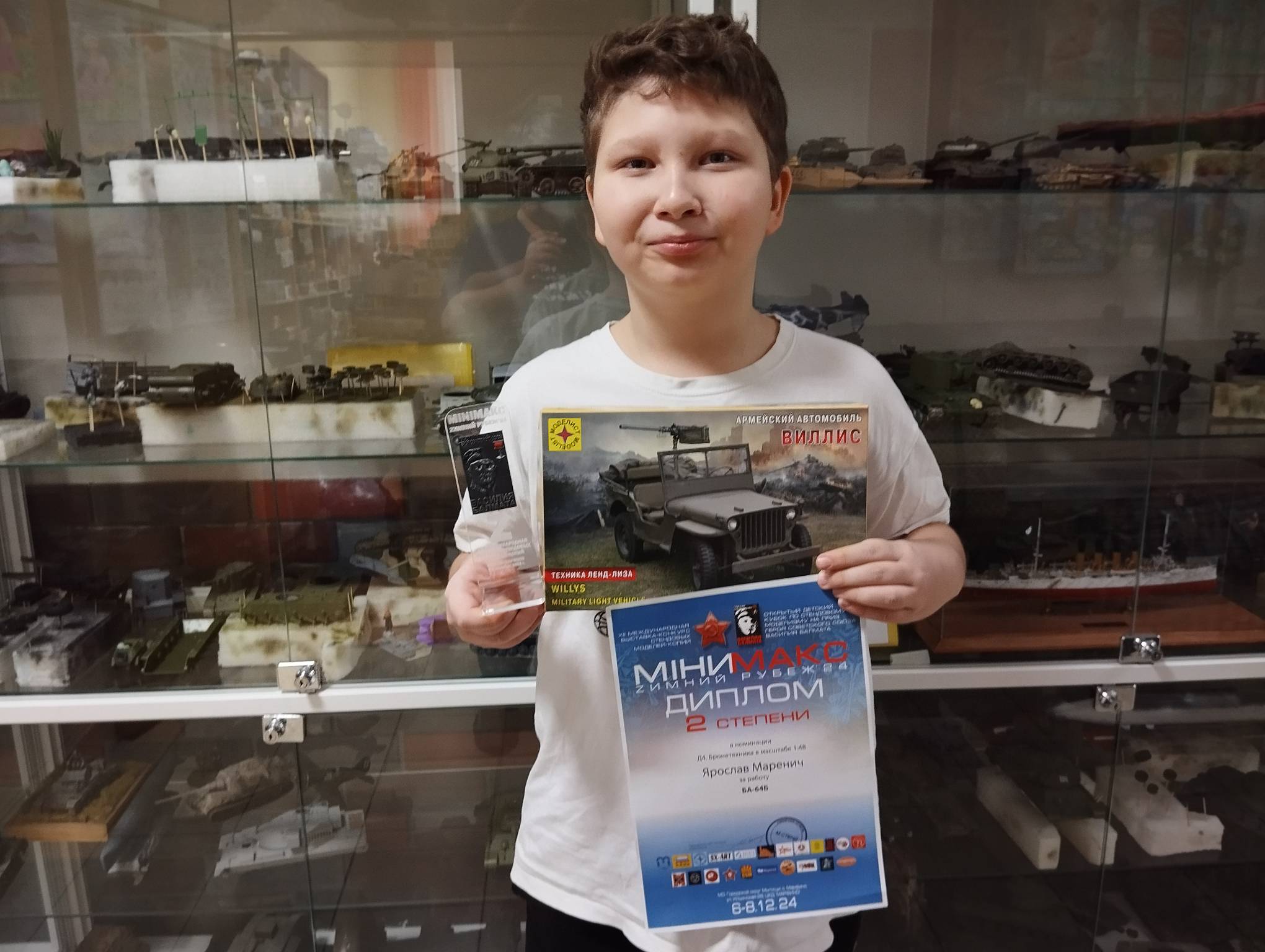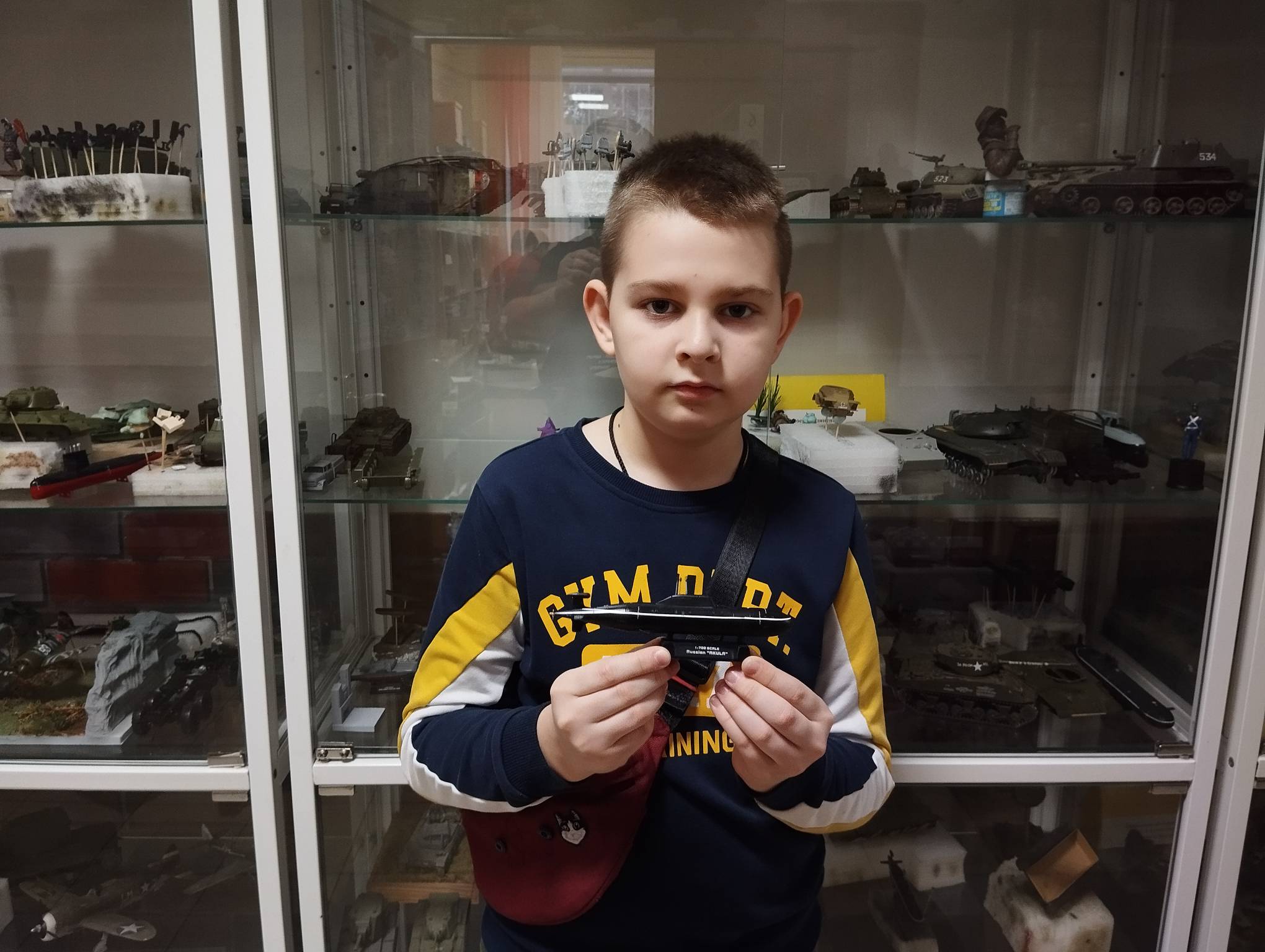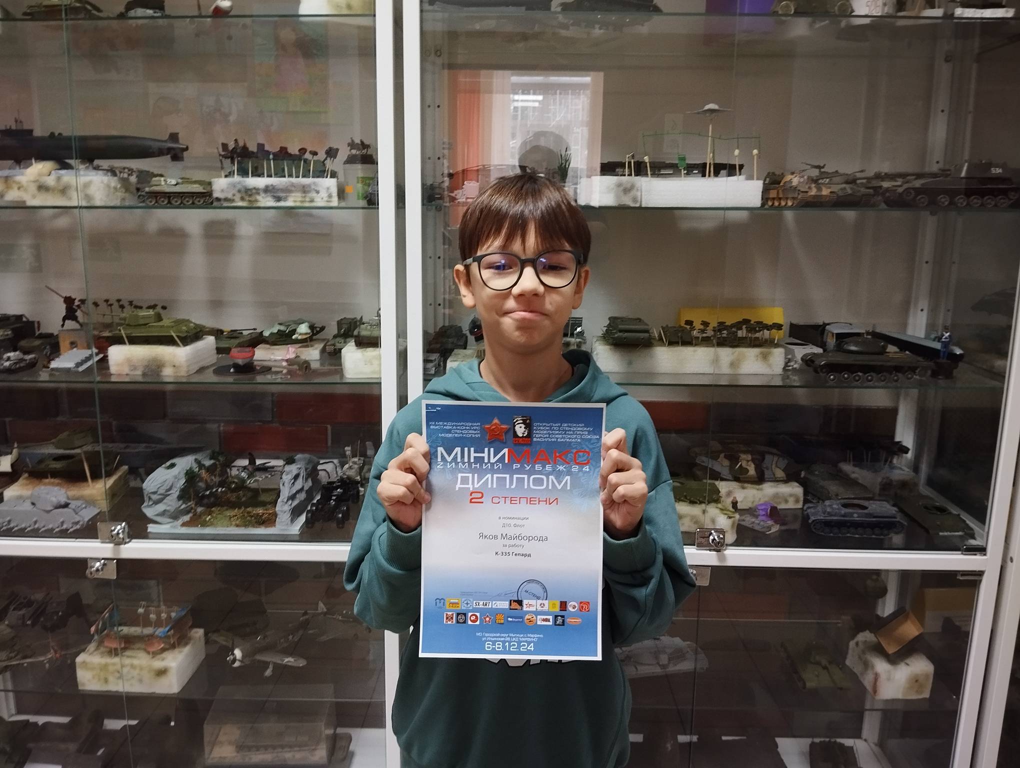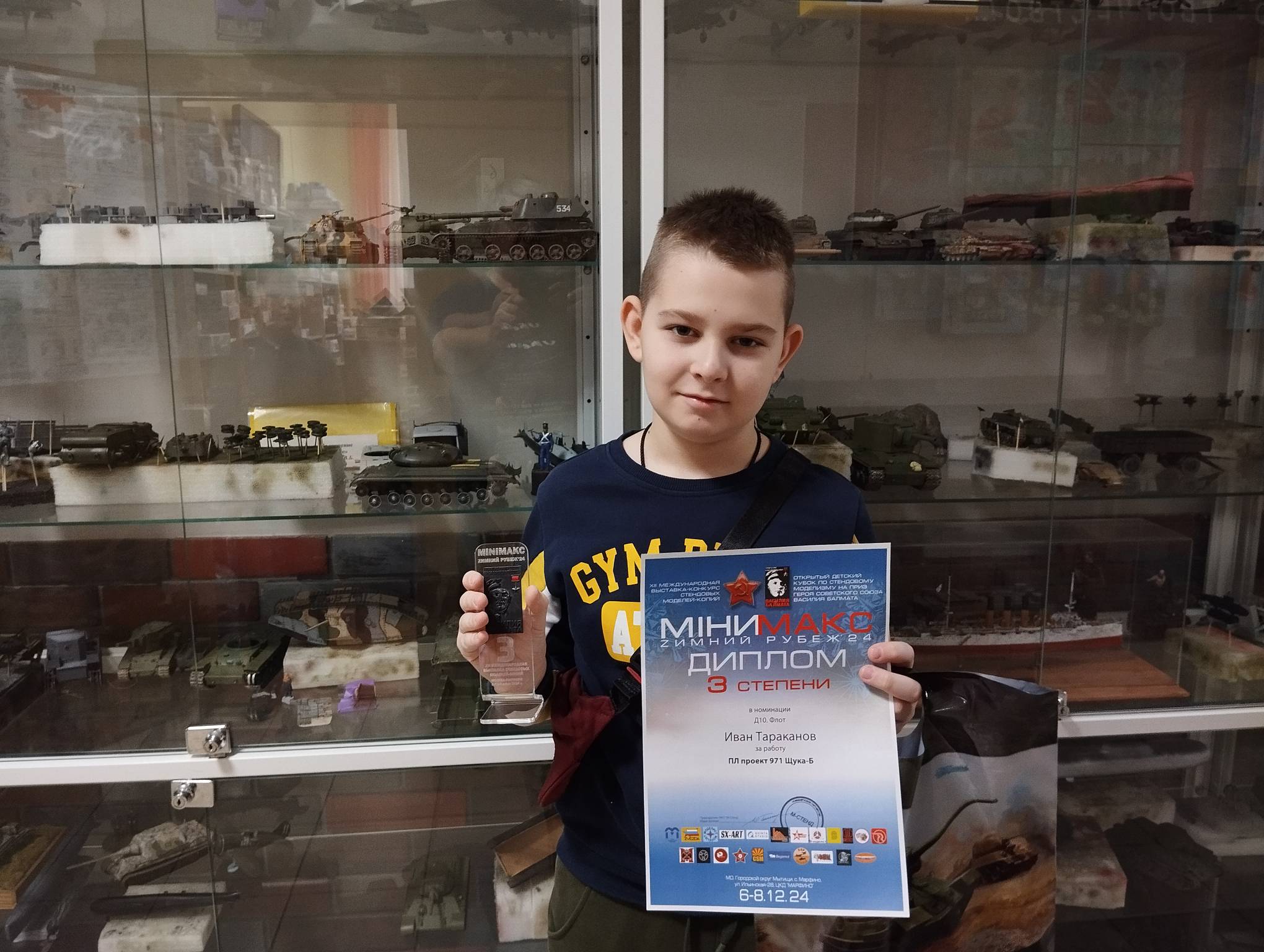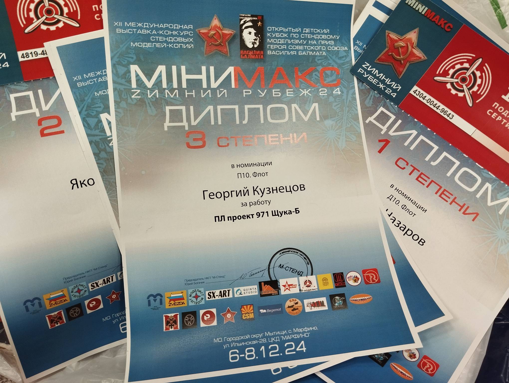 Во вторник занимались, вручил Мише две награды с Минимакса. Первое участие в конкурсе - 1 место в бронетехнике 1/48 и 2 место в автомобилях 1/43 и менее в категории 11 лет и младше. Отличный результат.