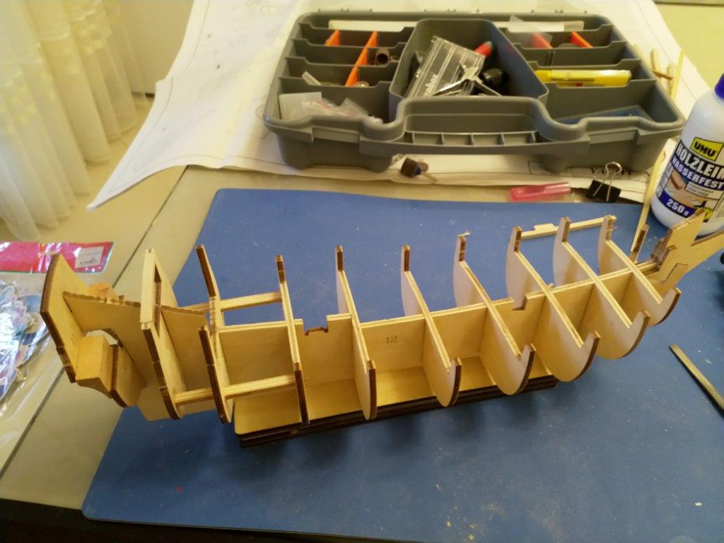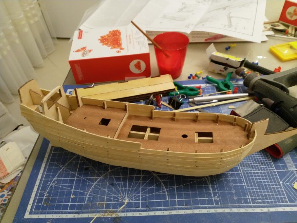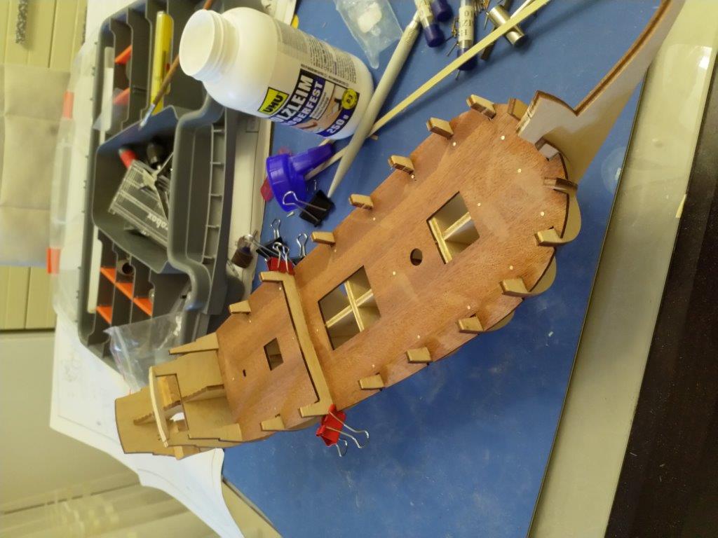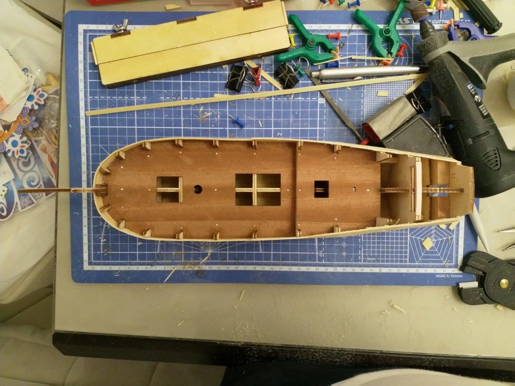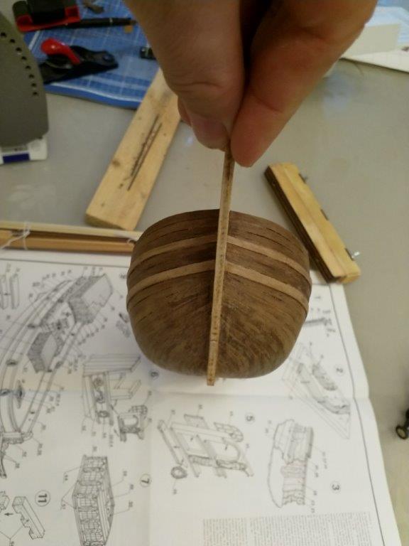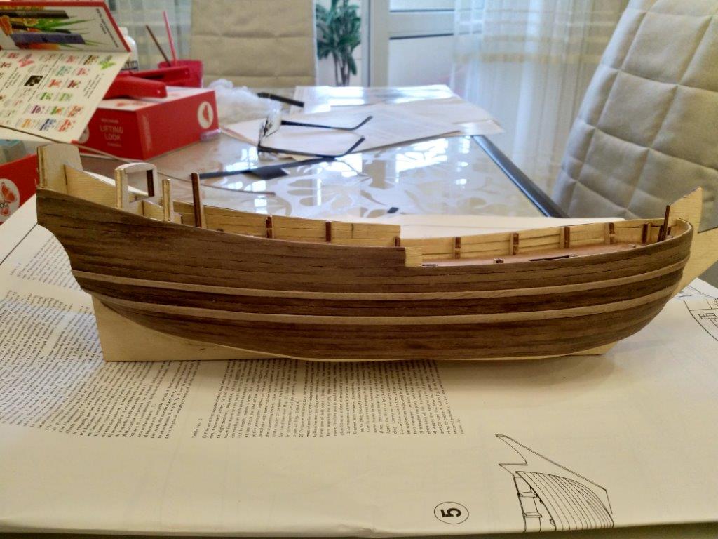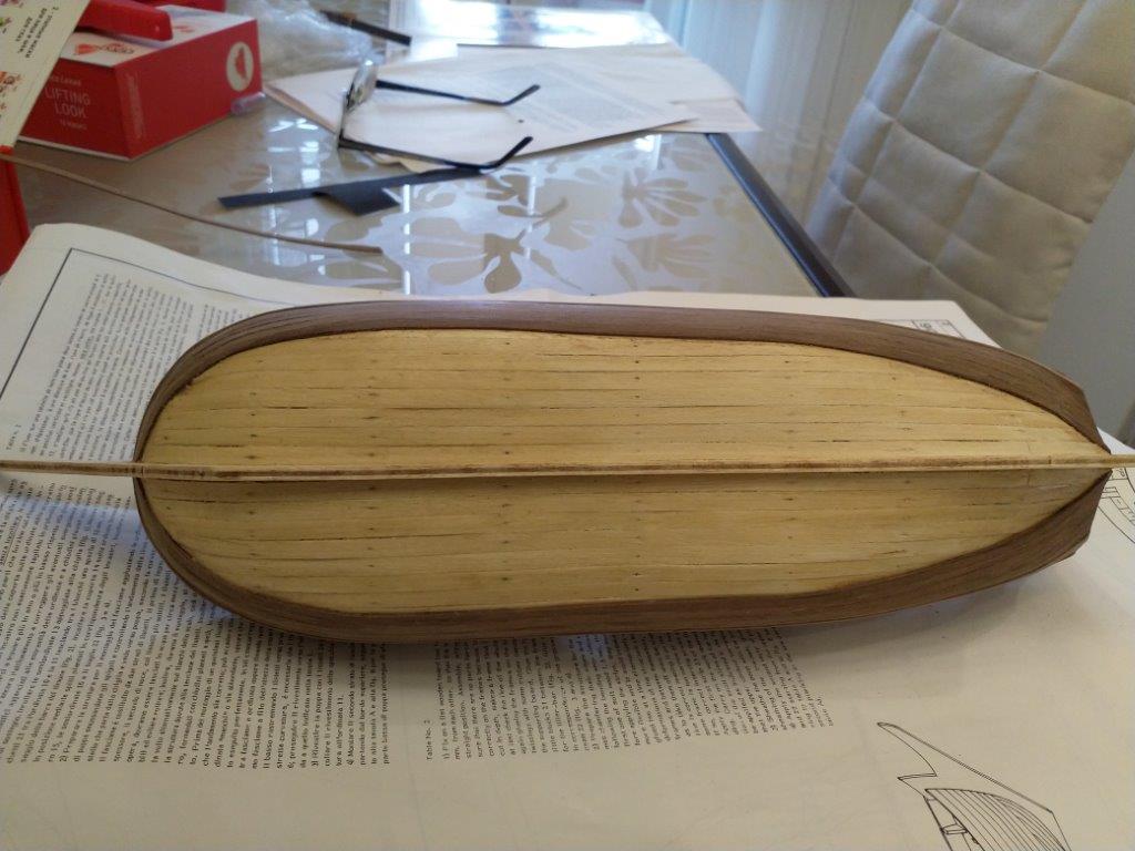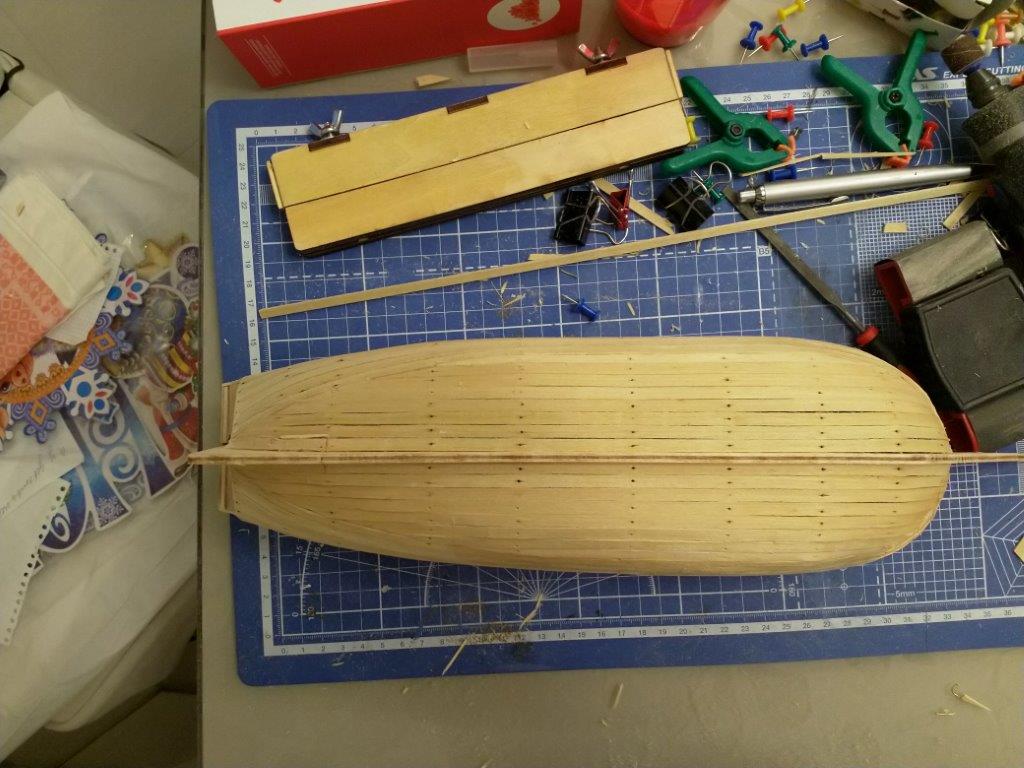 Зашкурил шпангоуты и начал облицовку черновыми рейками, ушло пару дней. Делал по инструкции по одной с каждой стороны, вроде не повело.
