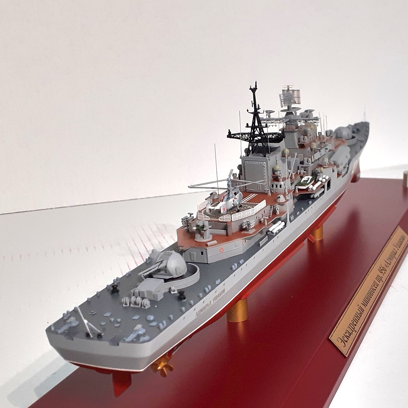 Забыли развернуть торпедные аппараты. На дымовой трубе нет лебёдок привода грузовых стрел. Зачем-то приклеили в самом низу трубы площадки для установки стрел - в жизни они метрах в 5 от палубы. "Струну" сделать и установить не забудьте.
