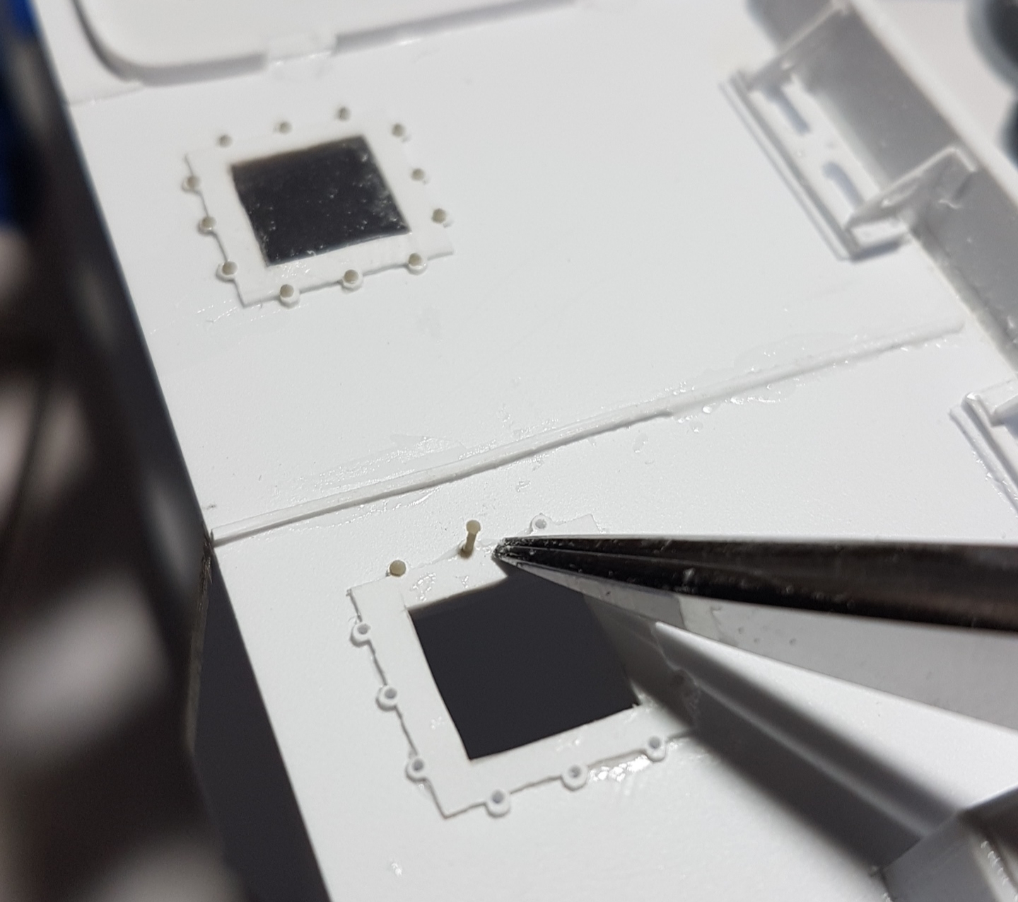 и дальше имитация сварного шва. Сначало полоска клеится, потом шкуркой немного стачиваем толщину, капаем клеем, чтобы полоска стала мягче и наносим ножем насечки. Потом я еще раз прошелся шкуркой.
