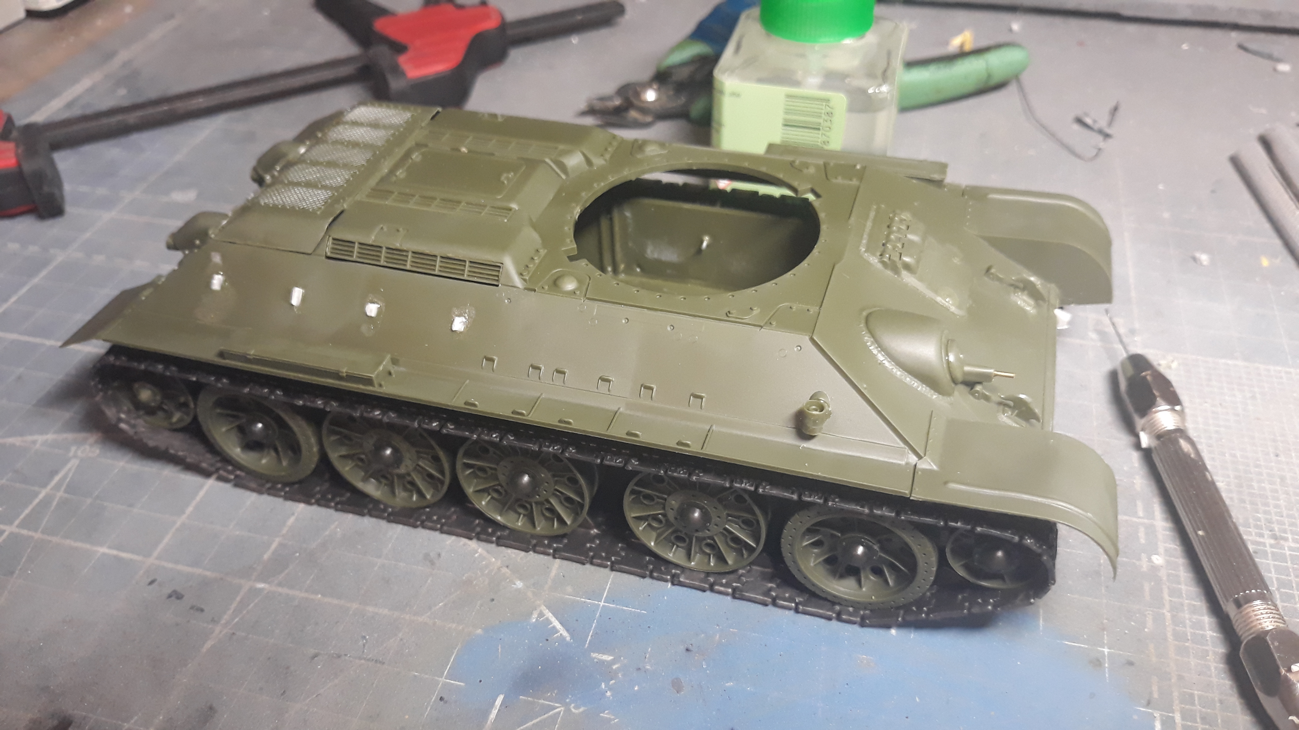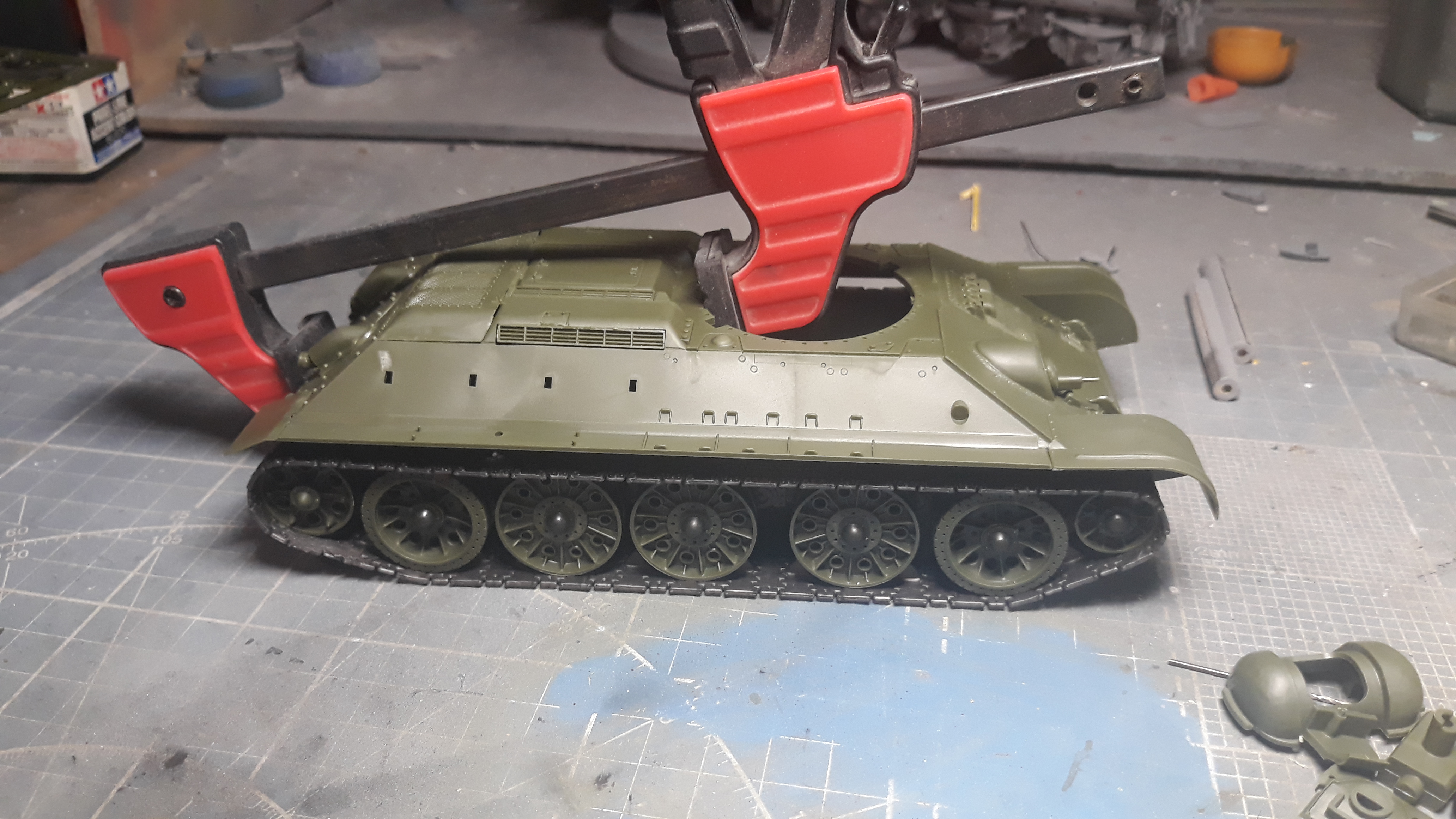 Обул танк и собрал корпус, пришлось стянуть струбциной чтобы убрать щель в корме между ванной и верхом.