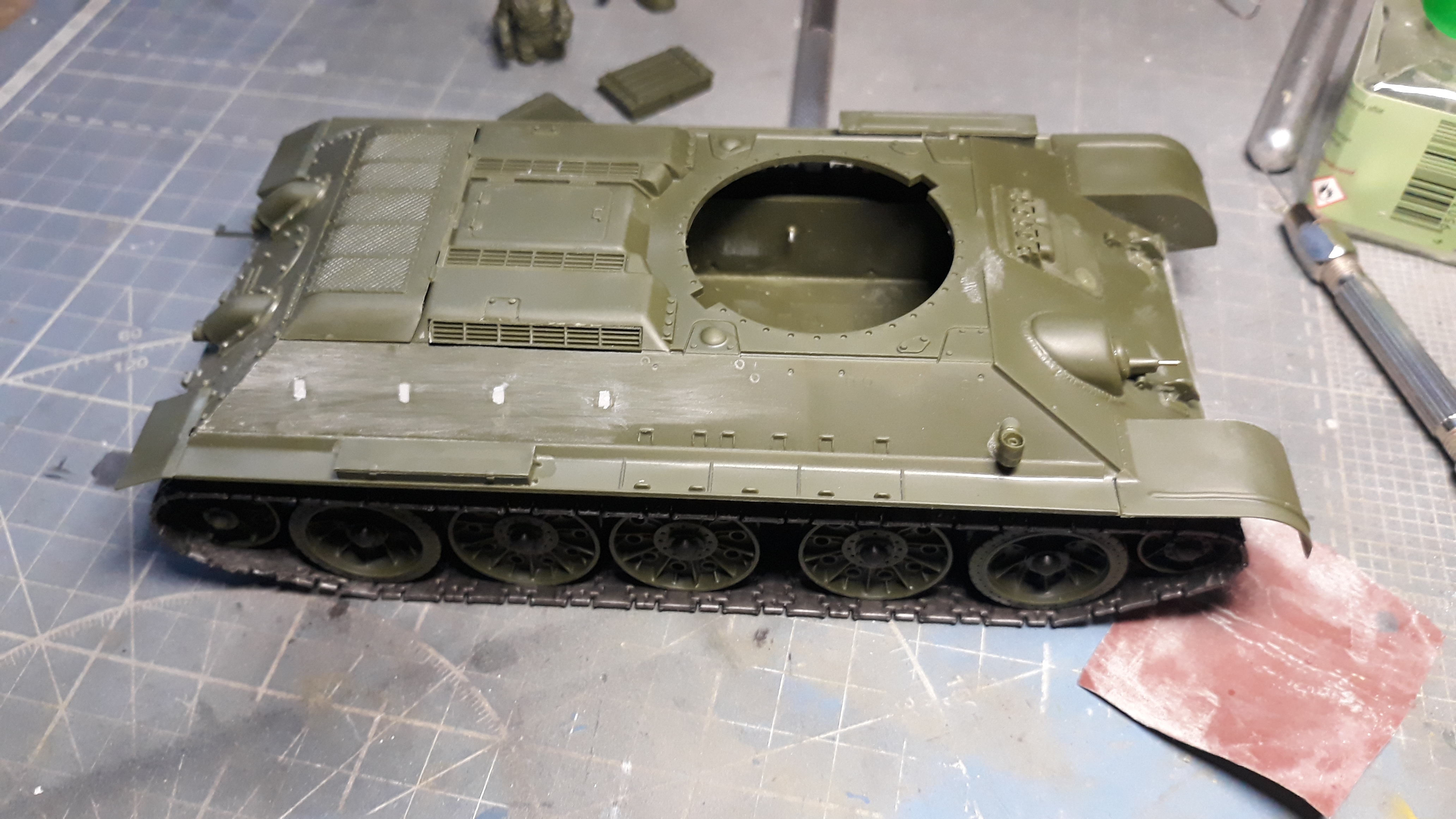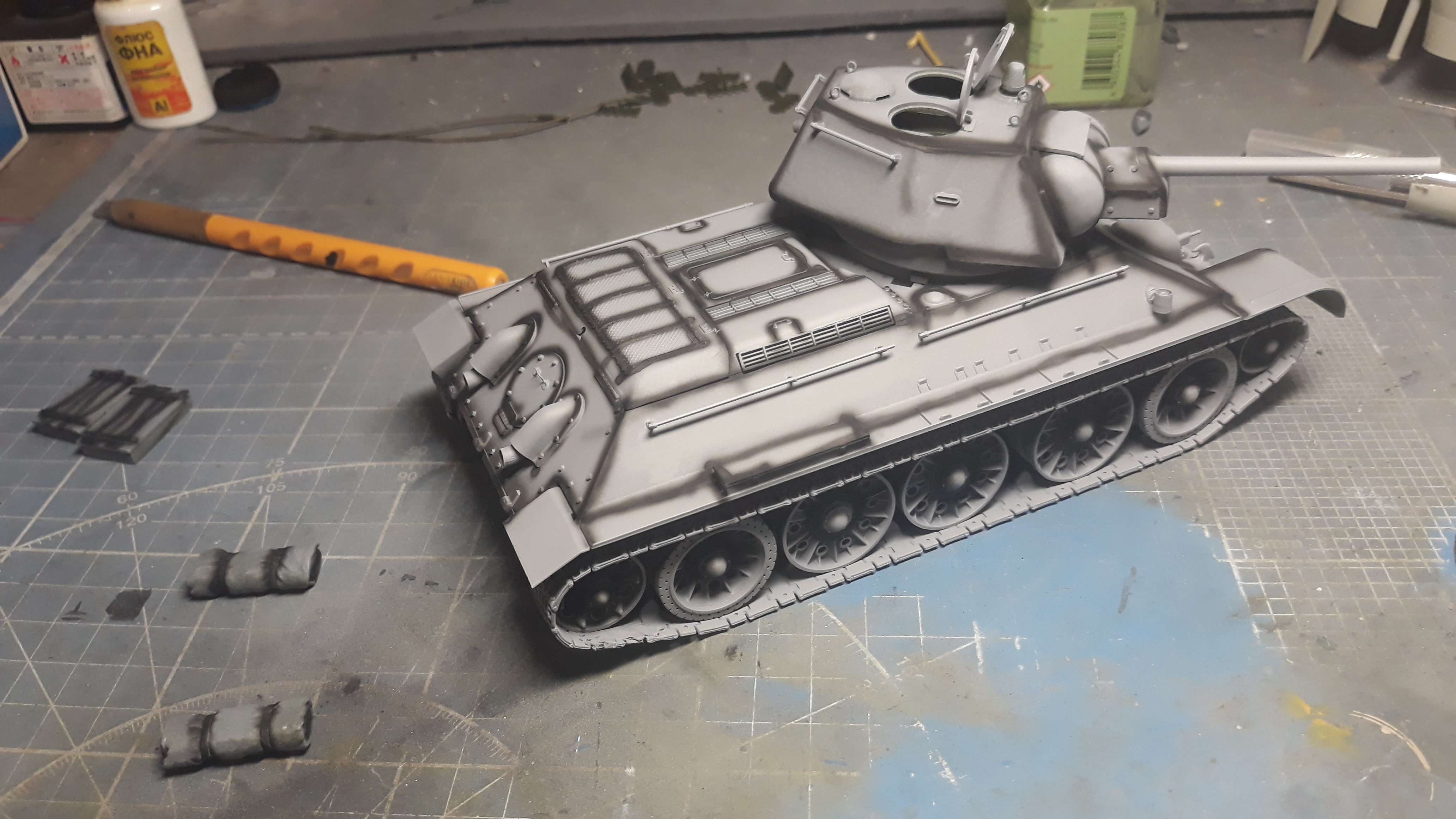 Ствол пулемета заменил на трубочку и заклеил дырки под доп баки кусками литника дабы не тратить много шпакли. Танк будет без баков.