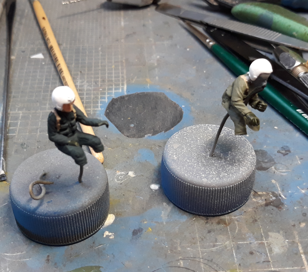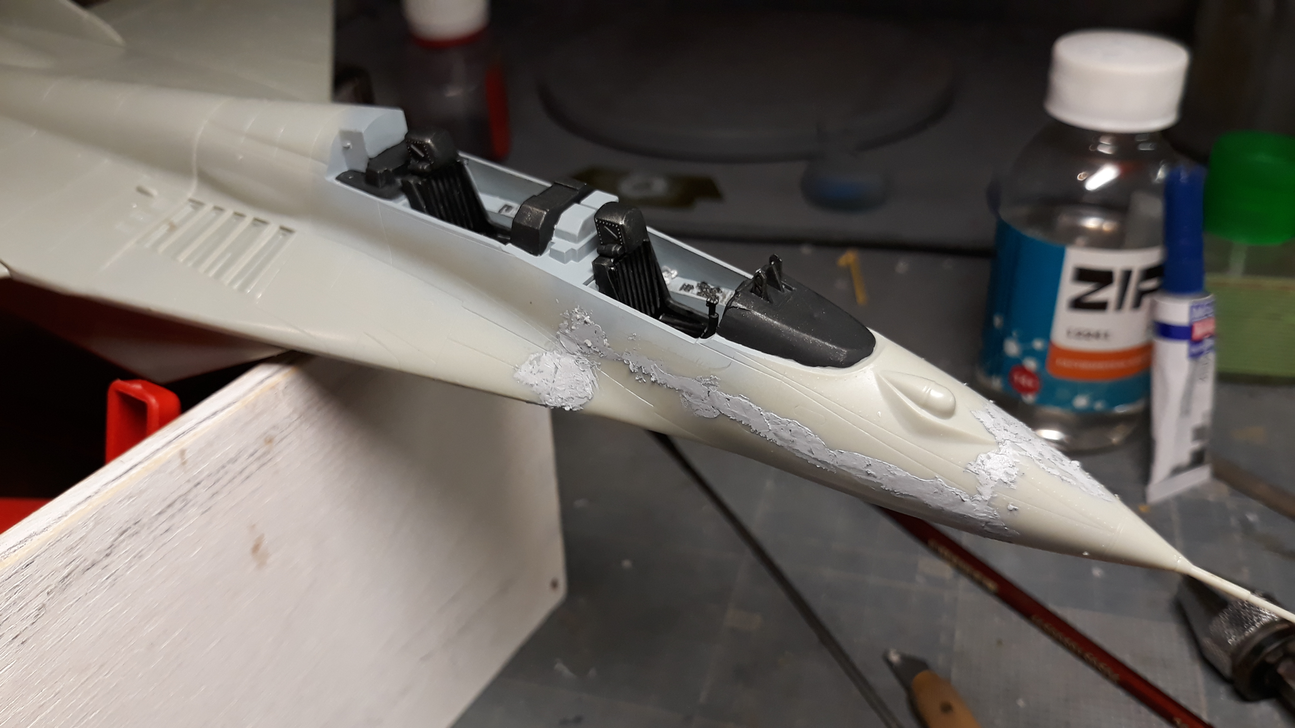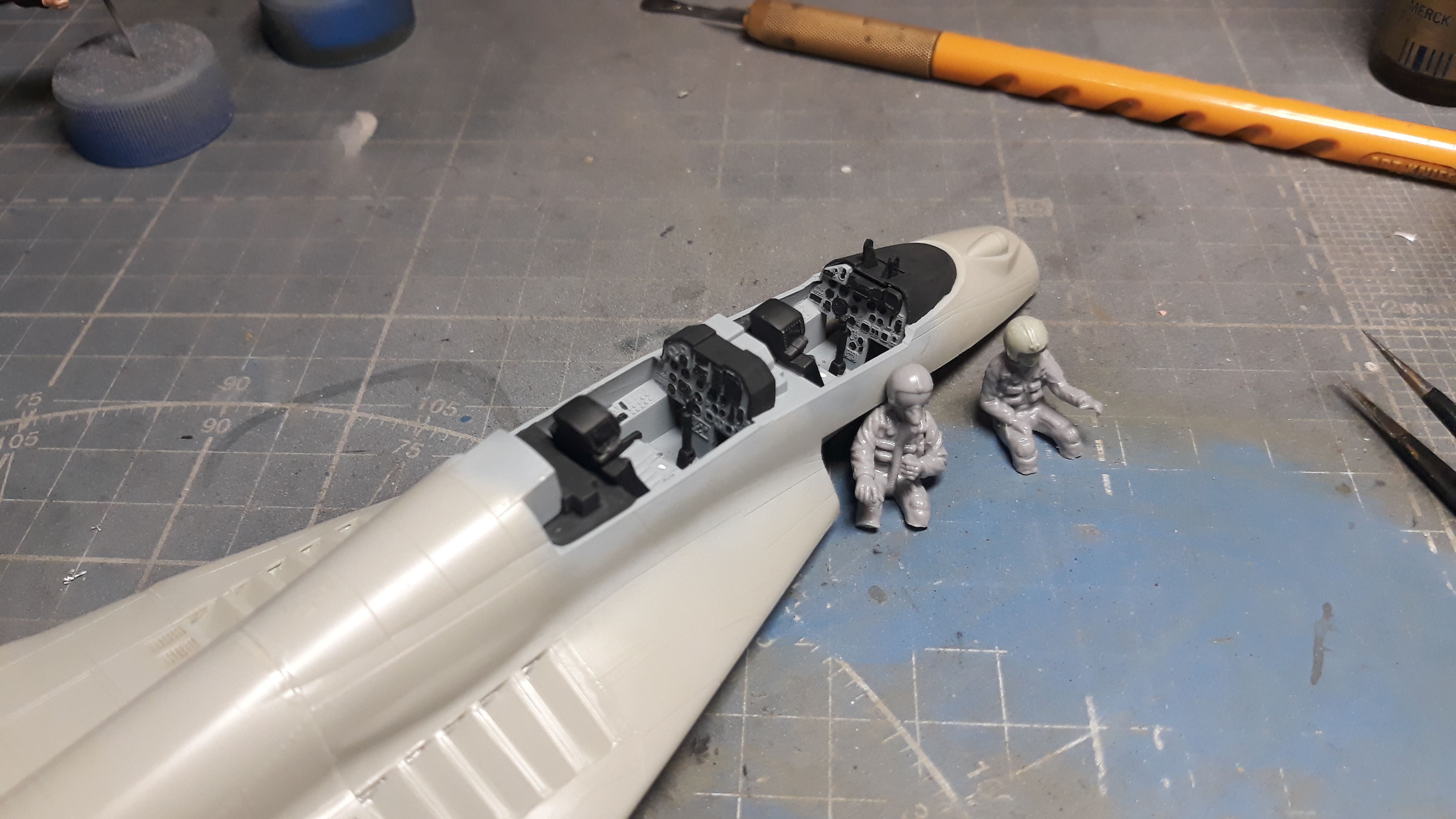 Для зрелещьности добавил пару пилотов пришлось их правда покалечить немного. Огружать носовую часть решил поболее поскольку когда собирал простой 29тый то огрузки носового обтекателя оказалось недостаточно и прилось догружать уже готовую модель через просверленное отверстие и заливая туда для скрепления супер клей который сабака протек в кабину и залил весь кокпит вместе с пилотом сделать чтото было невозможно только полностью менять всю кабину с фонарем так что оставил как есть, позже покажу фото.