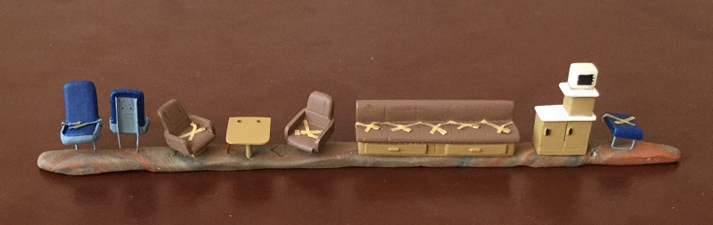 У 5 МИ-8П компании, VIP салоны одинакового типа. А вот кожа на креслах, была бежевого и коричневого цвета. Я решил отступить от правды и покрасить мебель в коричневый цвет. На синих сидениях пилотов и бортпроводника, должны быть белые накидки-салфетки. Их решил не обозначать.