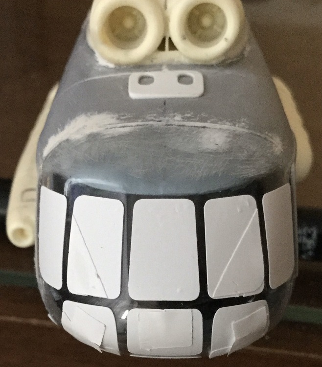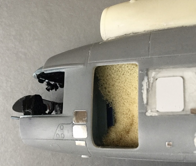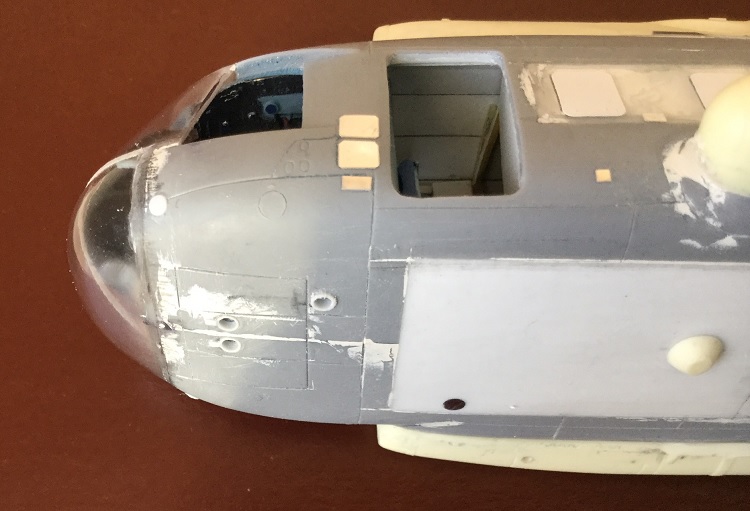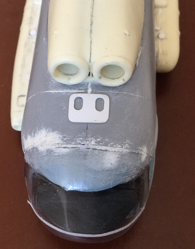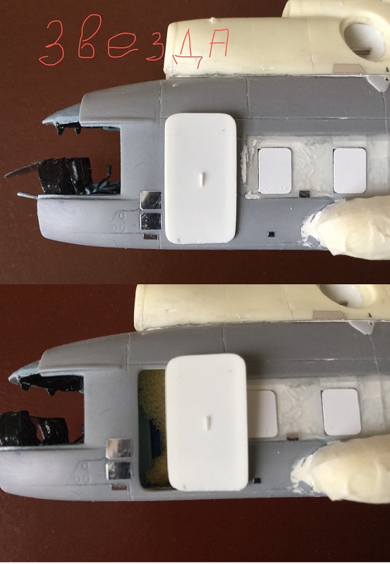 Как оказалось, из-за проблем с носовой частью Звезды, её входная дверь тоже врет и она меньше по размеру. Подрезать дверной проём под смоляную дверь мне уже поздно, да и вряд ли получилось бы. Кабина у Звезды посажена низко. Дверь-трап будет выше верхних сторон блистеров, что не совсем правильно. Поэтому, решил сделать копию лесенки и подогнать её к родной Звездинской двери грузового салона. Все же чуть-чуть её нарастил, зашпатлевал окошко.