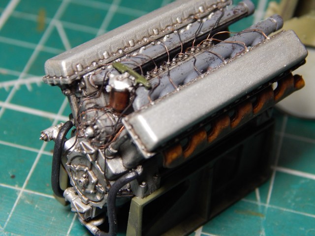 Цвета такие будут: картер, блоки цилндров, головки- сталь/дюраль, впуск. Коллекторы- серый, крышки клапанов- коричневй, трубки- желтый, кастрюля- черный.