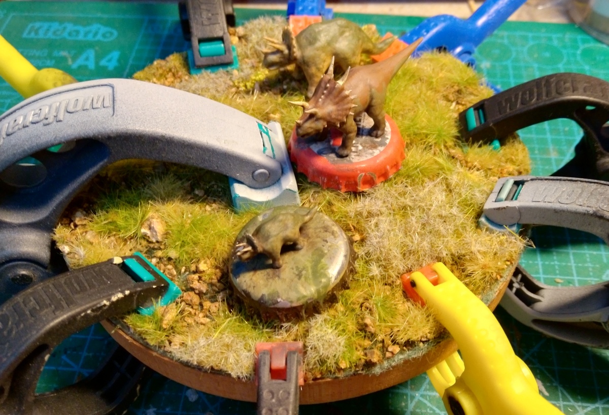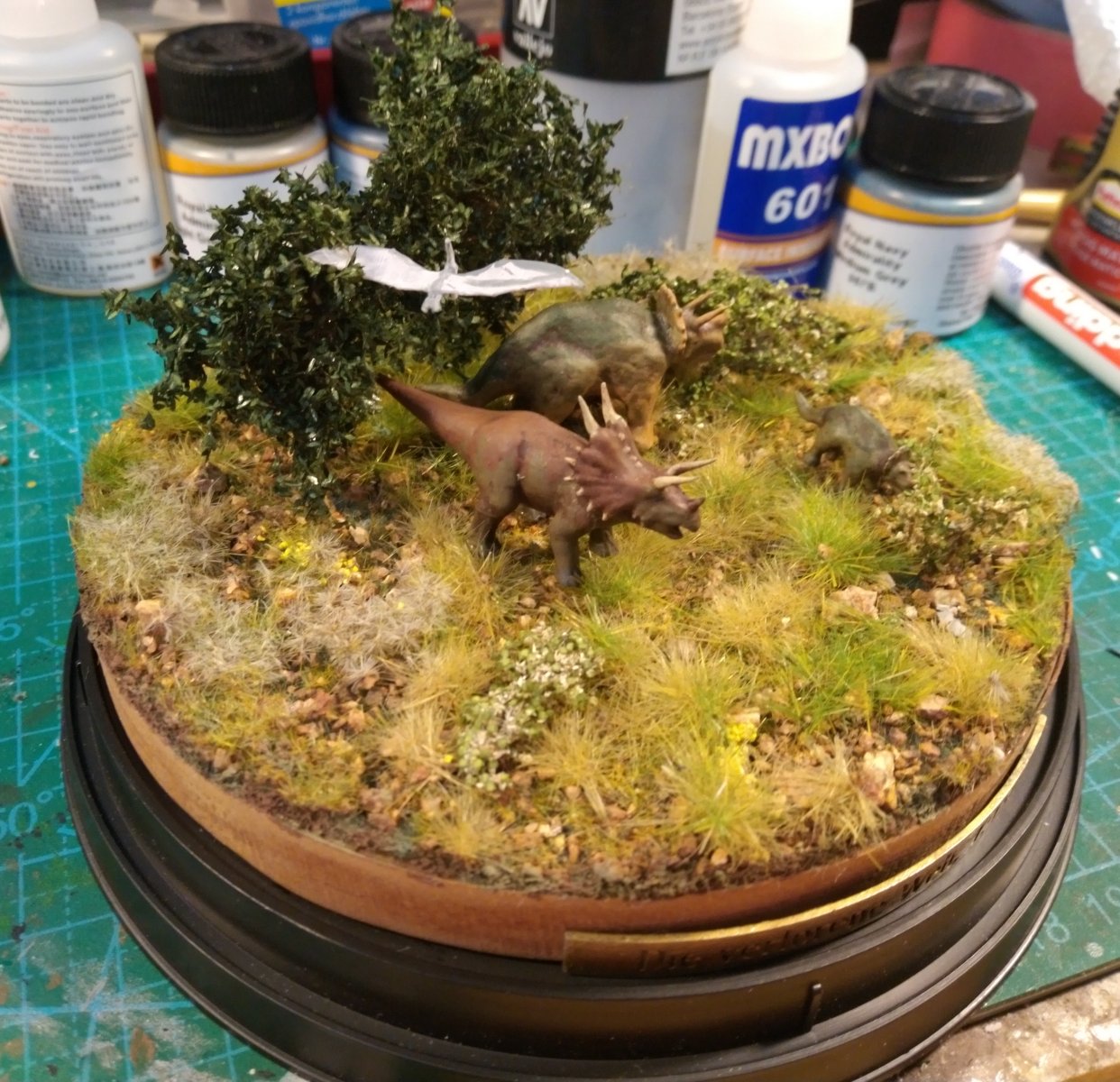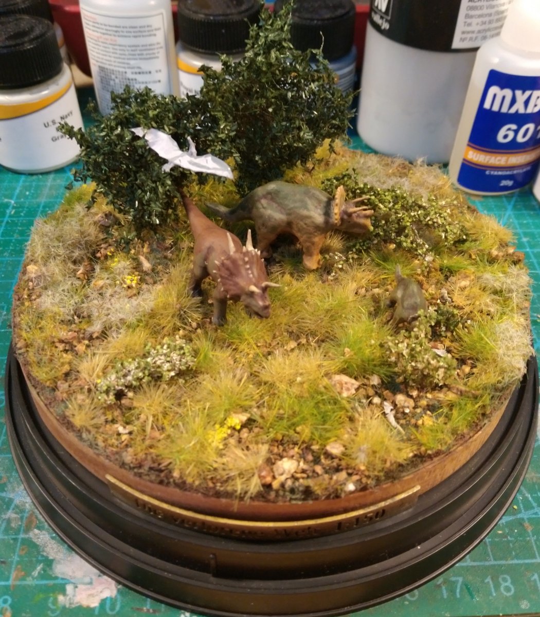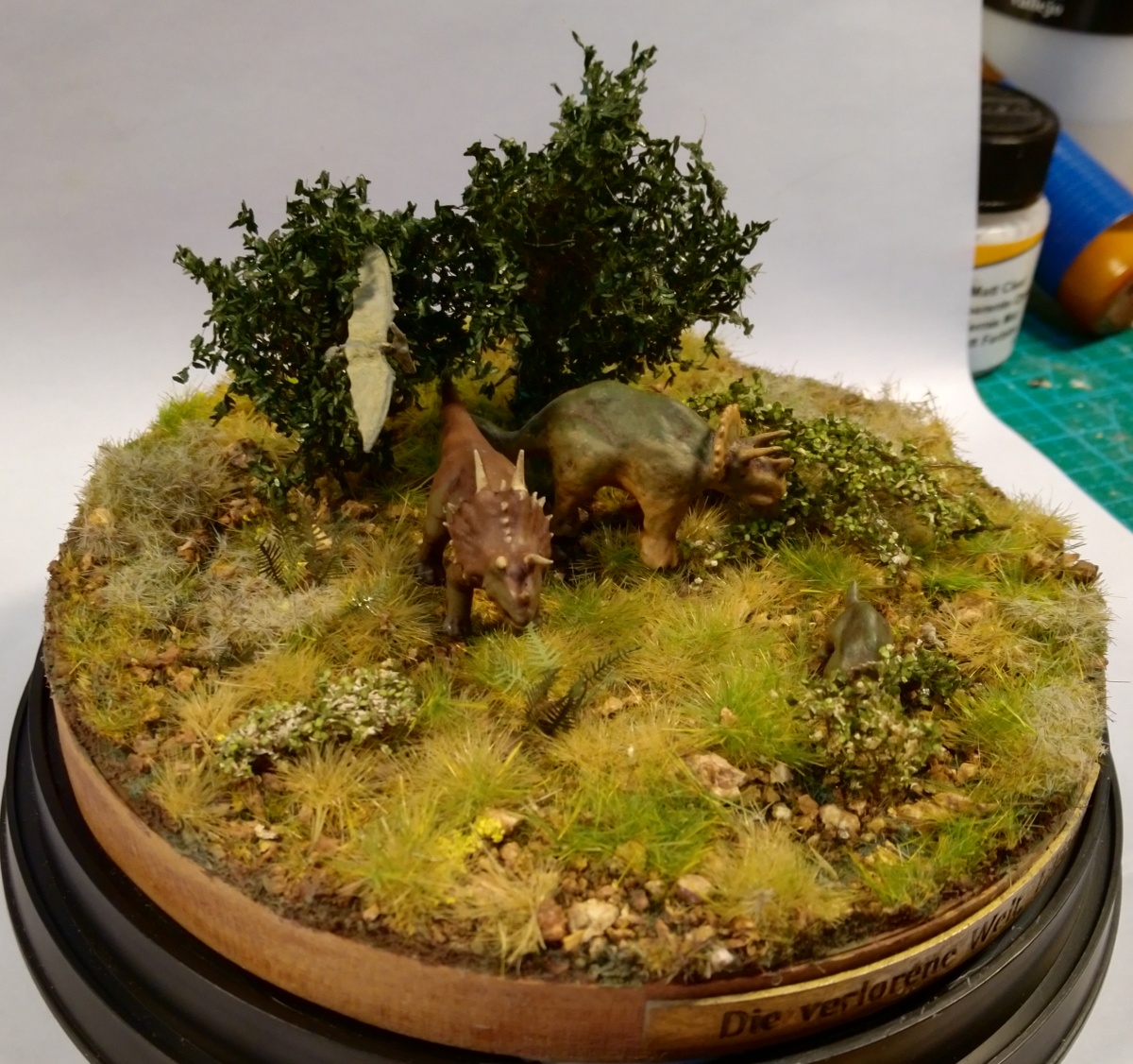 Деревья и кусты от МБР высажены, табличка напечатана на 3д принтере. Также напечатан птеранодон, загрунтован и в процессе окраски.