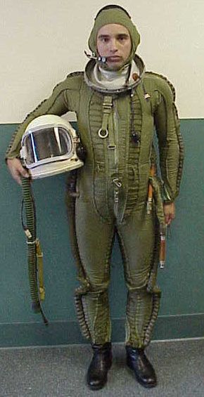 На Ваших фото ВКК (был зелёно-серого цвета), а на нижнем снимке левый персонаж в ВКК (цвет не тот) и по середине лётчик в ВВК (высотно-вентилируемый костюм) - этот точно серого цвета (у меня где-то в шкафу заныкан на память). Шланг у ГШ правой щеке. Кстати, ВКК с ГШ на МиГ-21 использовались только при задании "полёт на практический потолок". Где-то в 80-х годах некоторые инструктора из Кубы и Ирака привозили буржуйские комбезы - похожий на Вашего смоляного лётчика. У тех как раз на щиколотках карманы были. С уважением, Герман.