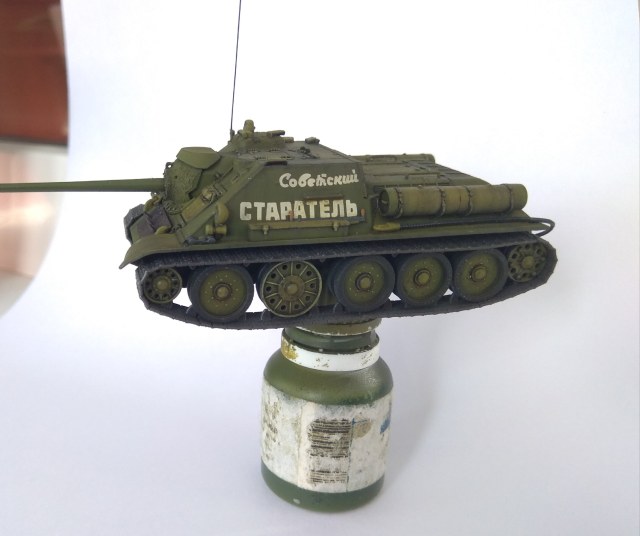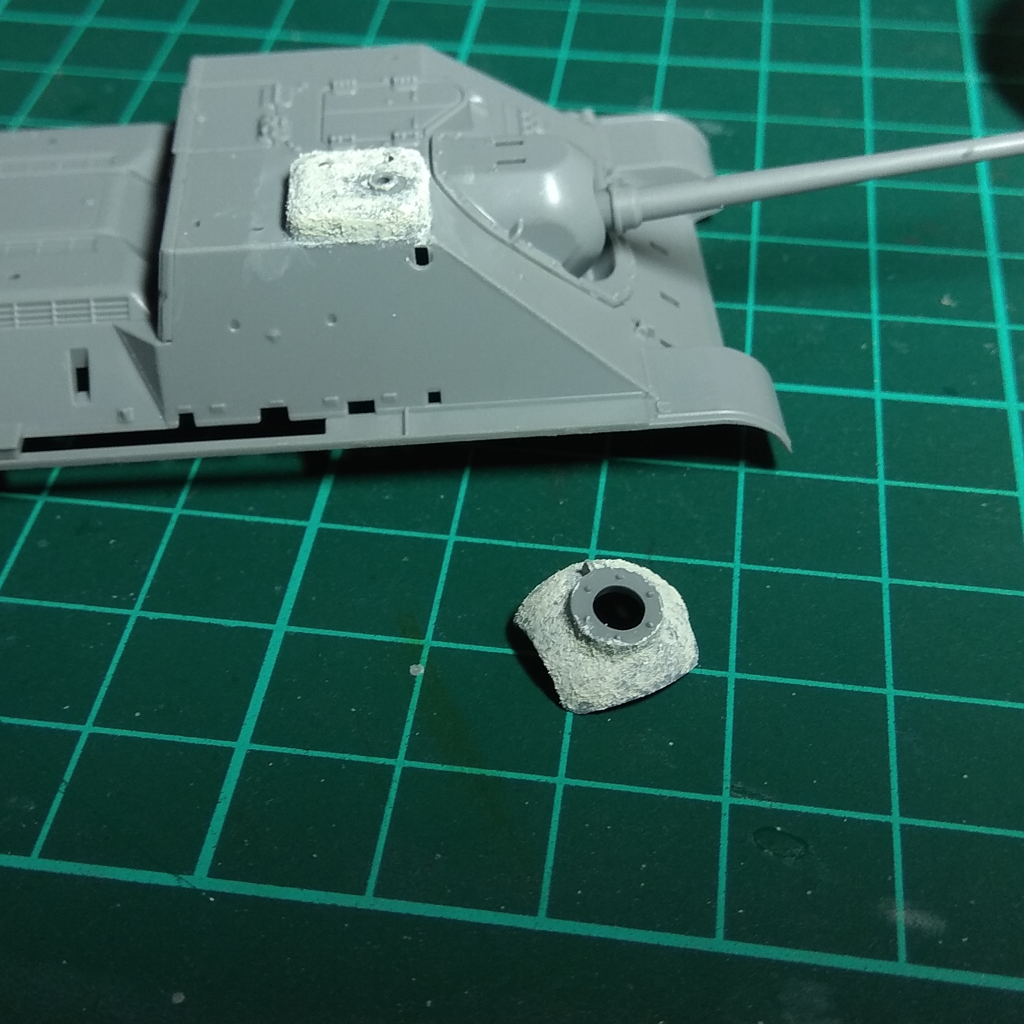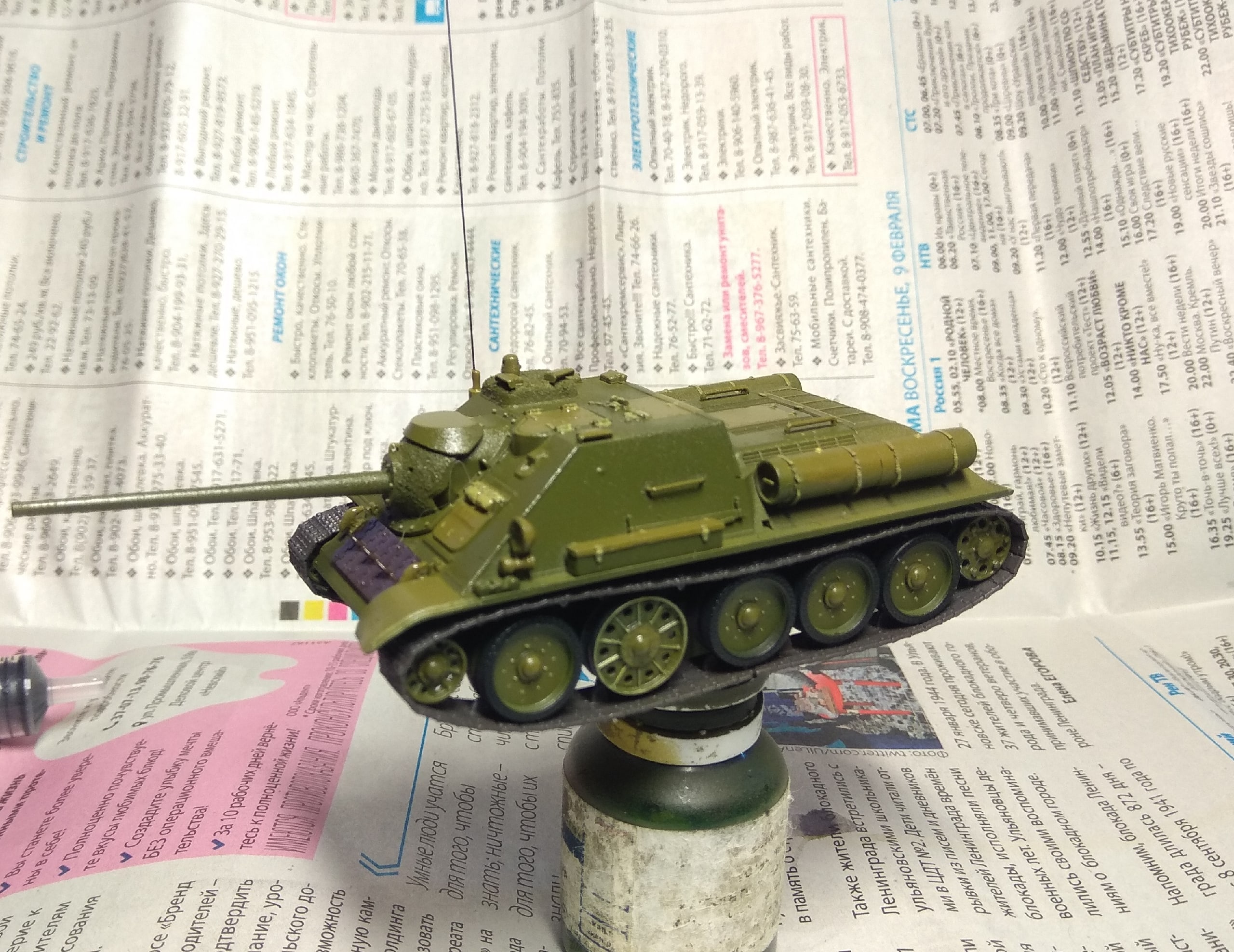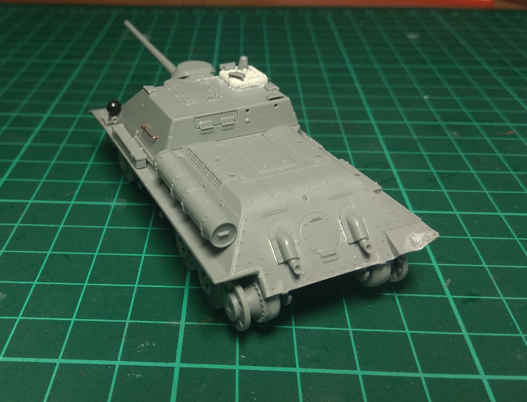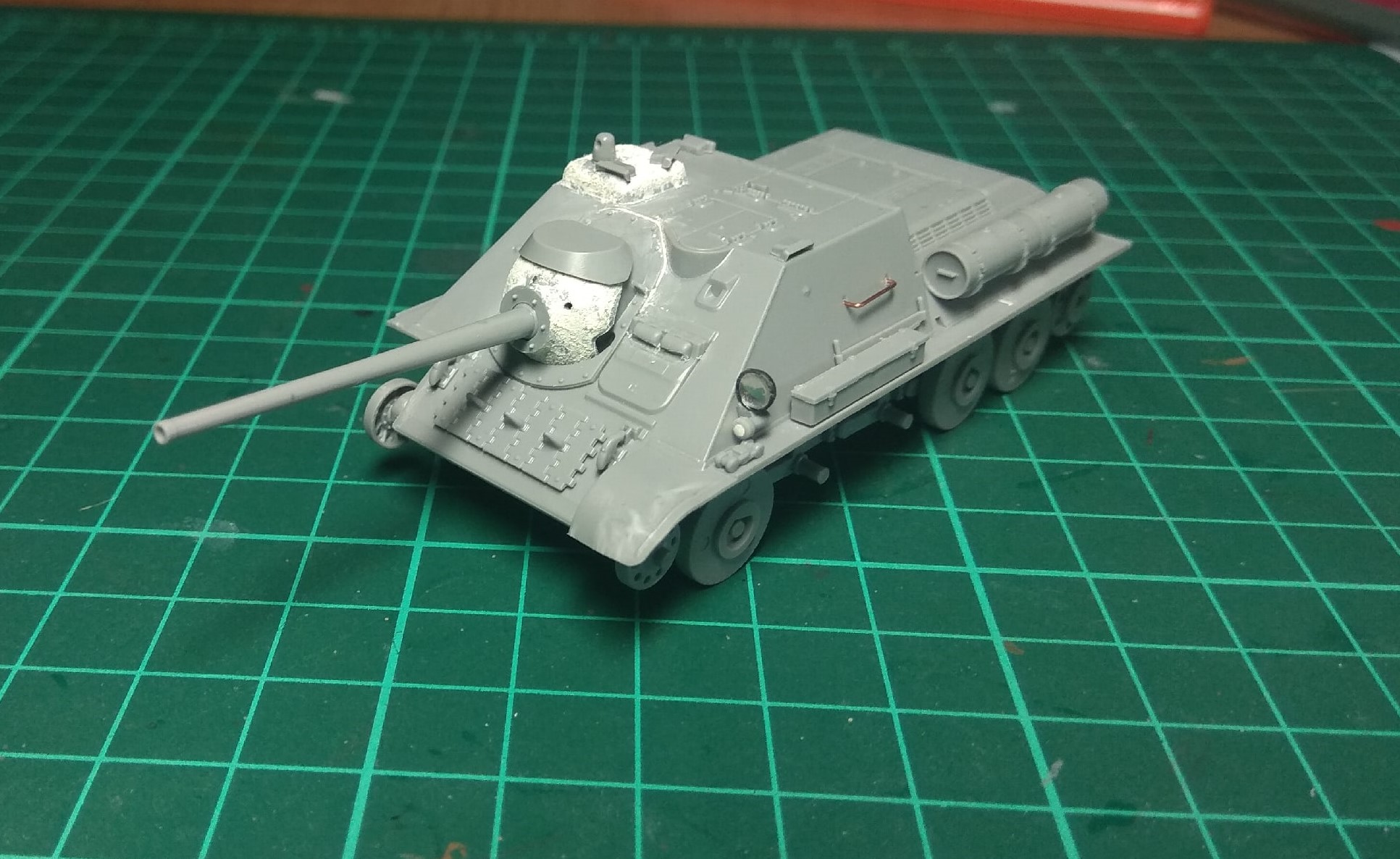 Рабочие будни очень активны, хочется в хобби спокойствия и умиротворения. Наверное по этому за большие выходные так мало успел. Самоходка собирается быстро, т.к. деталей мало. Сказывается тот факт, что модель подразумевает сборку без клея, от сюда обидные щели. Попробовал изобразить "литьё" командирской башни и маски орудия. Думаю заменить поручни на проволоку, по крайней мере по бортам точно.