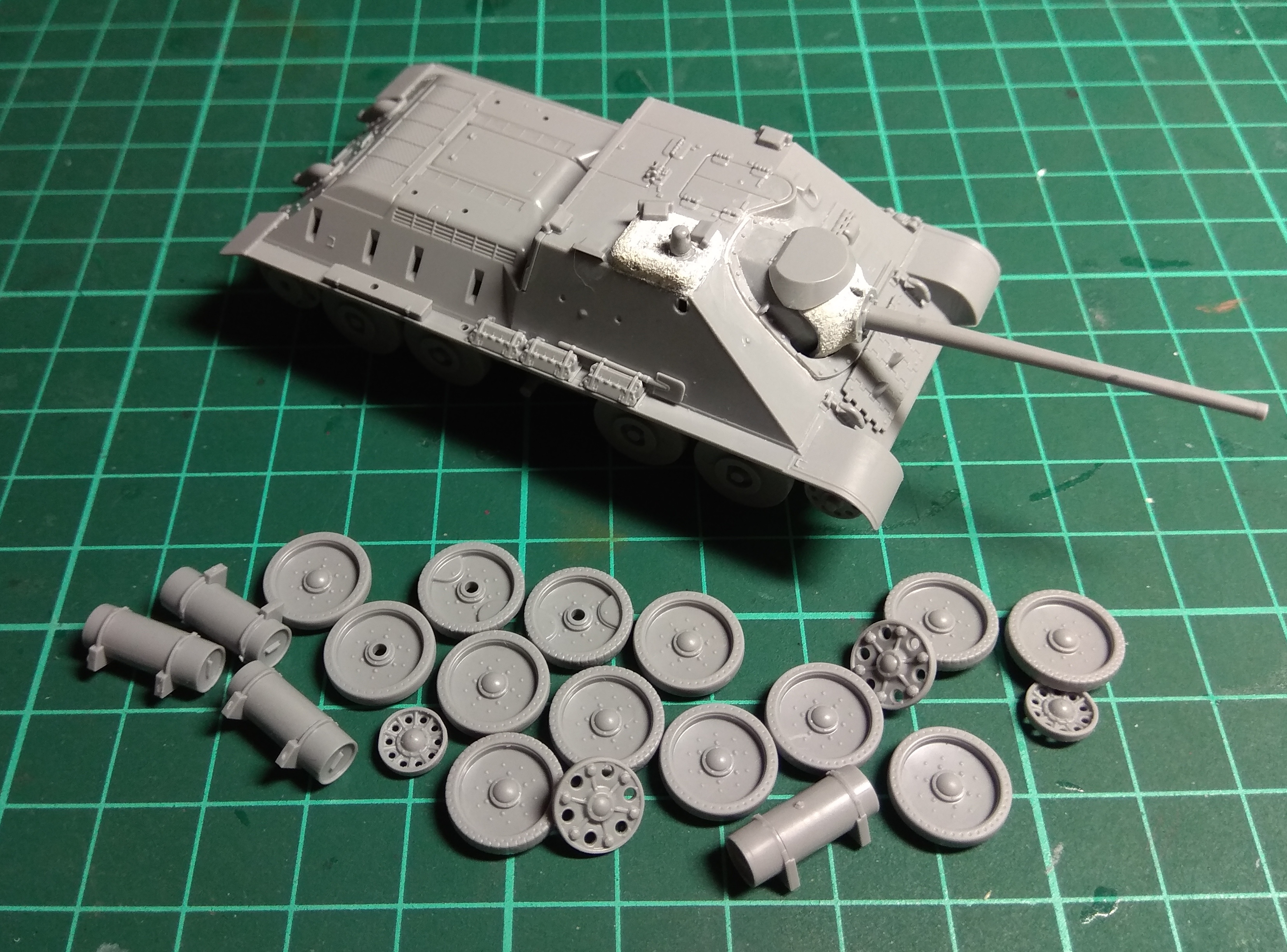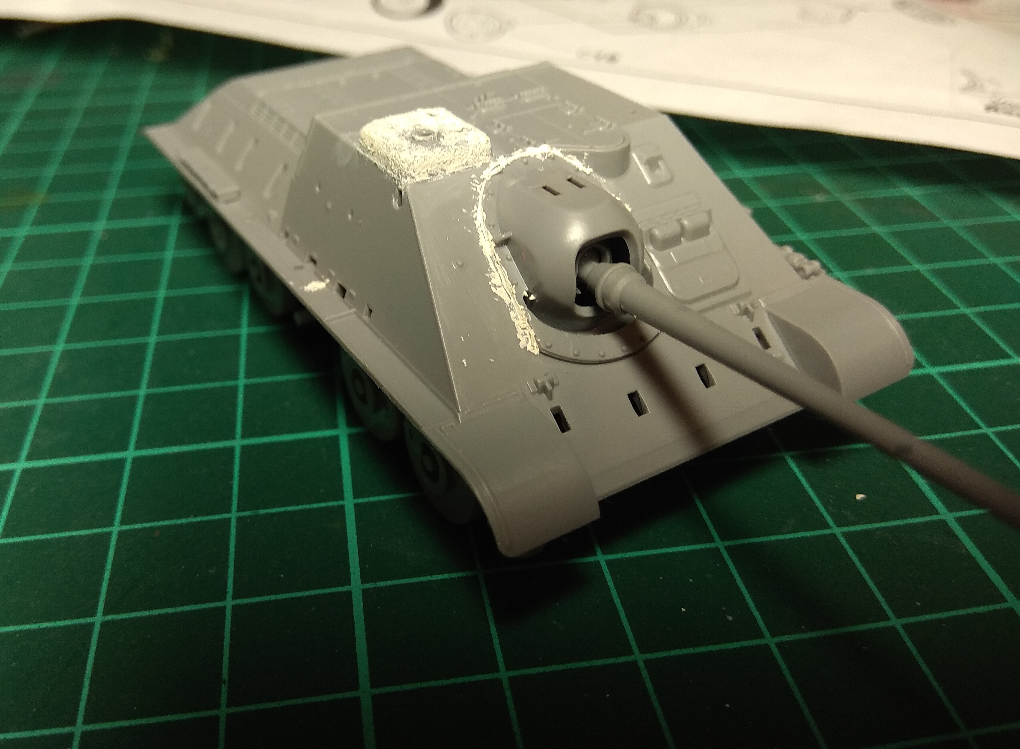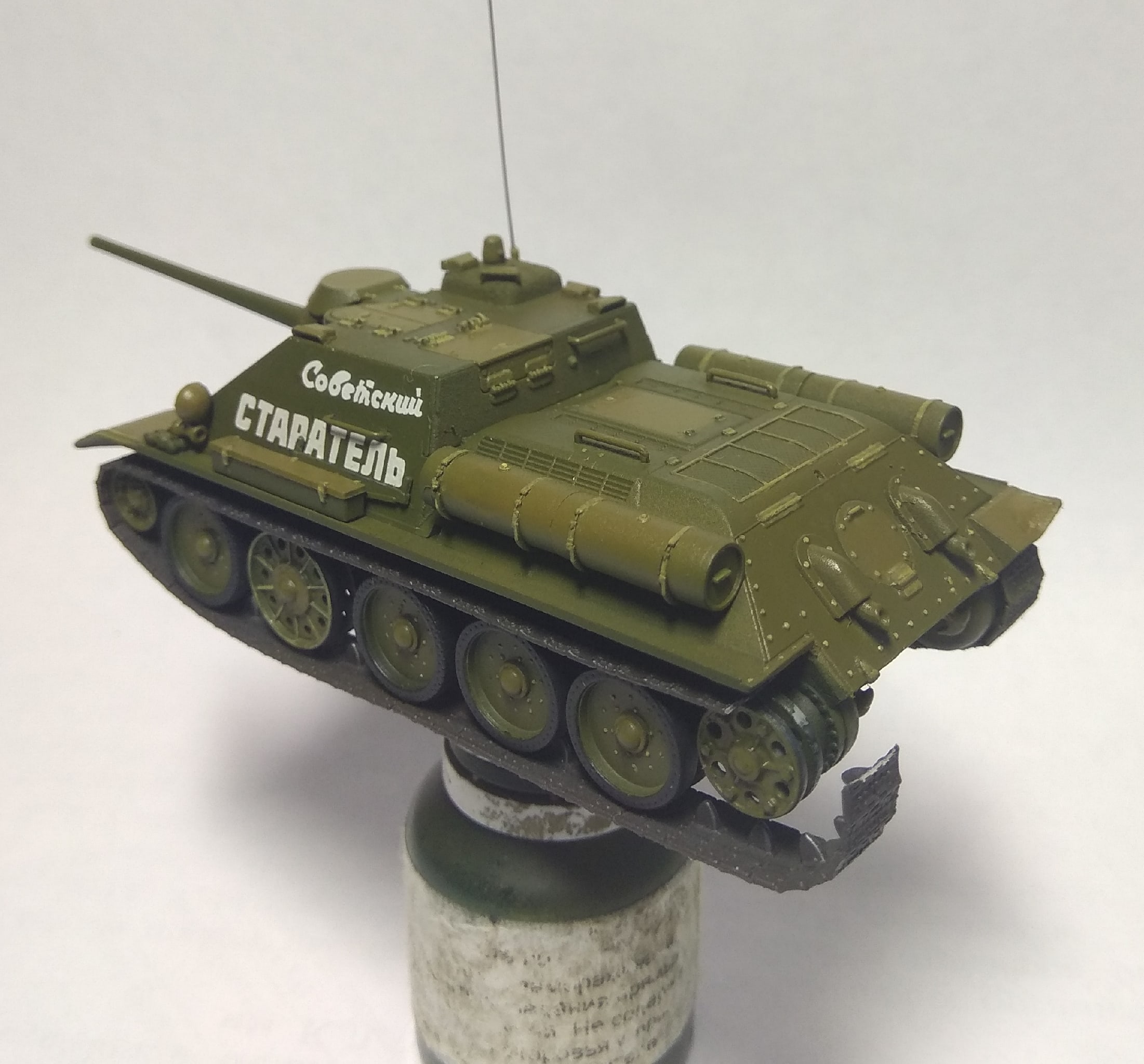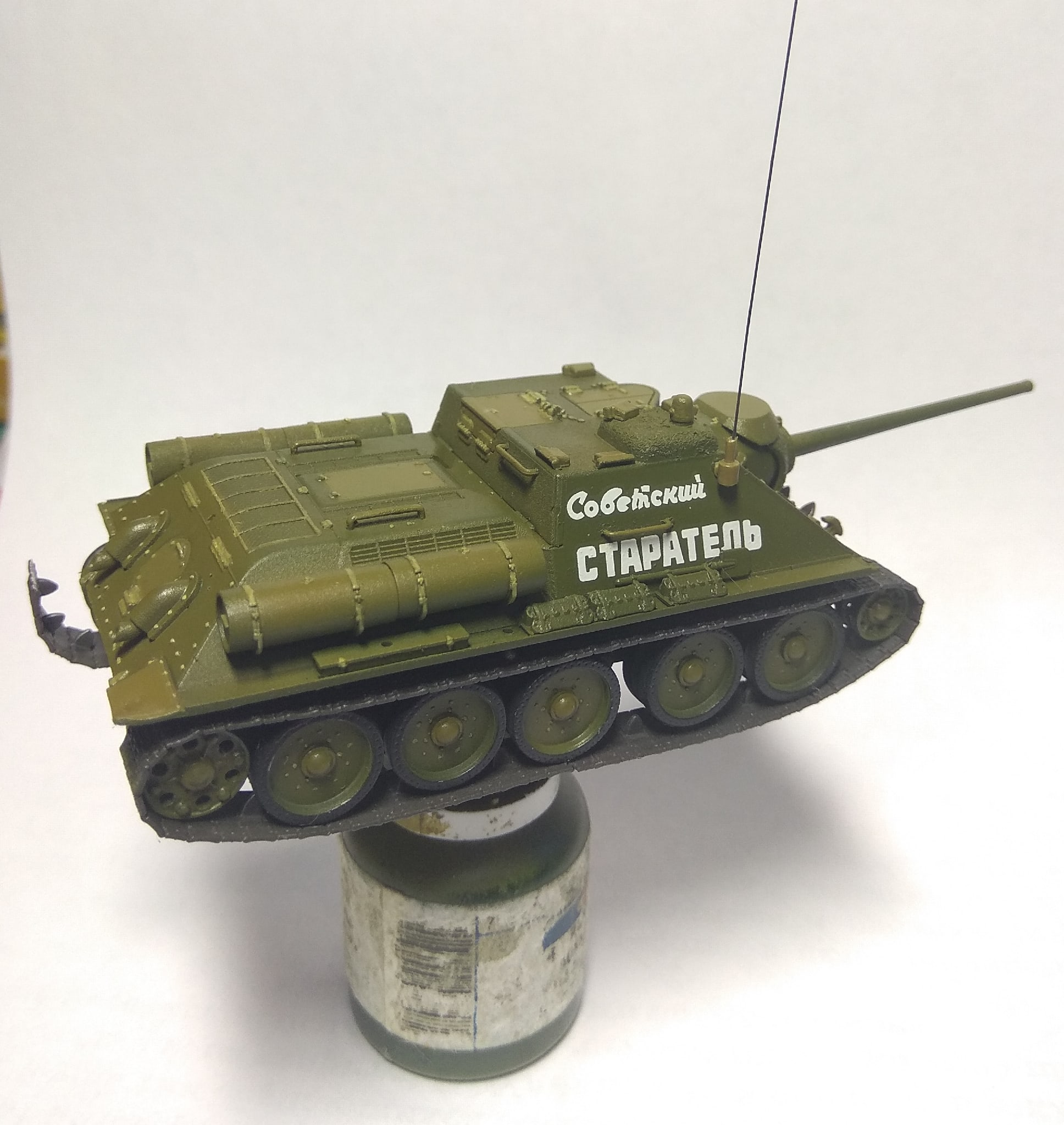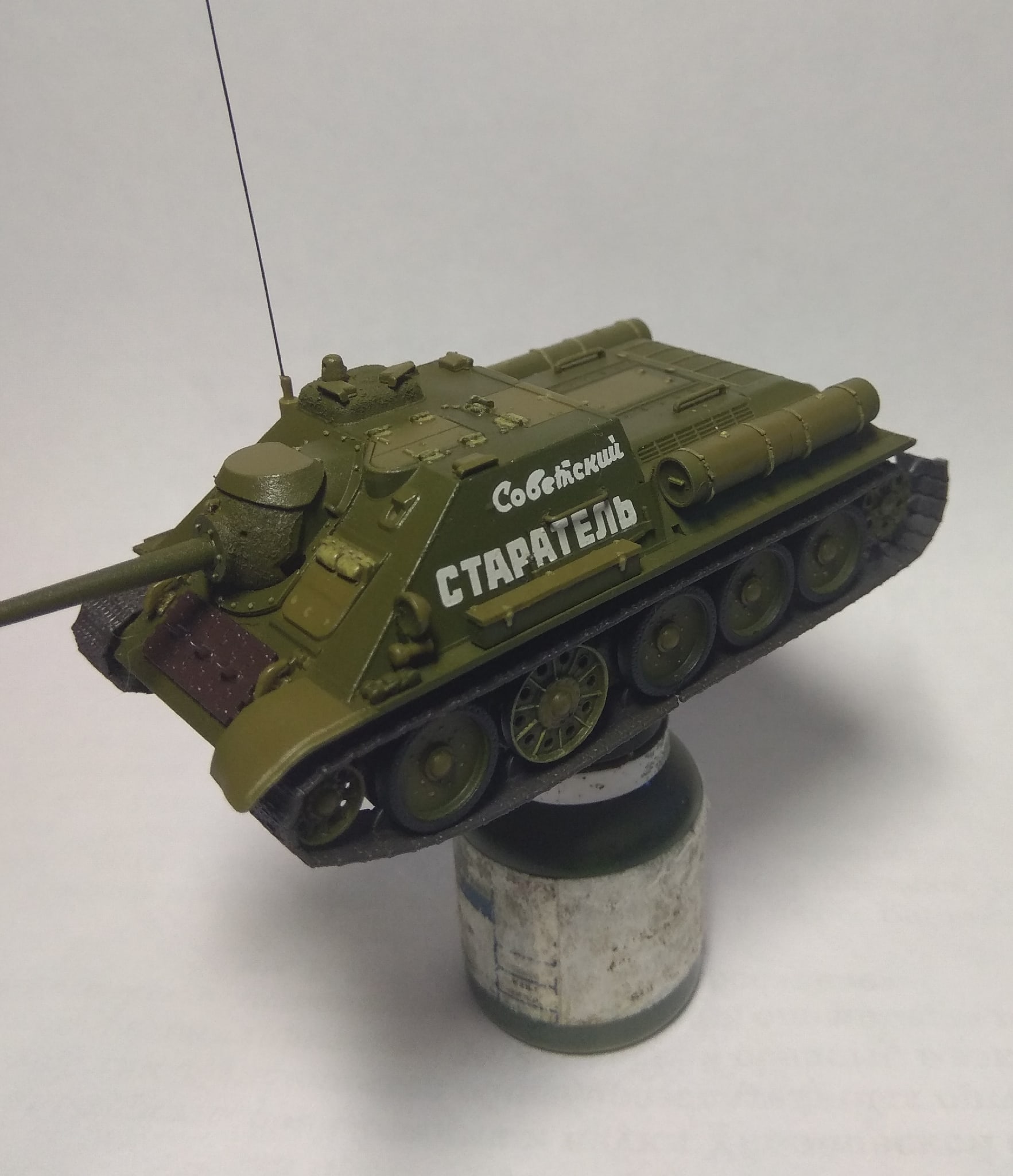 Рабочие будни очень активны, хочется в хобби спокойствия и умиротворения. Наверное по этому за большие выходные так мало успел. Самоходка собирается быстро, т.к. деталей мало. Сказывается тот факт, что модель подразумевает сборку без клея, от сюда обидные щели. Попробовал изобразить "литьё" командирской башни и маски орудия. Думаю заменить поручни на проволоку, по крайней мере по бортам точно.