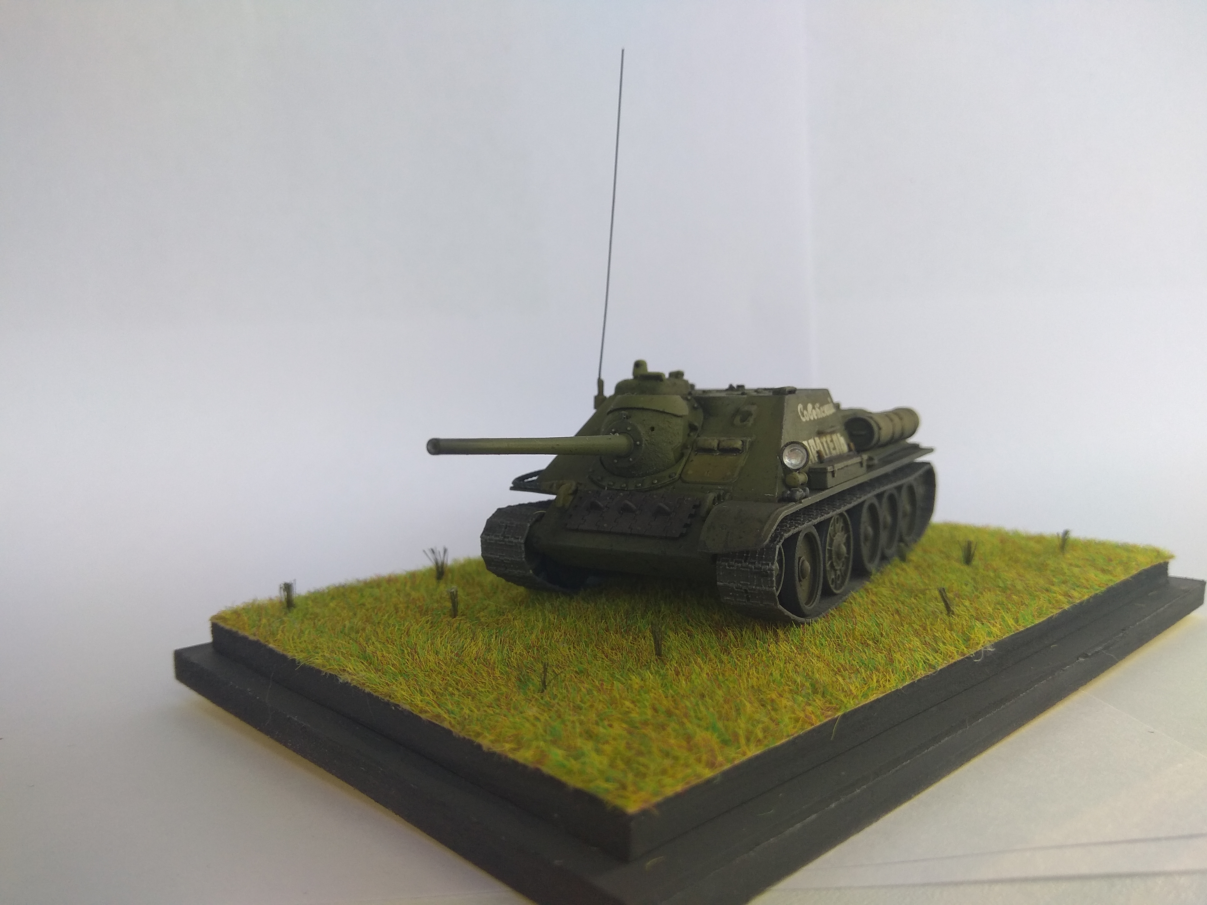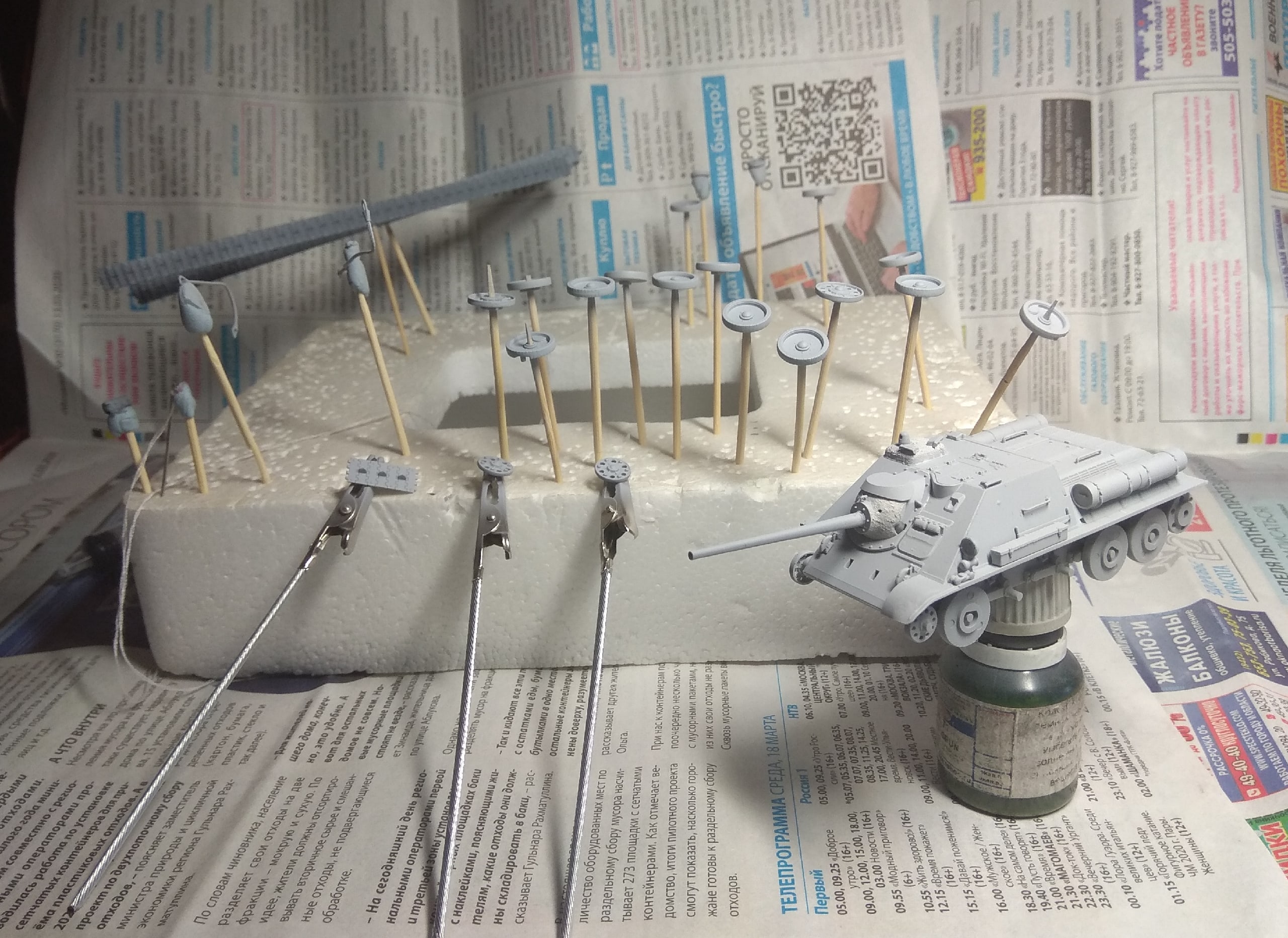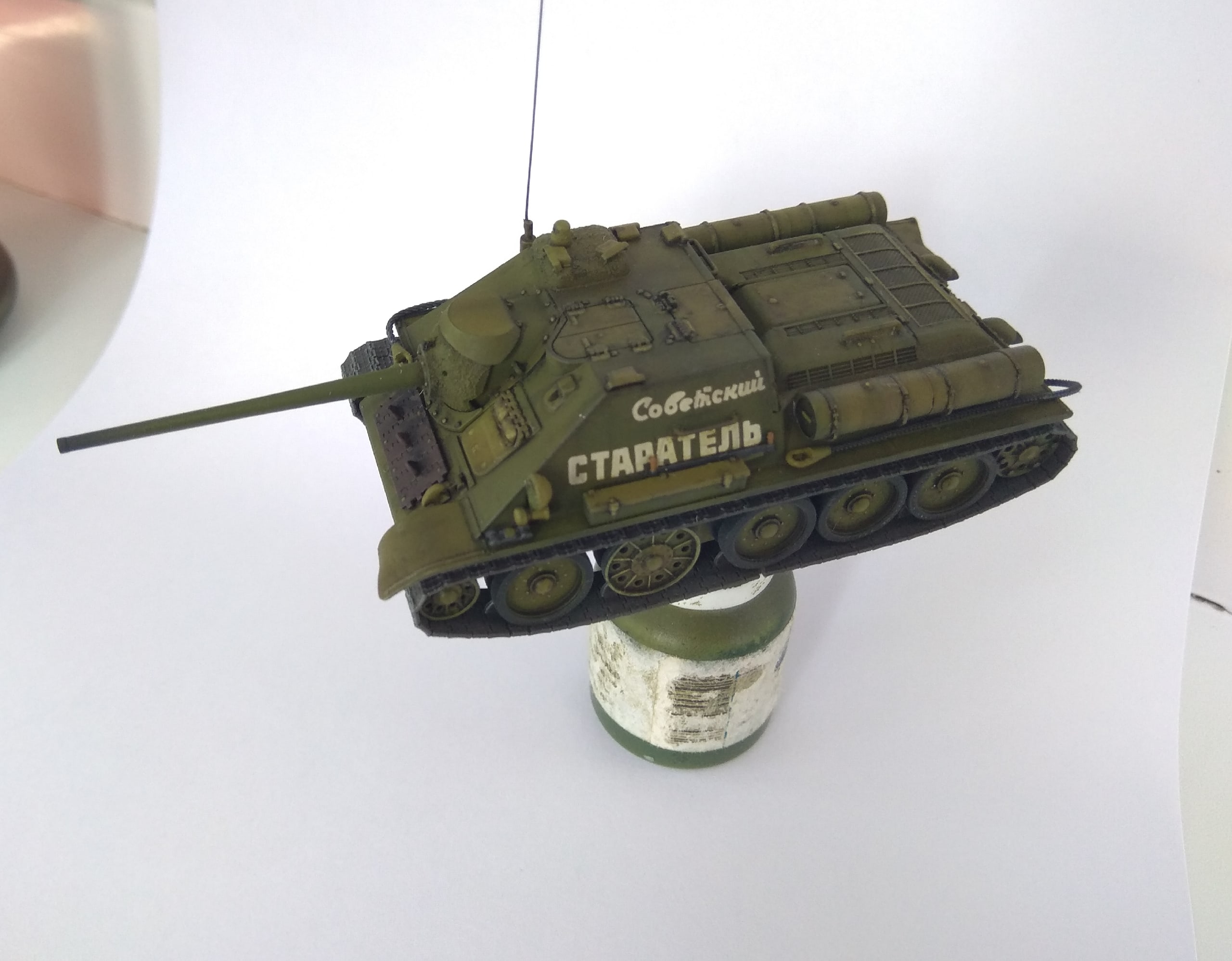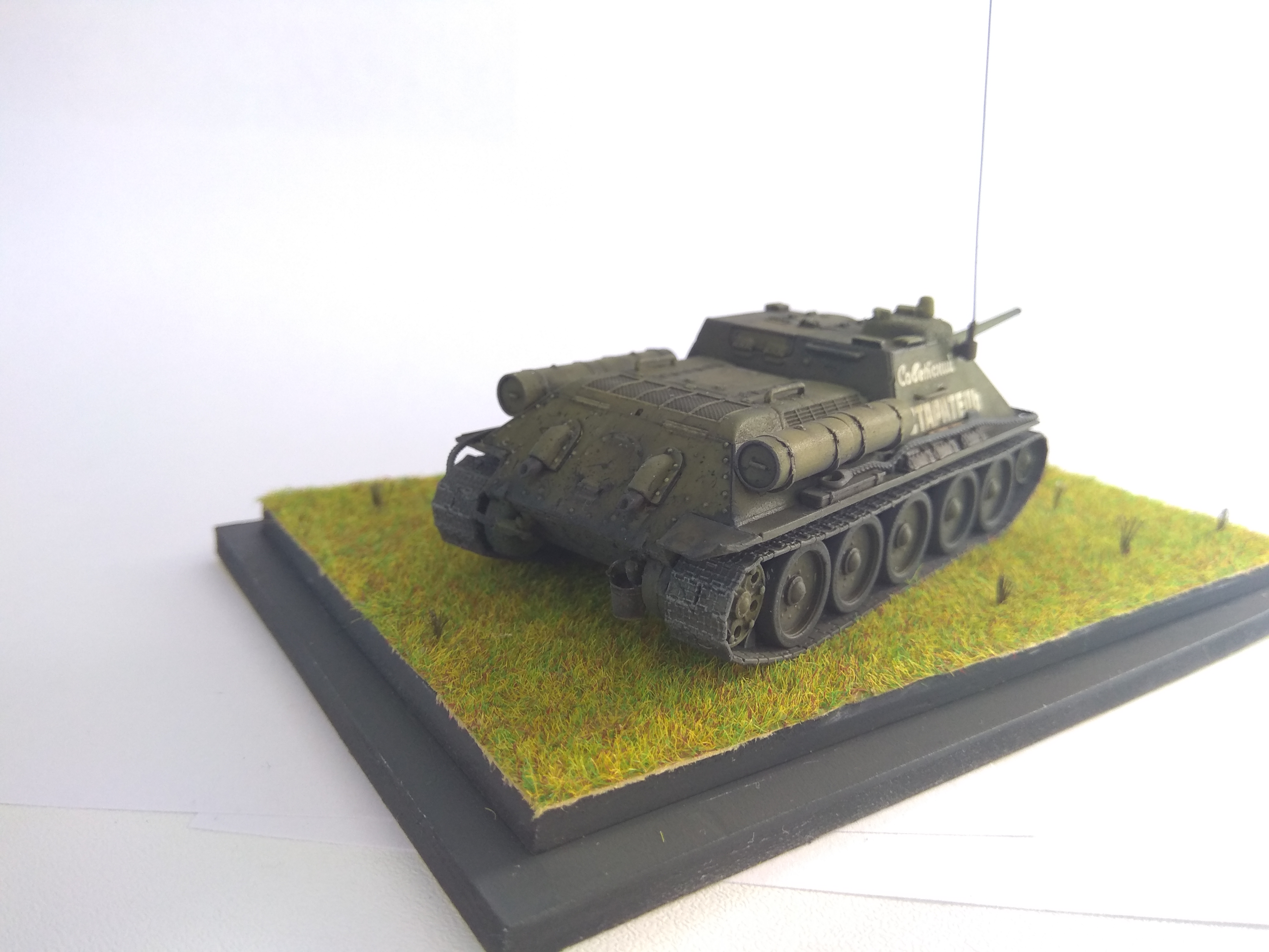 Рабочие будни очень активны, хочется в хобби спокойствия и умиротворения. Наверное по этому за большие выходные так мало успел. Самоходка собирается быстро, т.к. деталей мало. Сказывается тот факт, что модель подразумевает сборку без клея, от сюда обидные щели. Попробовал изобразить "литьё" командирской башни и маски орудия. Думаю заменить поручни на проволоку, по крайней мере по бортам точно.