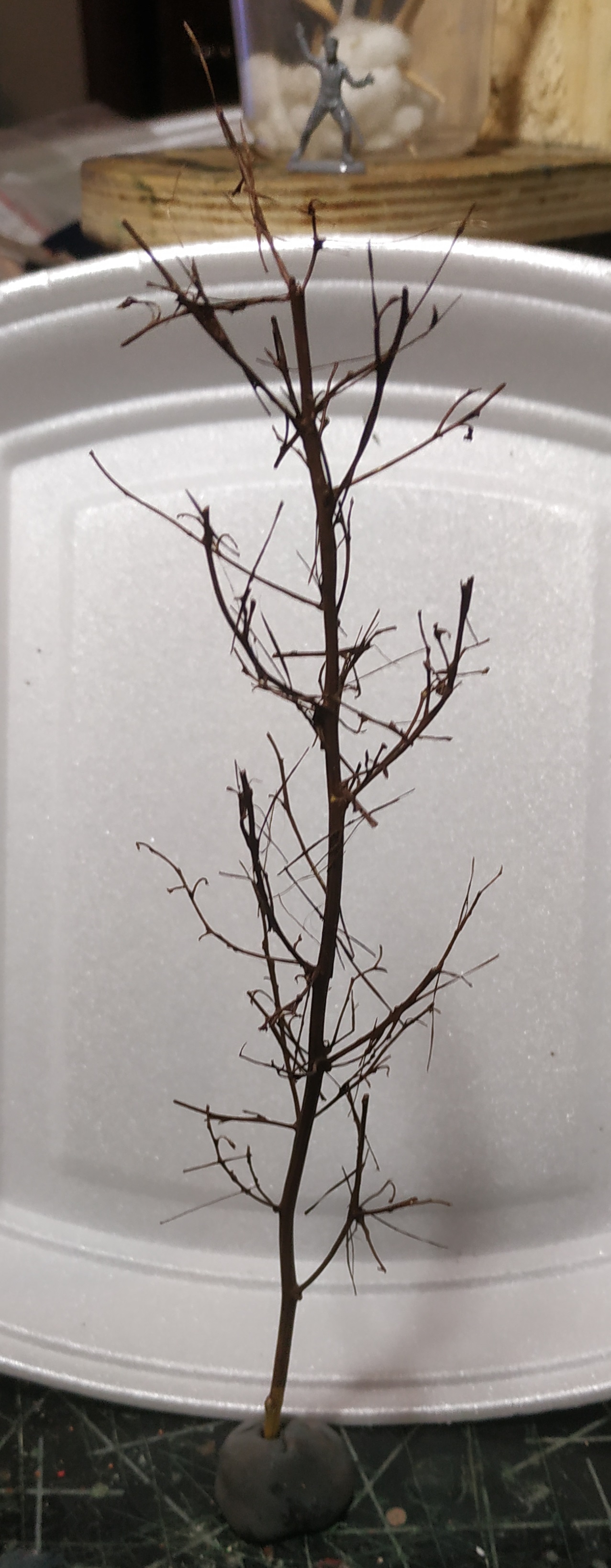 Деревце вышло игрушечным, согласен, но это были вариации на тему дерева, которое построил Виктор Новиков. Молодые побеги клена из него сгодятся. А прогрессивный народ использует другой метод изготовления — ствол можно и из проволоки делать, только шпаклевать обильно, а вот крона хорошо получается путем обсыпки. На ветви натягивается раздербаненный синтепоновый ворс, поливается клеем из аэрозоли и потом обсыпается всяким, кто на что горазд, включая перемолотую губку для мытья посуды. Конечно, ствол интереснее выглядит из природных материалов, высушенные корешки хорошо годятся для этого.