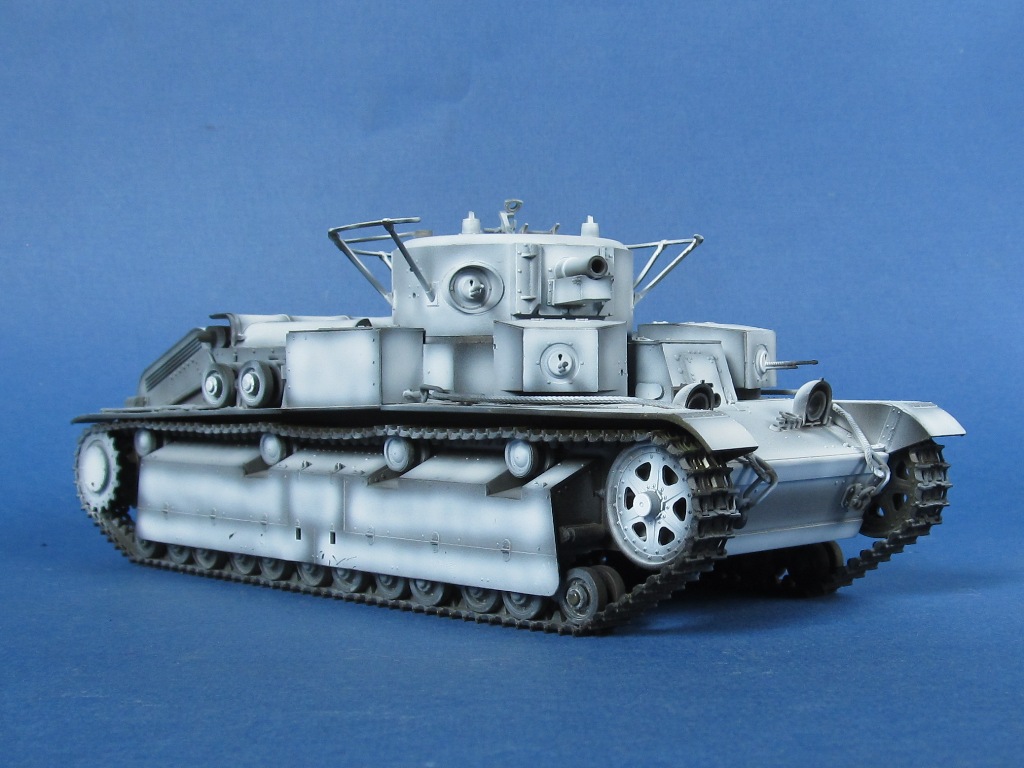 Так как решил красить танк с полностью собранной ходовкой, то вначале всё было загрунтовано полностью чёрным грунтом, а затем белым сделал высветления. Теперь только осталось решить, какой вариант окраски выбрать.