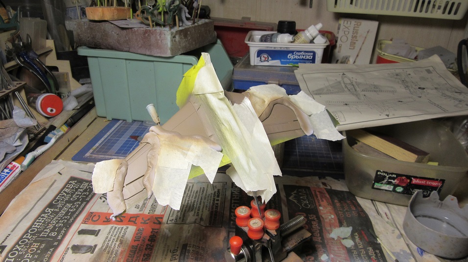 3 - начал сборку , стало вырисовываться что-то похожее на самолет. При этом обнаруживаются дефекты литья - на передней кромке нужна шпаклевка и недолив одного из предкрылков.