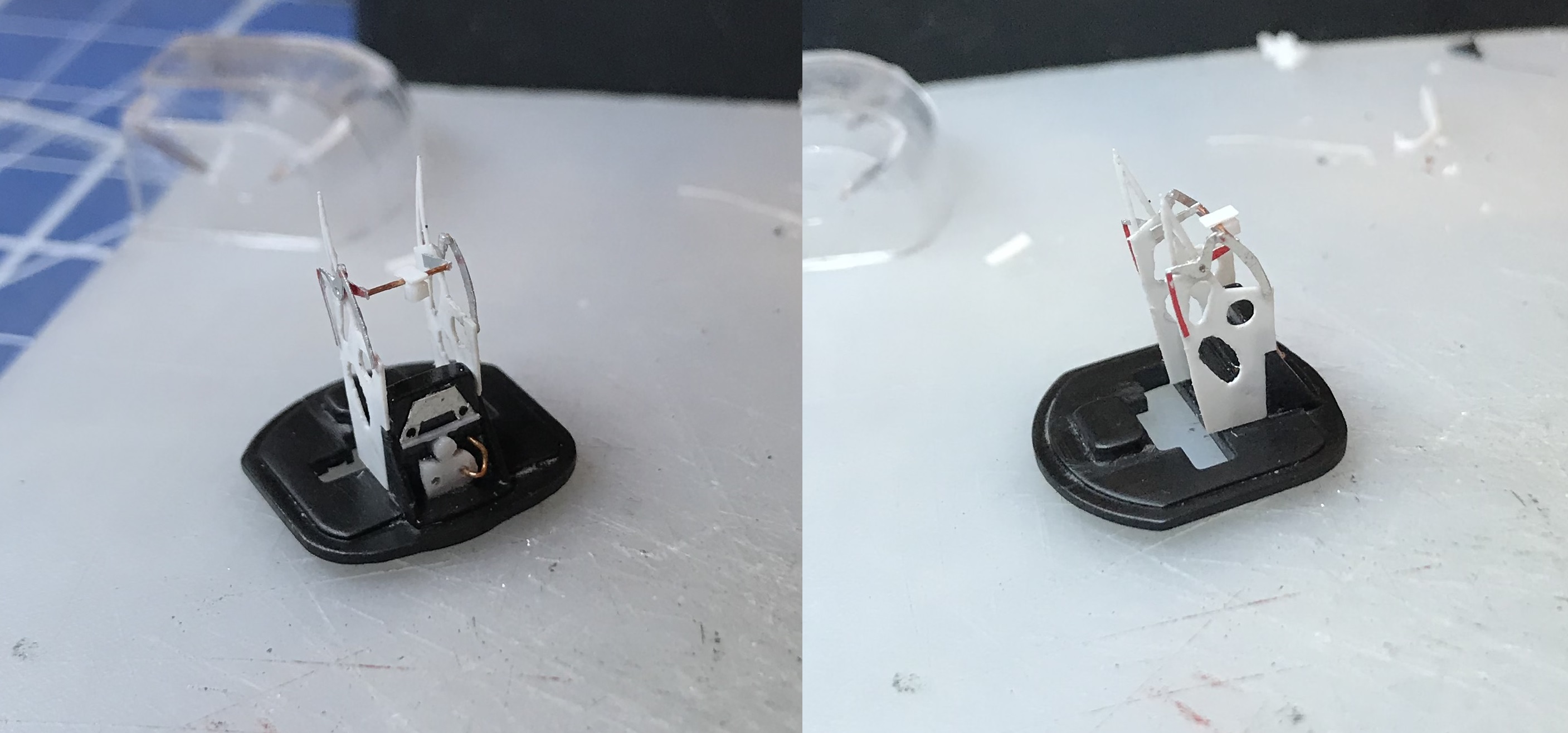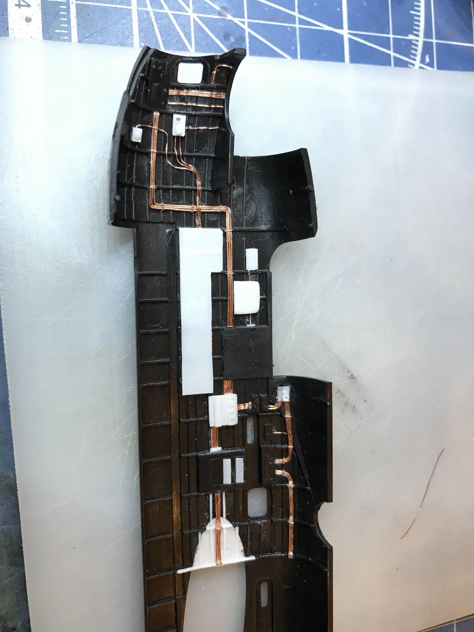 Начал дополнительно напихивать кабину. Вот что пока получилось. Ещё пару кронштейнов к столу изобразил из проволоки, но их не сфотал.