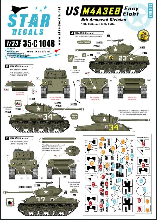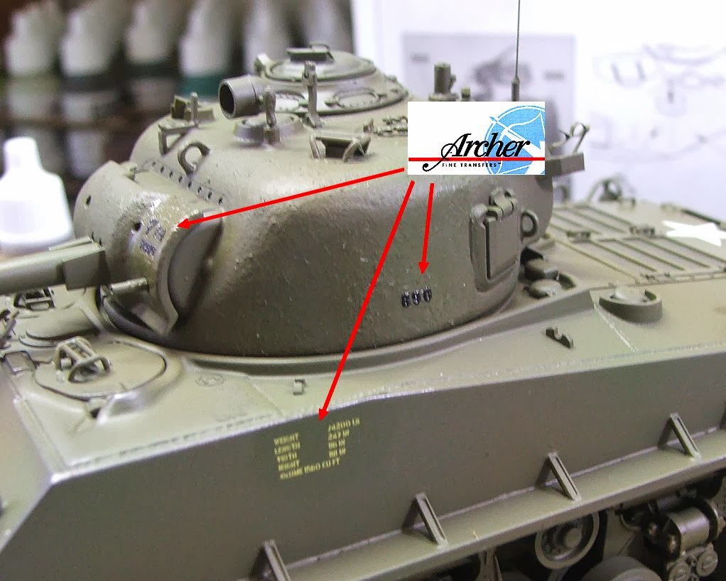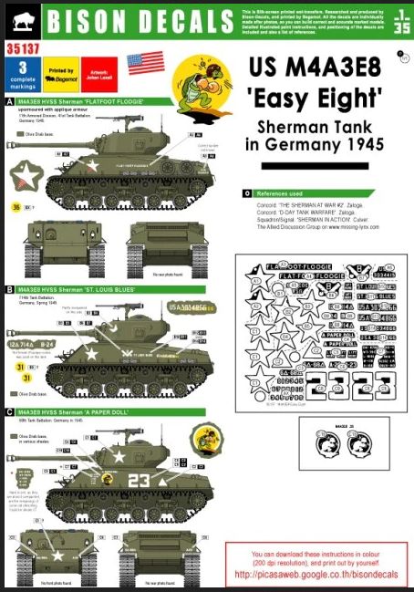 1) Неполнота изкоробочных декалей не только в отсутствии технадписей на бортах, но и в отсутствии маркировки на фронтальной части. Технадписи  на шерманы выпускает отдельно Archer Fine Transfers. Это компания также выпускает "A Paper Doll", но и она неполная. Bison Decals уже не существует, сейчас это Star Decals. Кстати, с владельцем Star Decals можно списаться на FB, он, по запросу, бывает предоставляет дополнительные фото техники, подтверждающие маркировку.