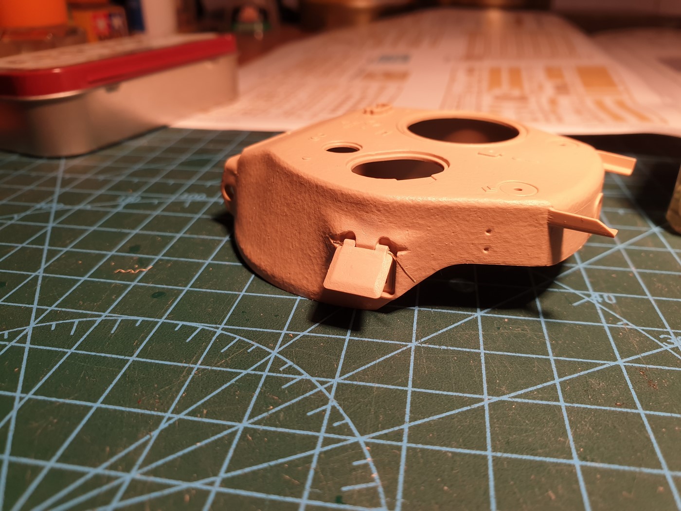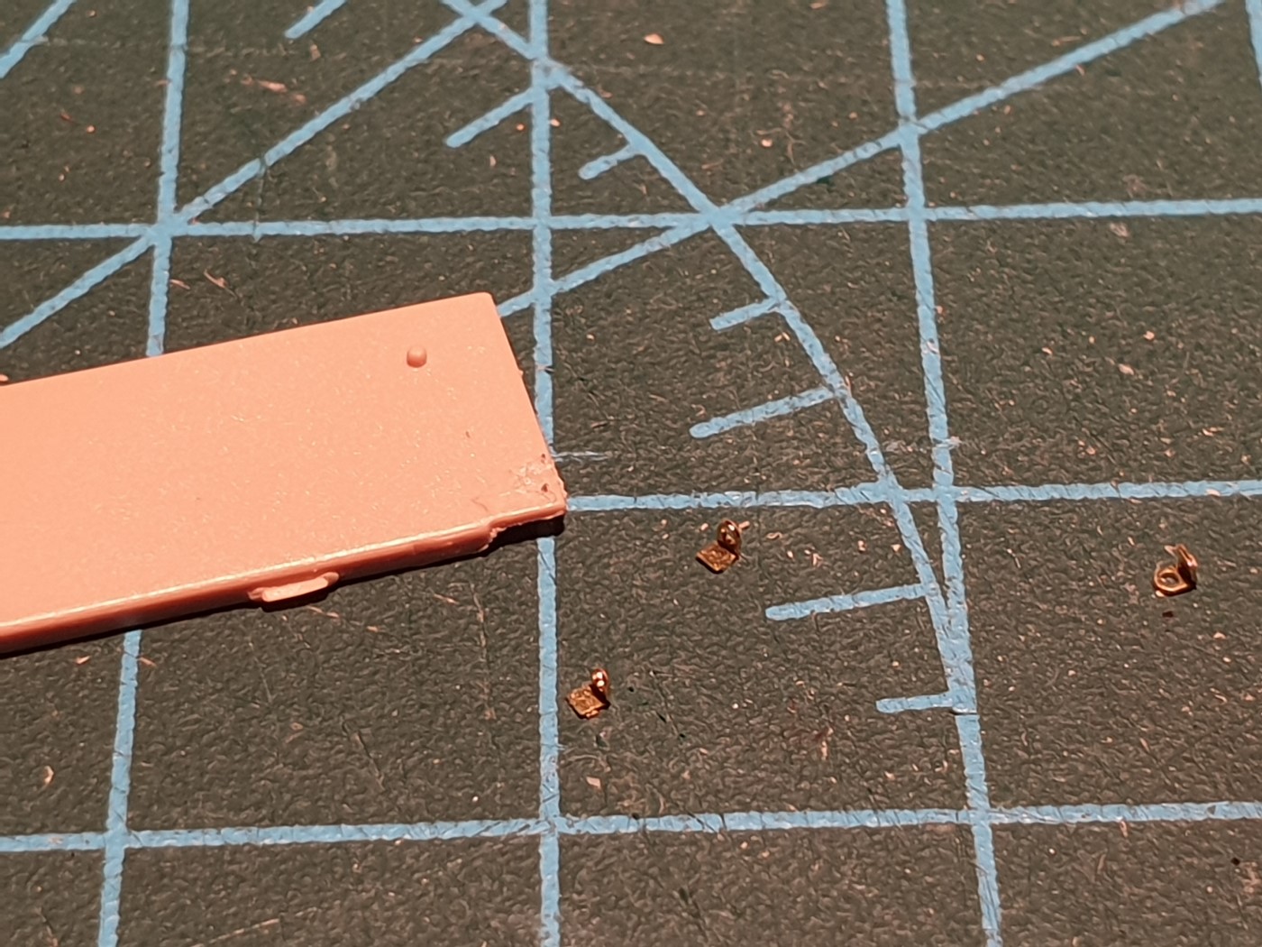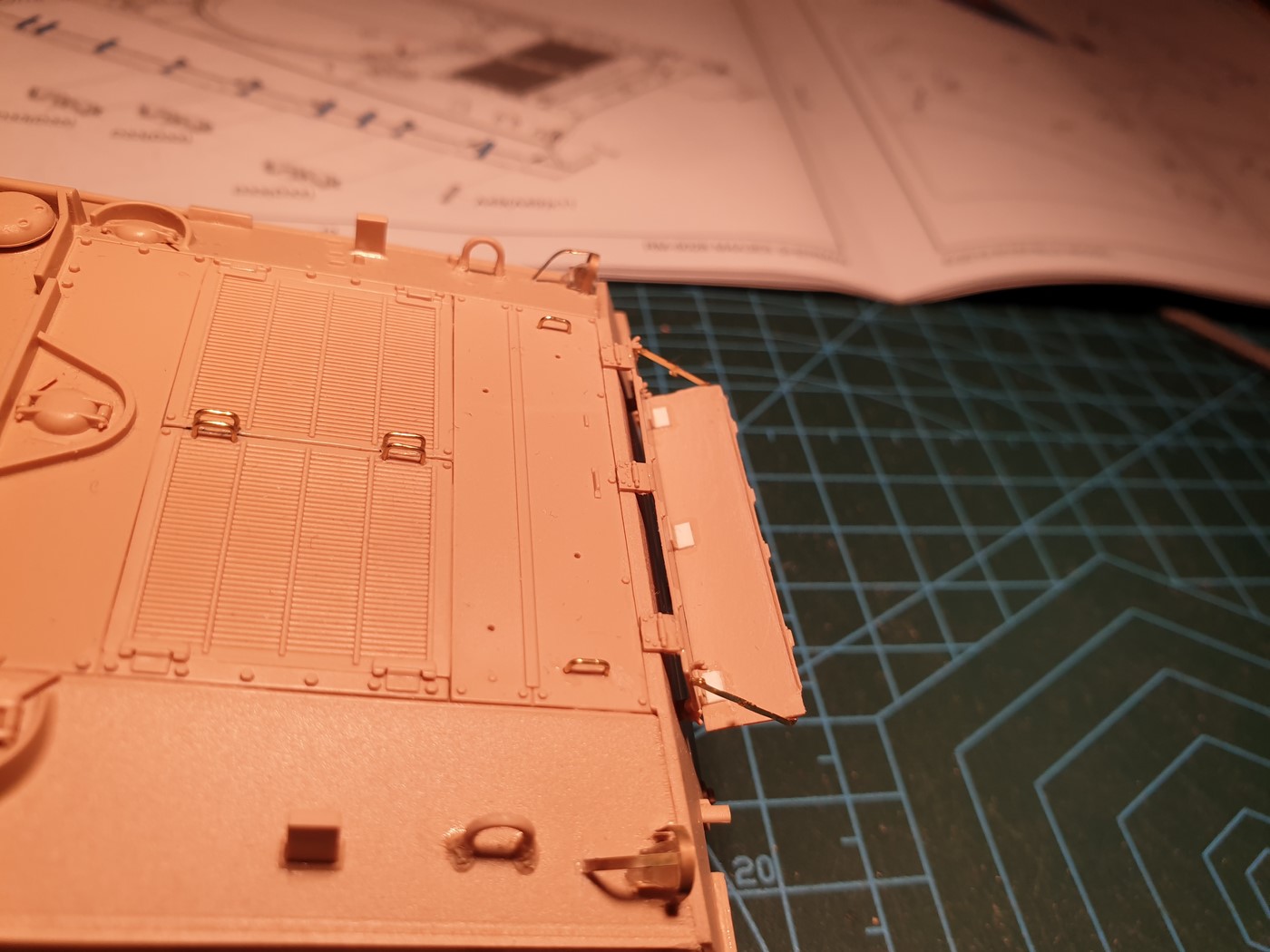 Срезал все литье, восстановил фактуру брони клеем и жесткой кисточкой. Потом из кусочков пластика вырезал... штучки. Просверлил их и наклеил на люк.