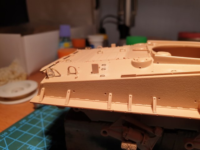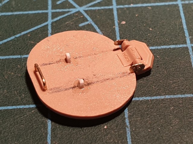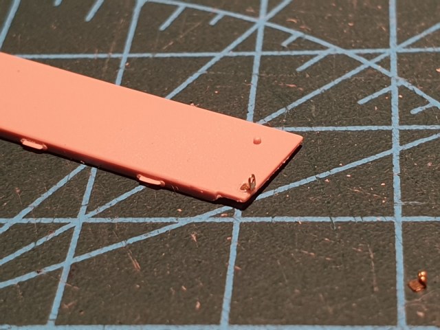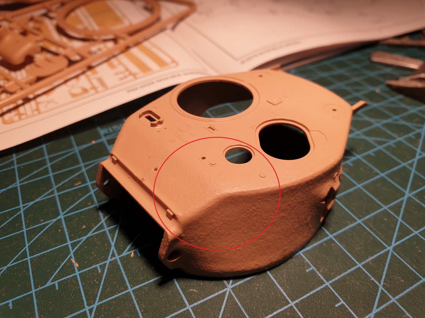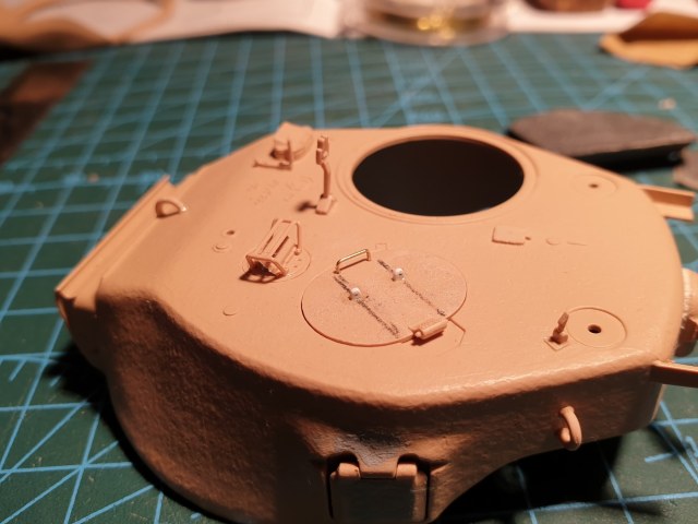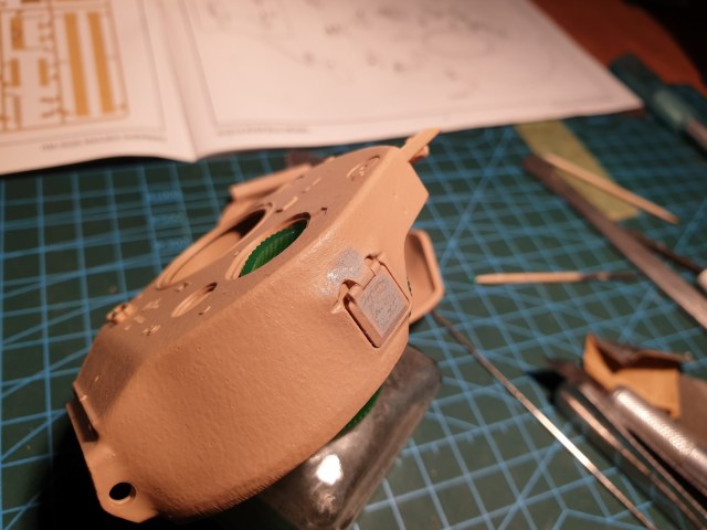 Срезал все литье, восстановил фактуру брони клеем и жесткой кисточкой. Потом из кусочков пластика вырезал... штучки. Просверлил их и наклеил на люк.