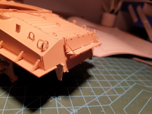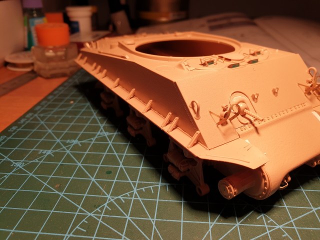 Приклеил жабры дефлектора. Конструкция отличается от М4А3, который я собирал, плюс из-за нюансов конструкции нельзя сделать их подвижными, либо положение "вверх", либо "вниз".