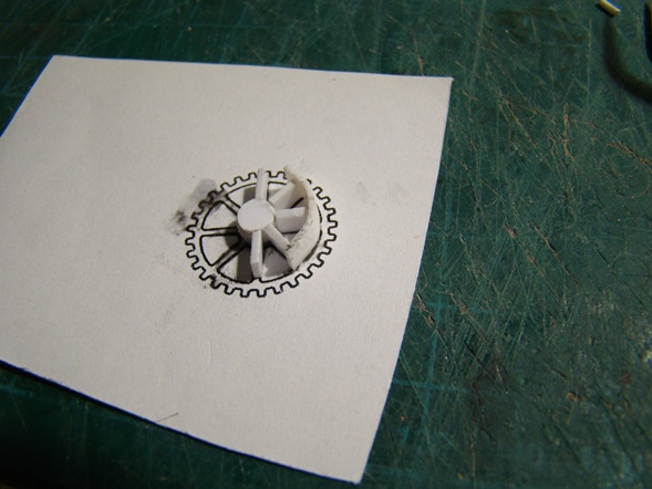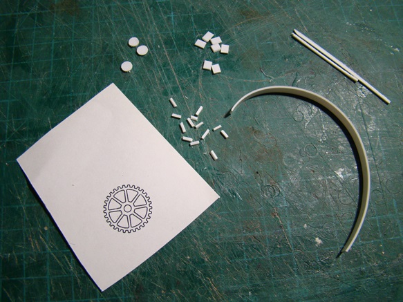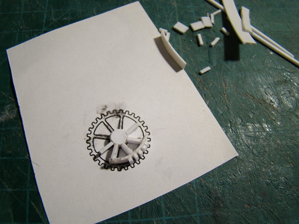 @Wolk33 написал:Шестерни делал из пластика толщиной 1 мм, который клеил на рисунок шестерни на бумаге, делал это по тому же принципу как и с колёсами. Колёса тоже из пластика 1 мм, а спицы 0,5 мм.