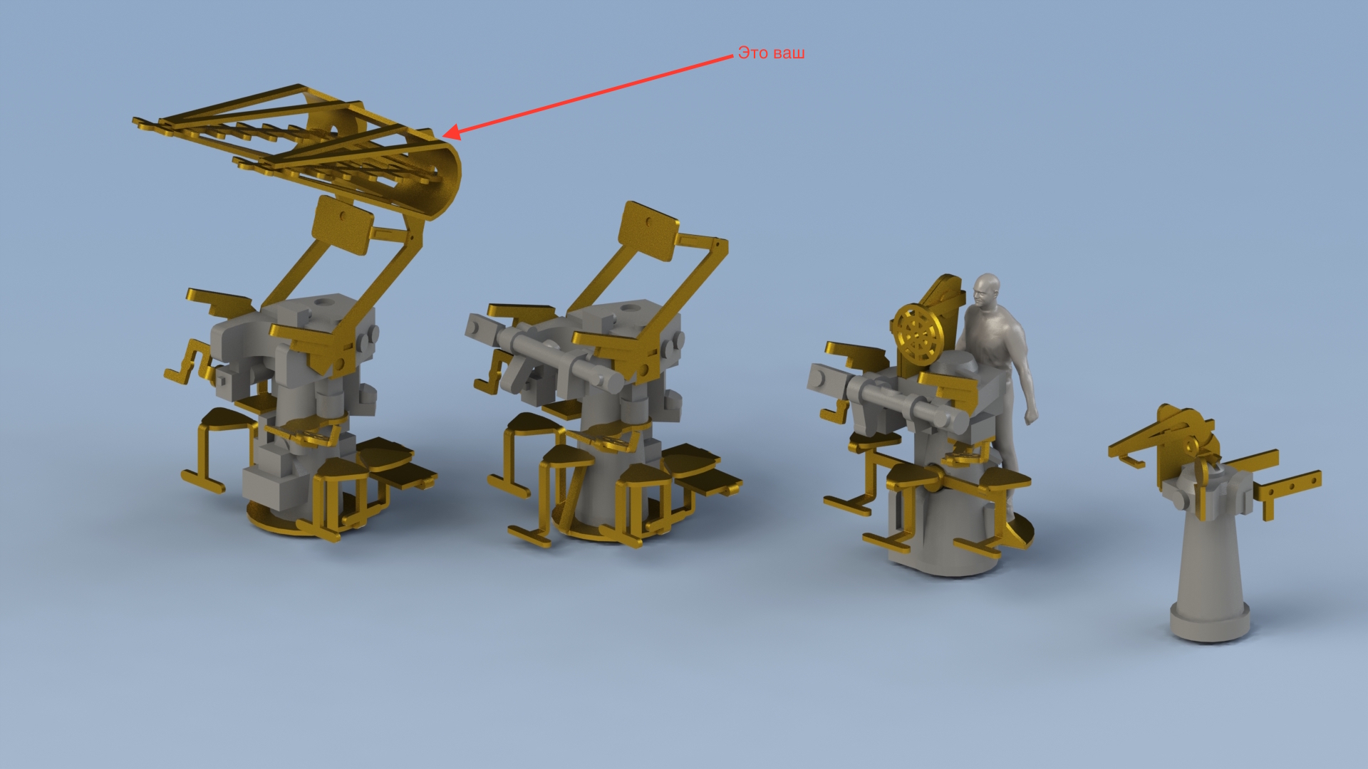 А что это там такое, в барбетах на крыше кормовой надстройки ??). Автоматы?? Радары?? А как они выглядят? Непонятно .. Зеленый :