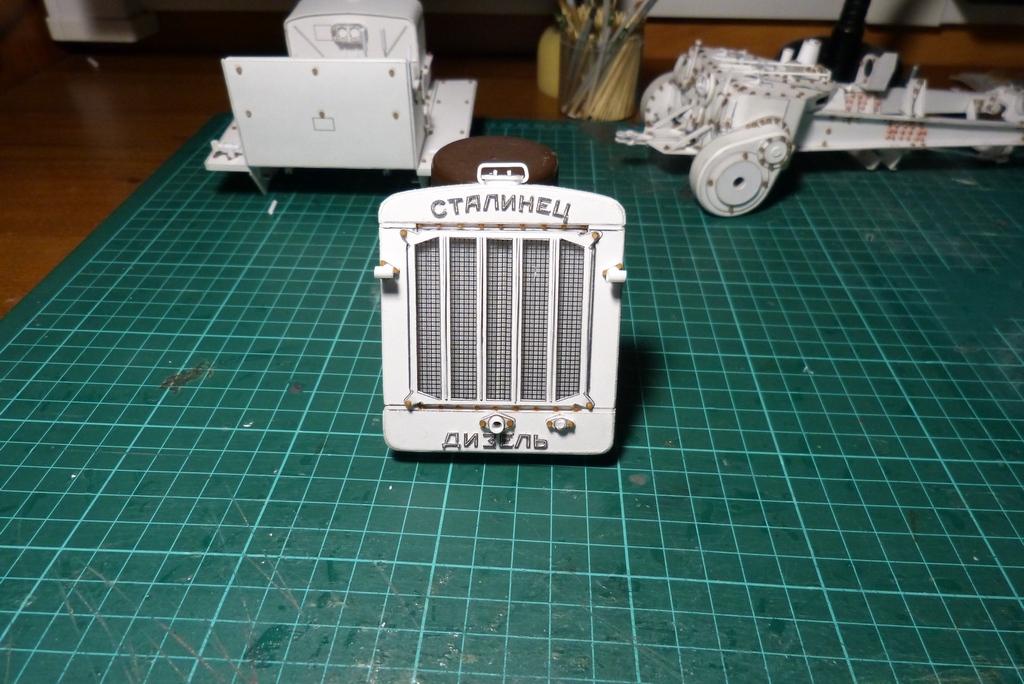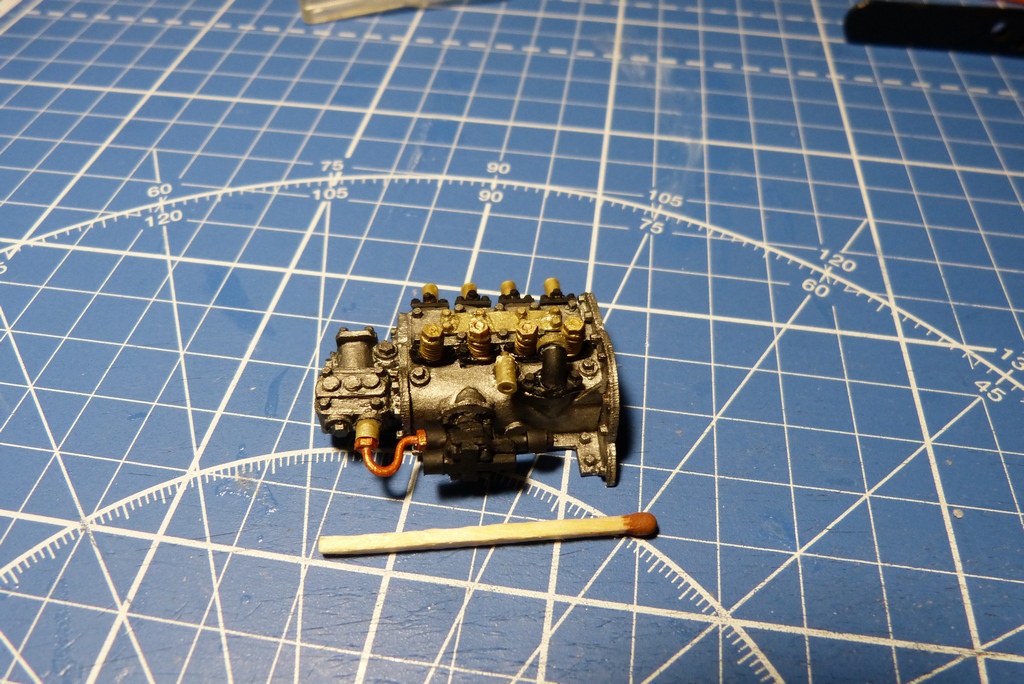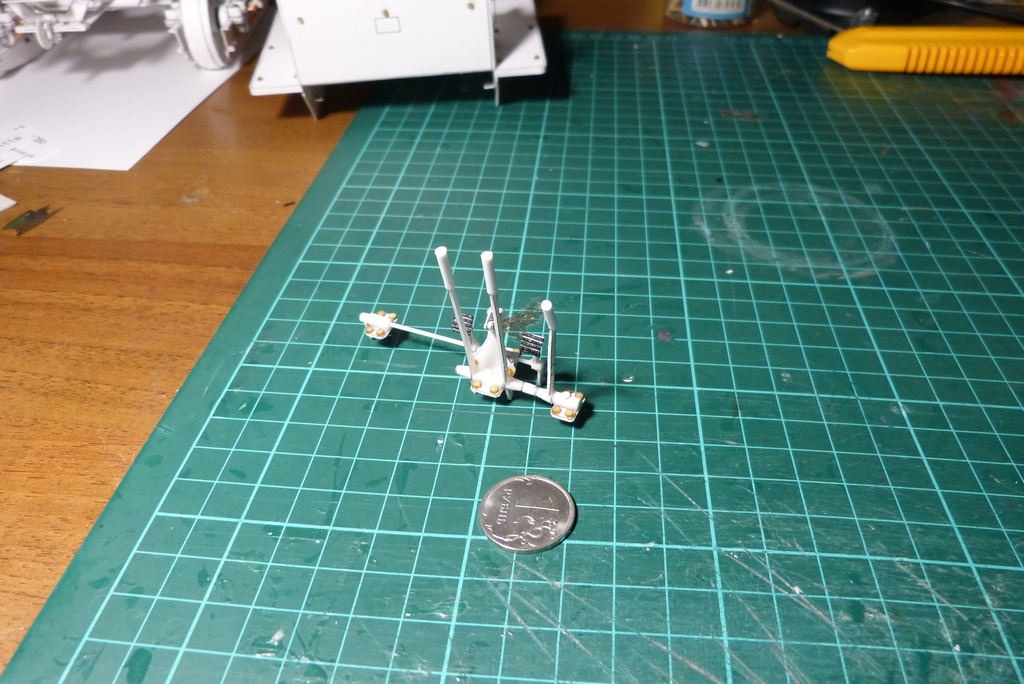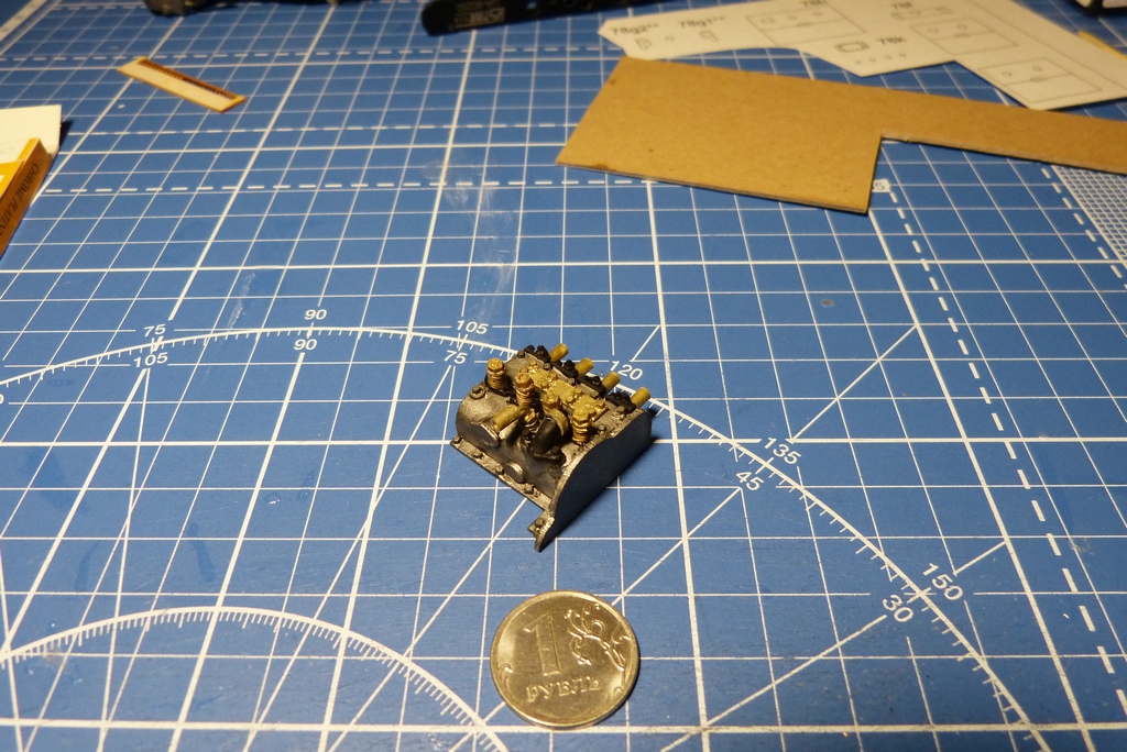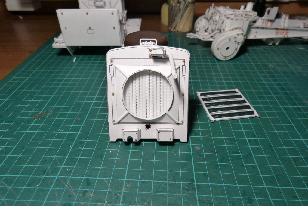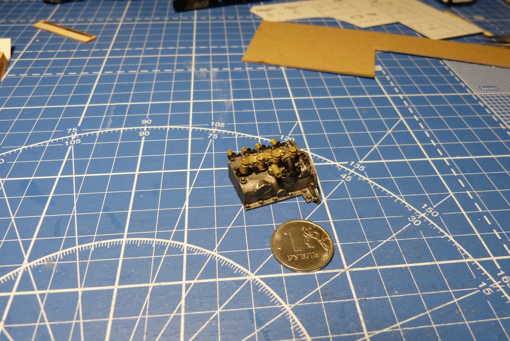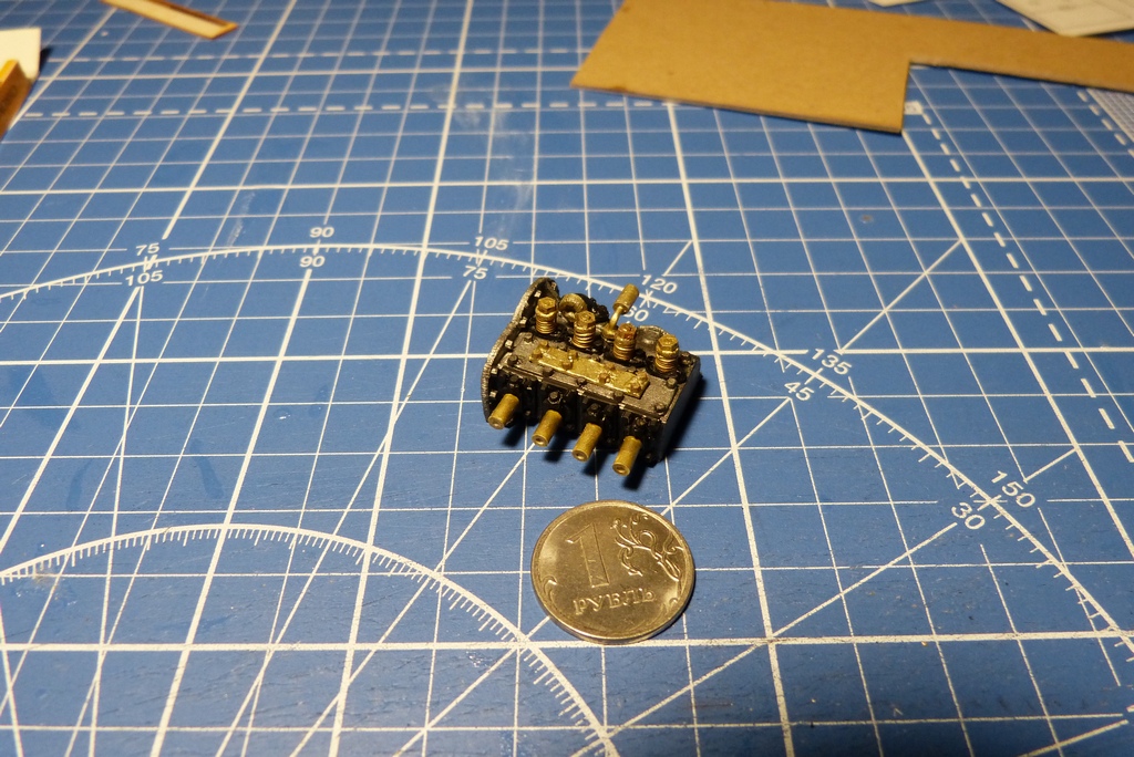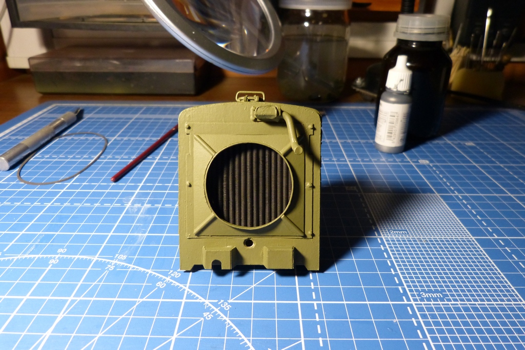 Доделал небольшие деталюшки,крепление задних фар,не ахти как вышло,но как смог,ушки крепления стоек корпуса радиатора,две тяги на корпусе.Сделал трубки радиатора,тут была жуткая проблема,смотрел сборки видел,что ребята наматывали проволочку имитируя ребрышки,но у меня не получилось.