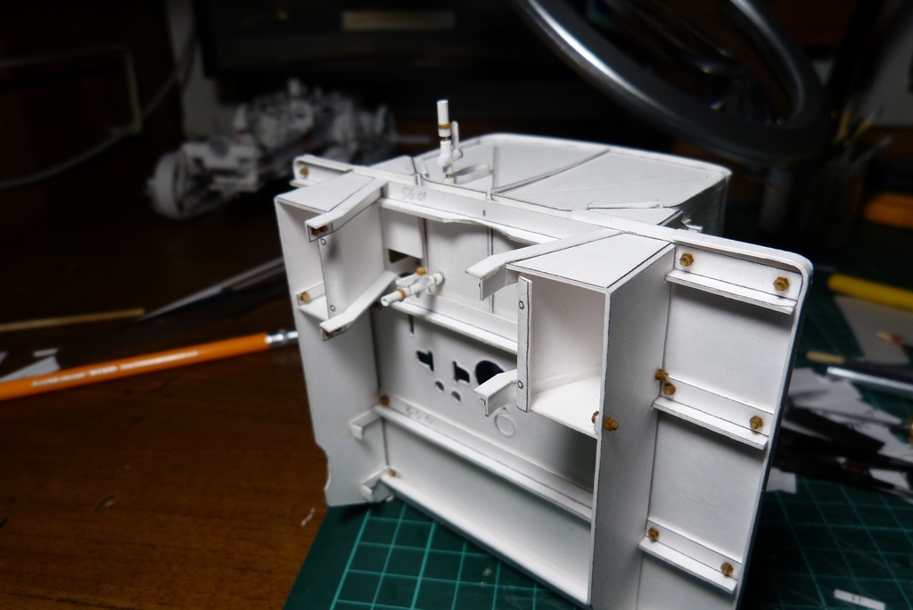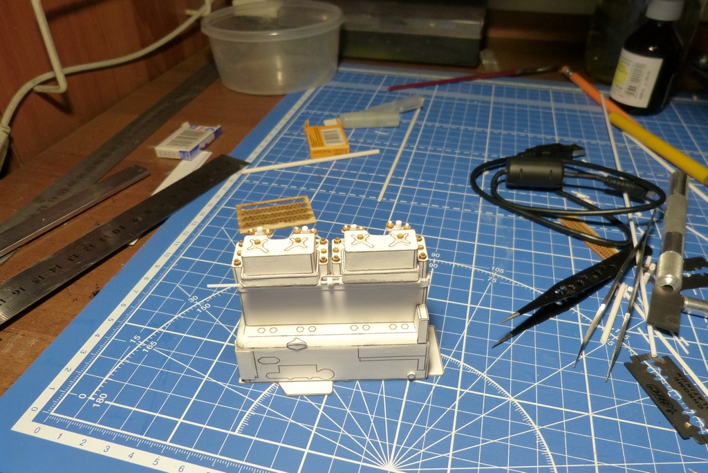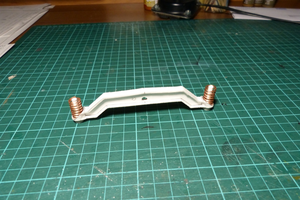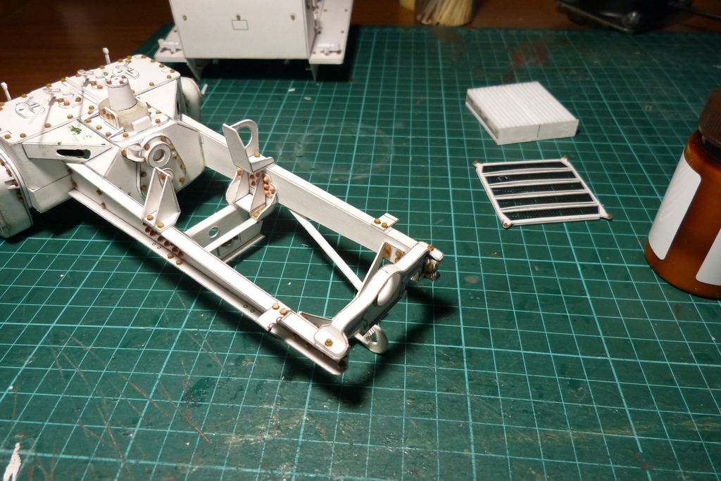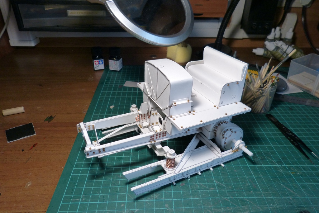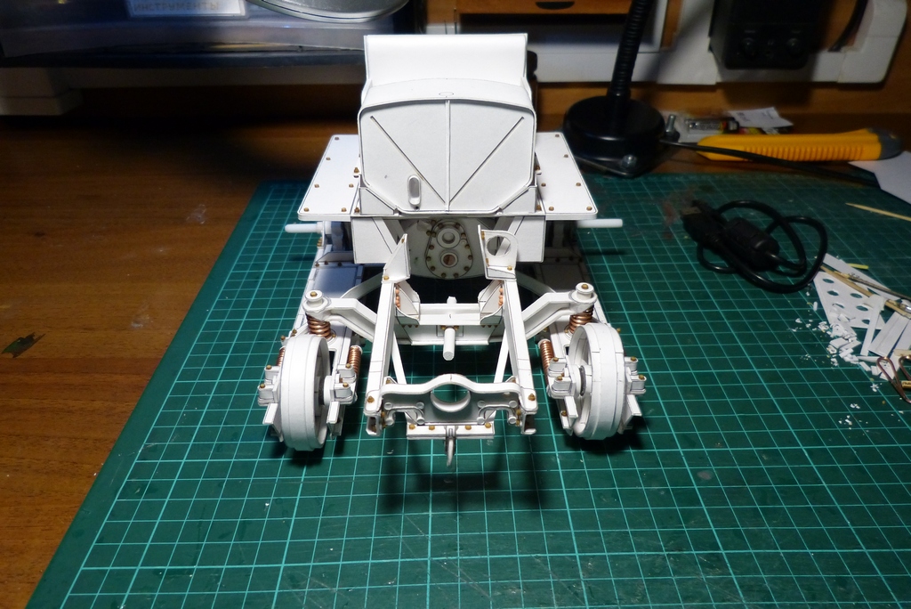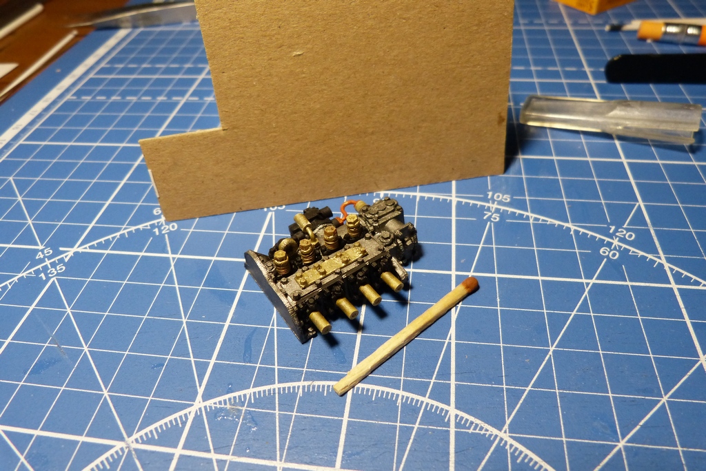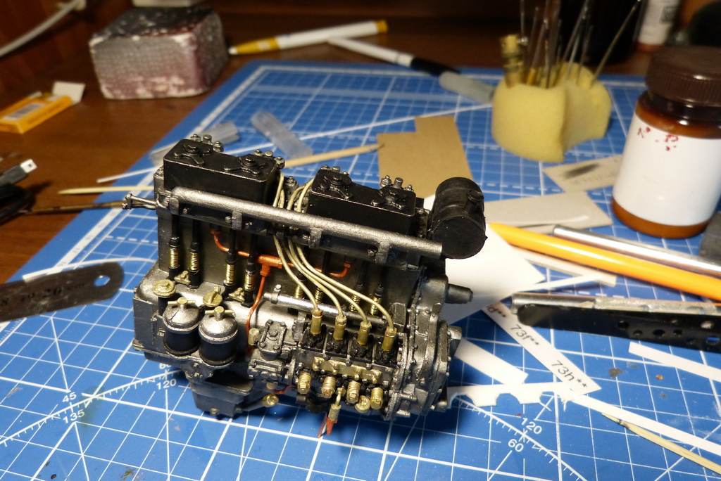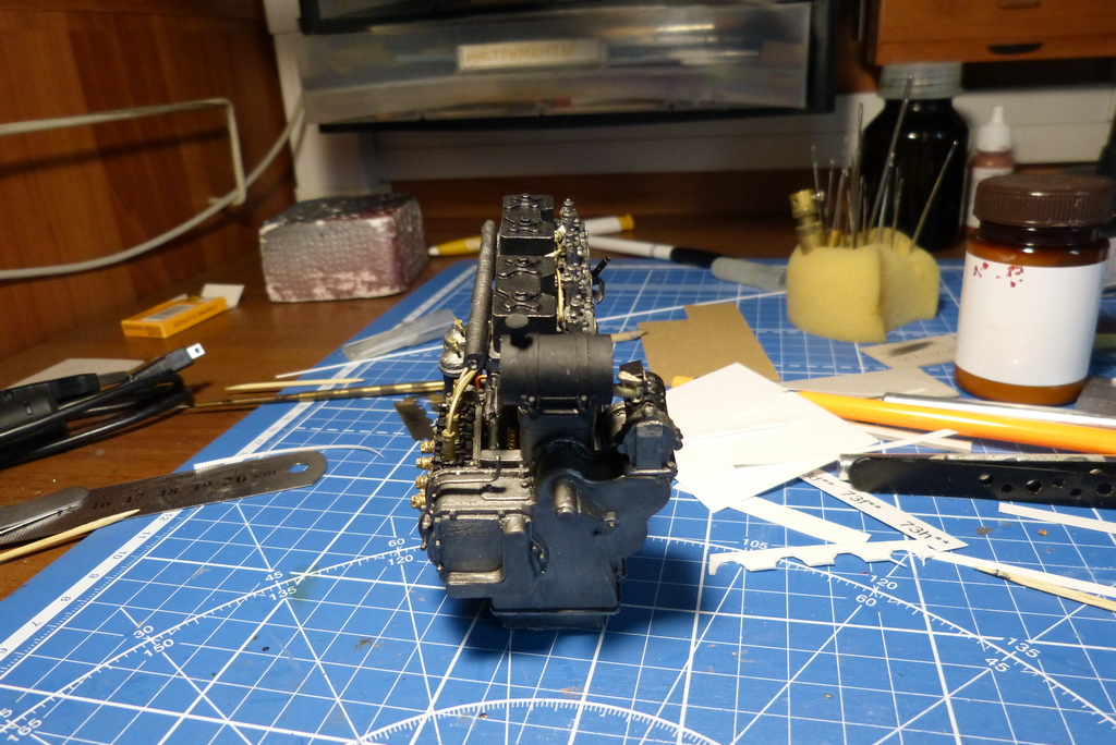 Доделал небольшие деталюшки,крепление задних фар,не ахти как вышло,но как смог,ушки крепления стоек корпуса радиатора,две тяги на корпусе.Сделал трубки радиатора,тут была жуткая проблема,смотрел сборки видел,что ребята наматывали проволочку имитируя ребрышки,но у меня не получилось.