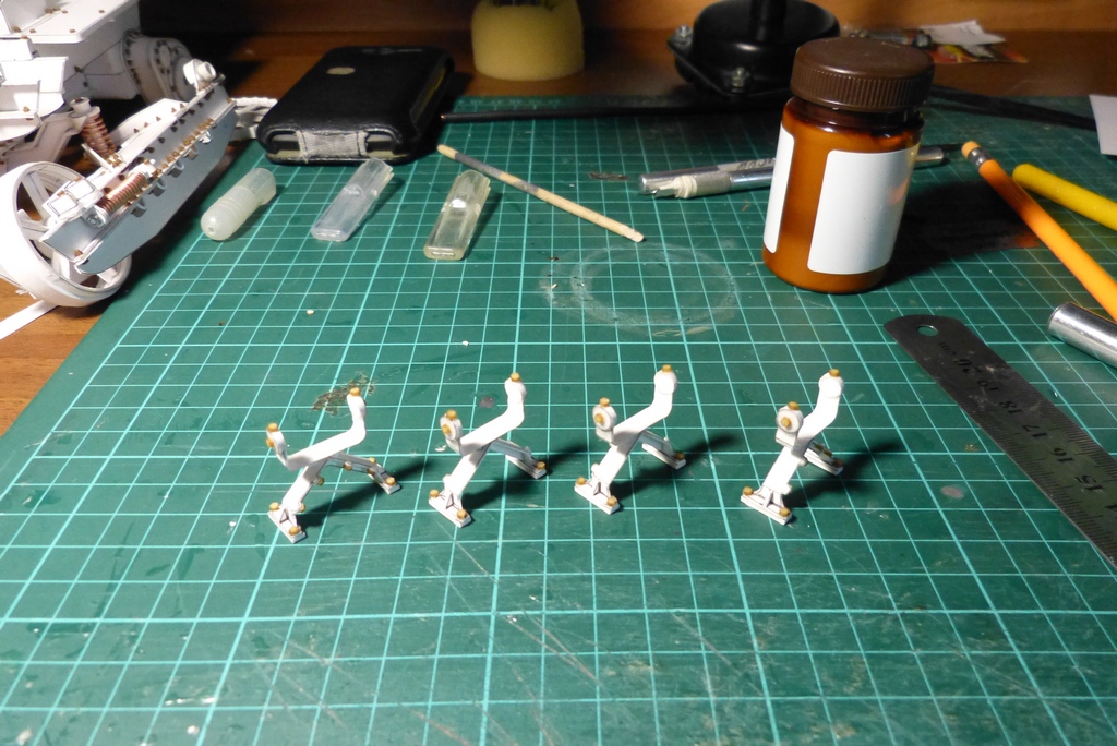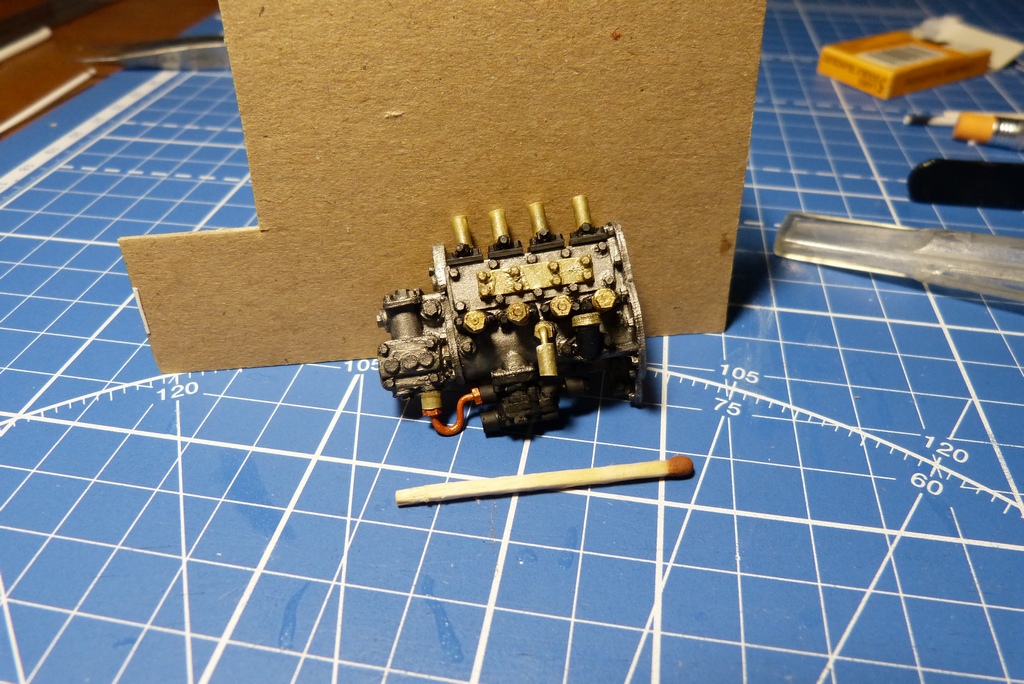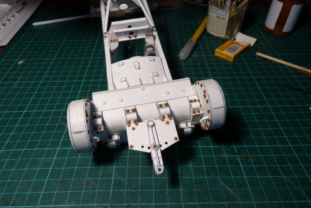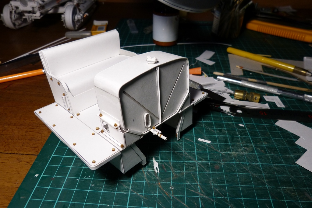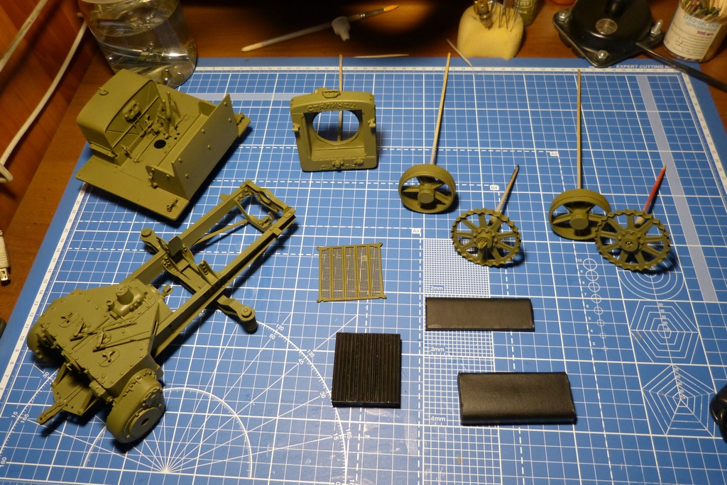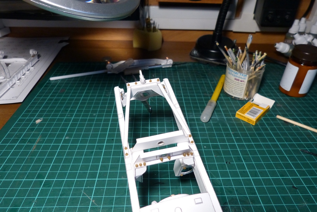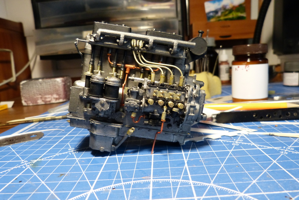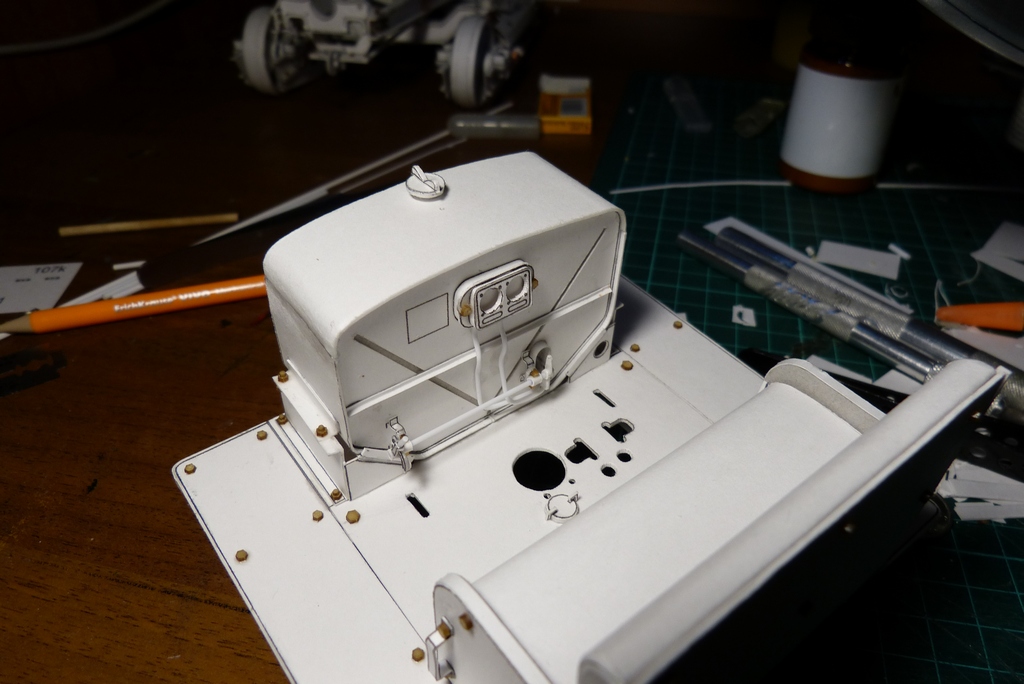 Доделал небольшие деталюшки,крепление задних фар,не ахти как вышло,но как смог,ушки крепления стоек корпуса радиатора,две тяги на корпусе.Сделал трубки радиатора,тут была жуткая проблема,смотрел сборки видел,что ребята наматывали проволочку имитируя ребрышки,но у меня не получилось.