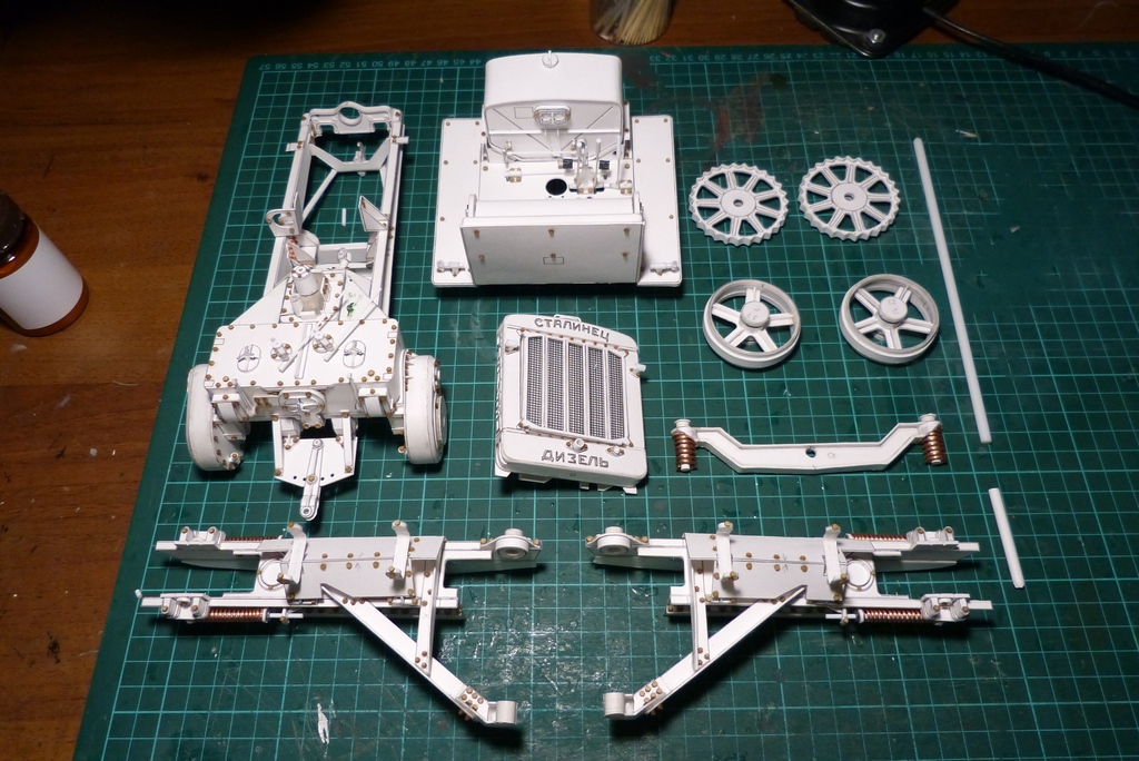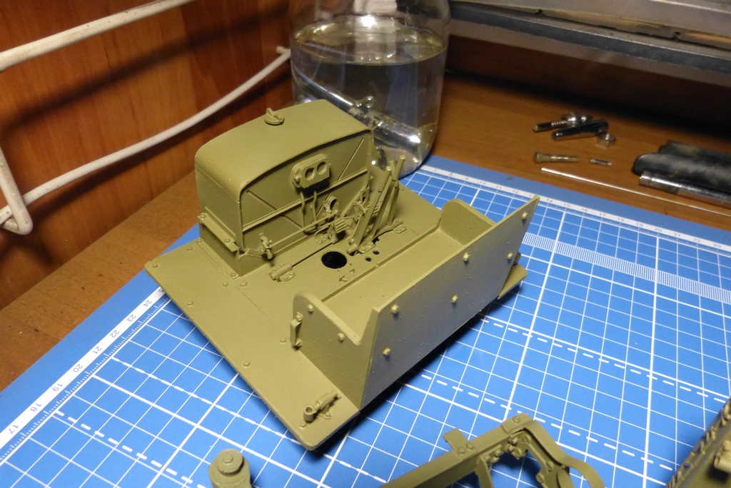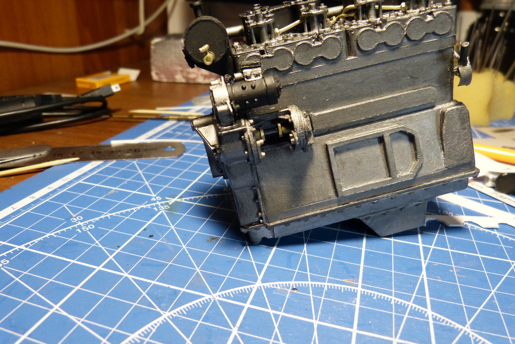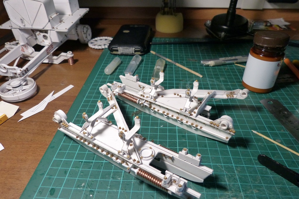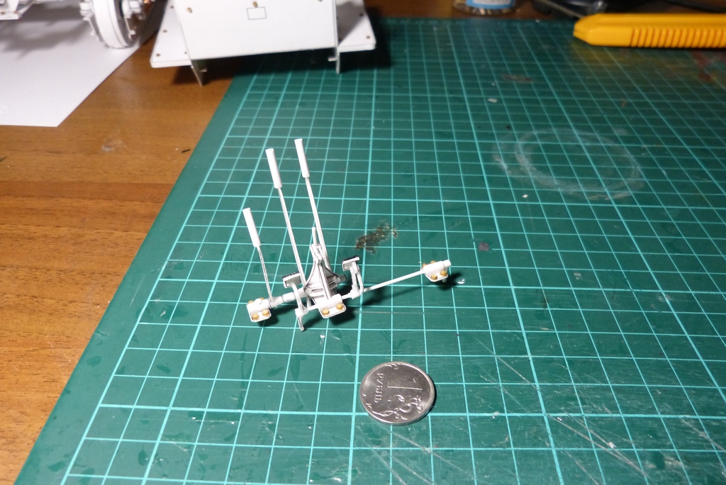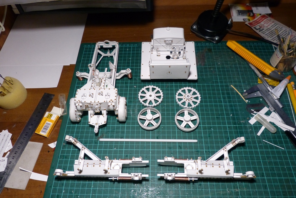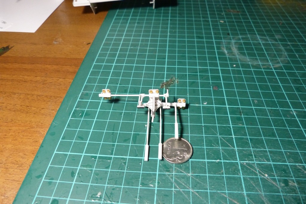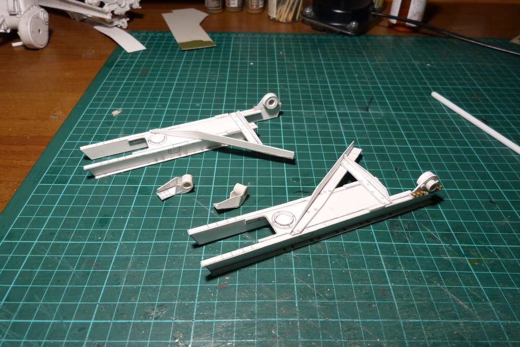 Доделал небольшие деталюшки,крепление задних фар,не ахти как вышло,но как смог,ушки крепления стоек корпуса радиатора,две тяги на корпусе.Сделал трубки радиатора,тут была жуткая проблема,смотрел сборки видел,что ребята наматывали проволочку имитируя ребрышки,но у меня не получилось.