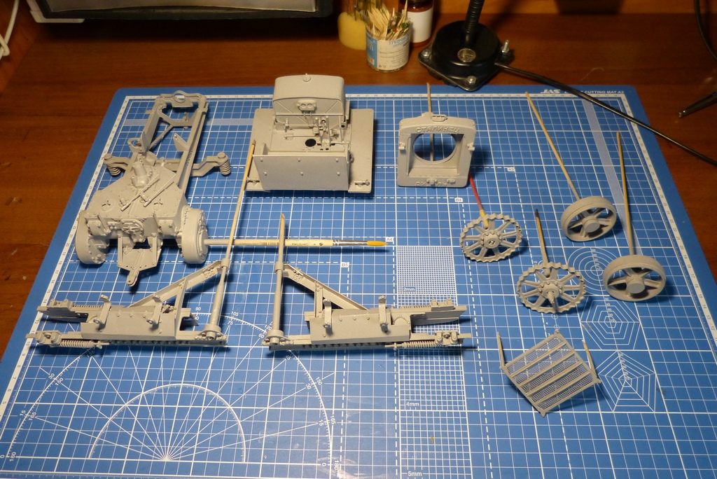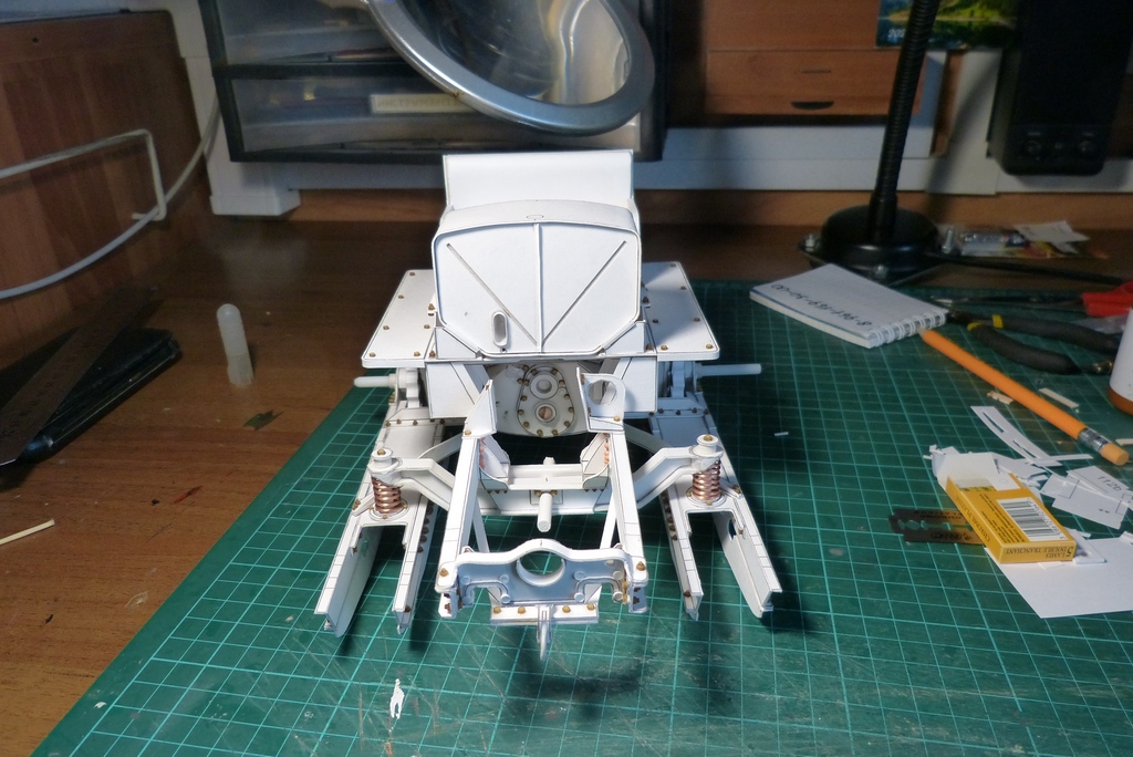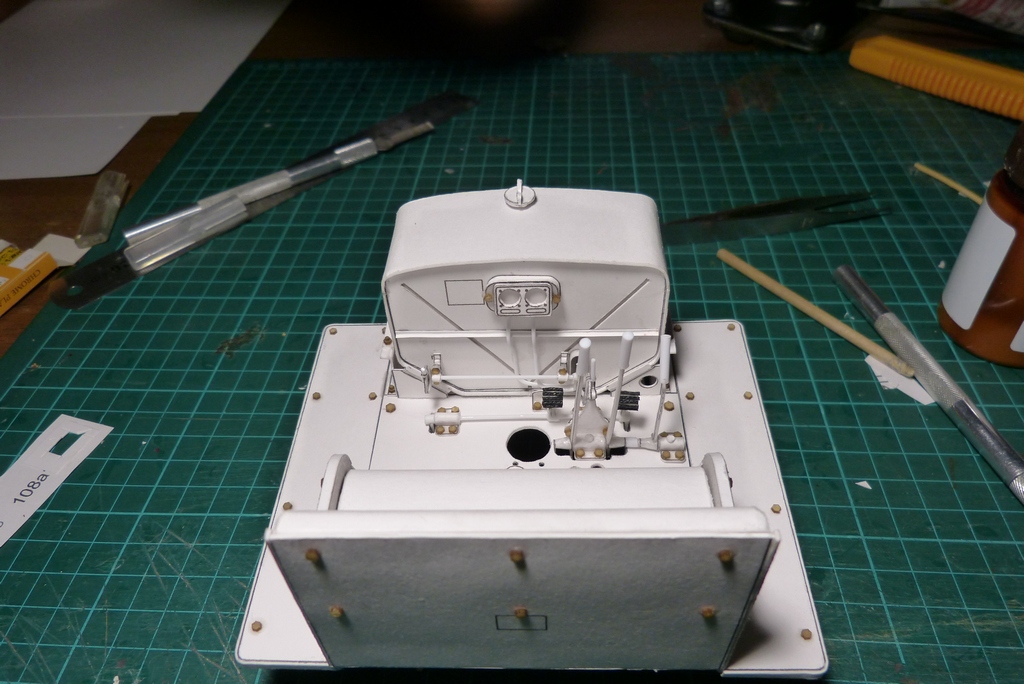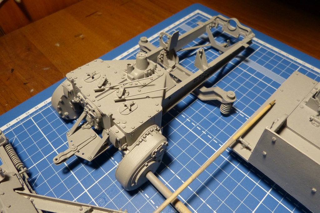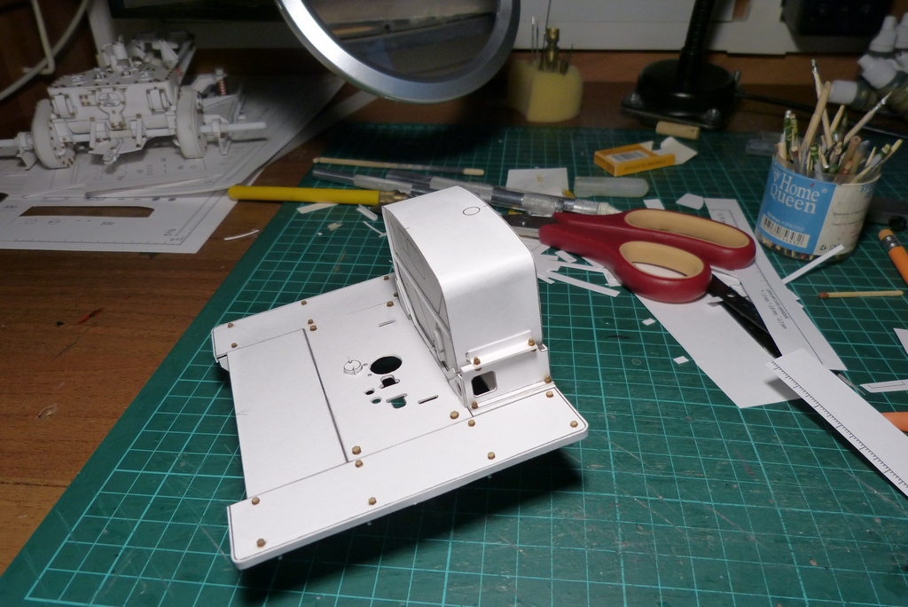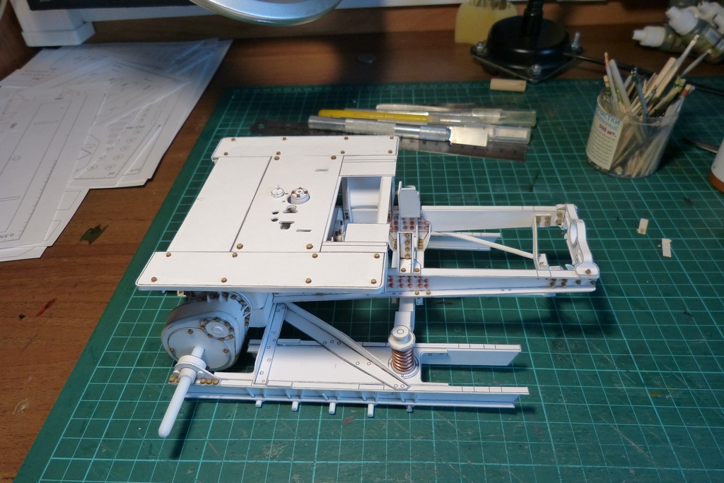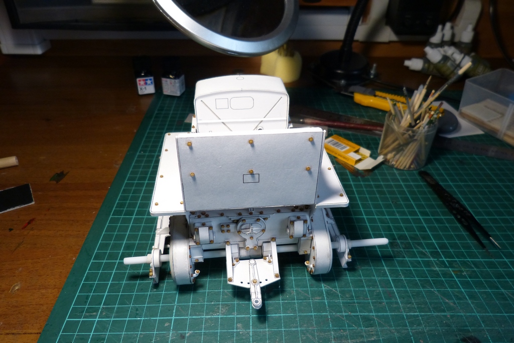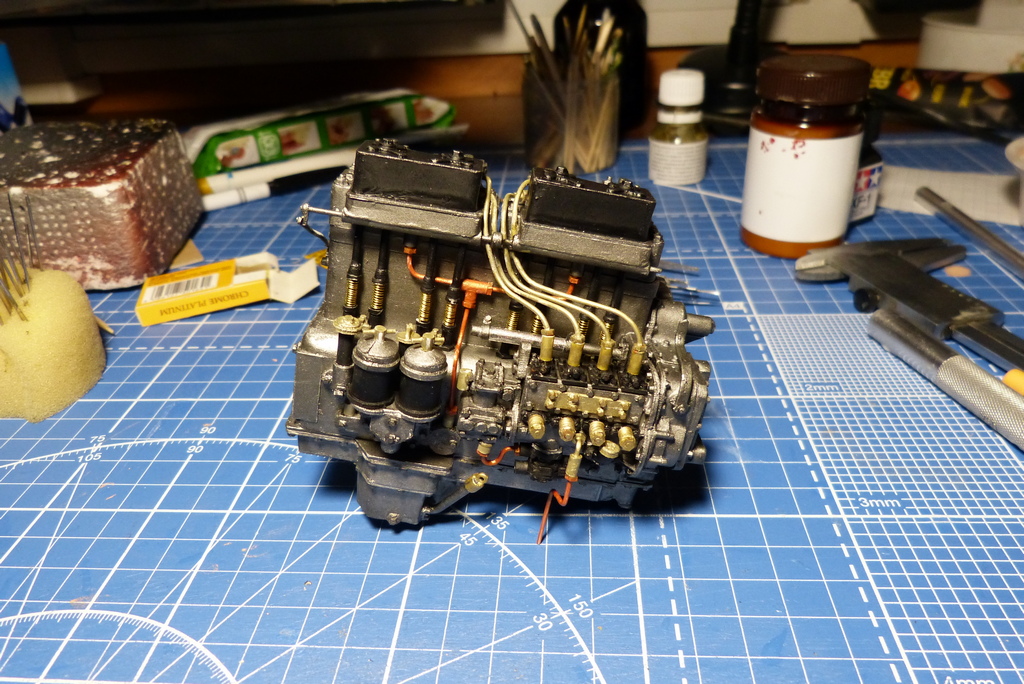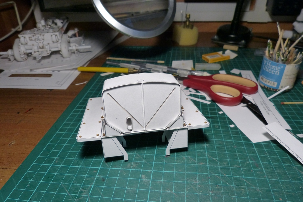 Доделал небольшие деталюшки,крепление задних фар,не ахти как вышло,но как смог,ушки крепления стоек корпуса радиатора,две тяги на корпусе.Сделал трубки радиатора,тут была жуткая проблема,смотрел сборки видел,что ребята наматывали проволочку имитируя ребрышки,но у меня не получилось.
