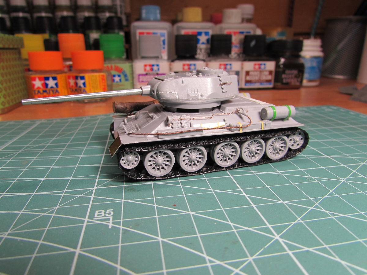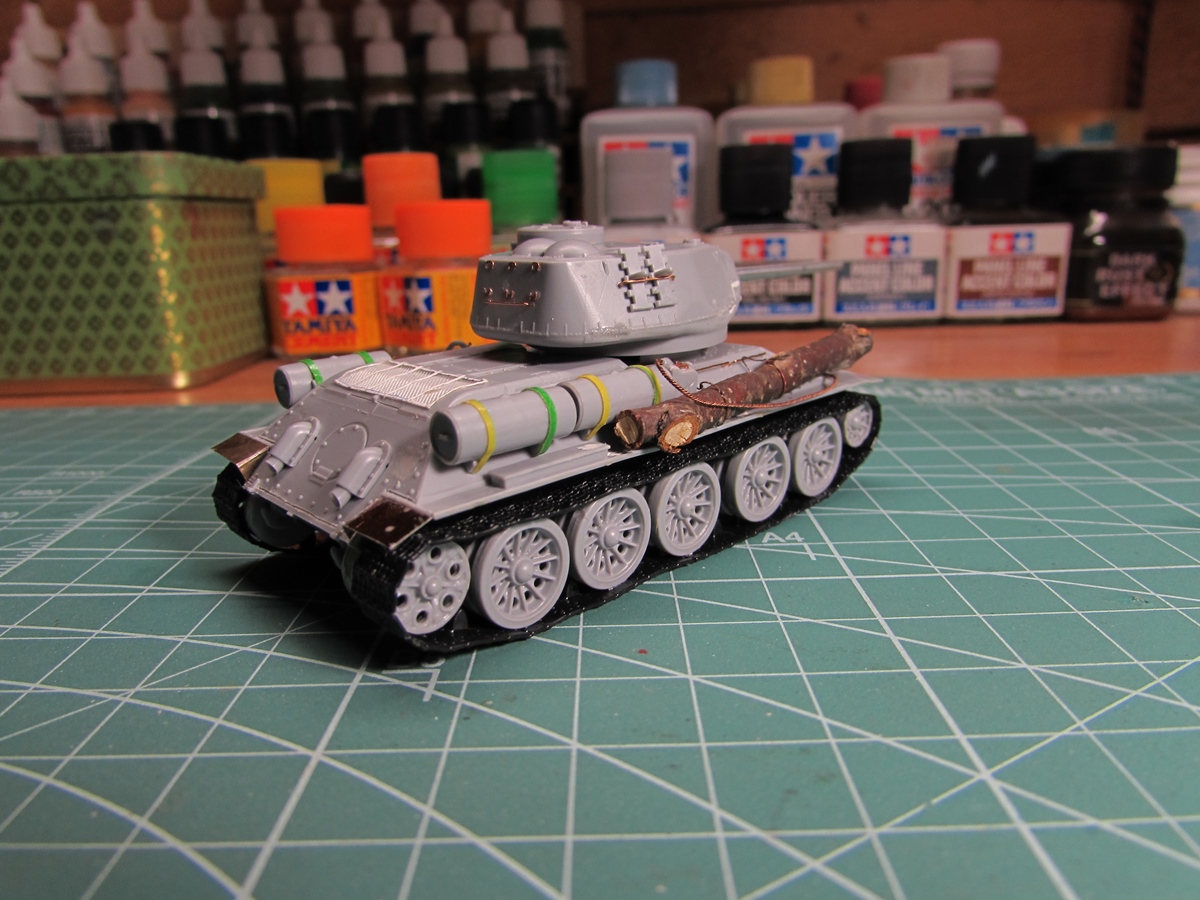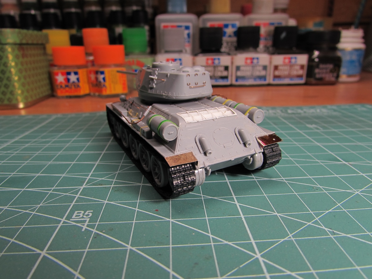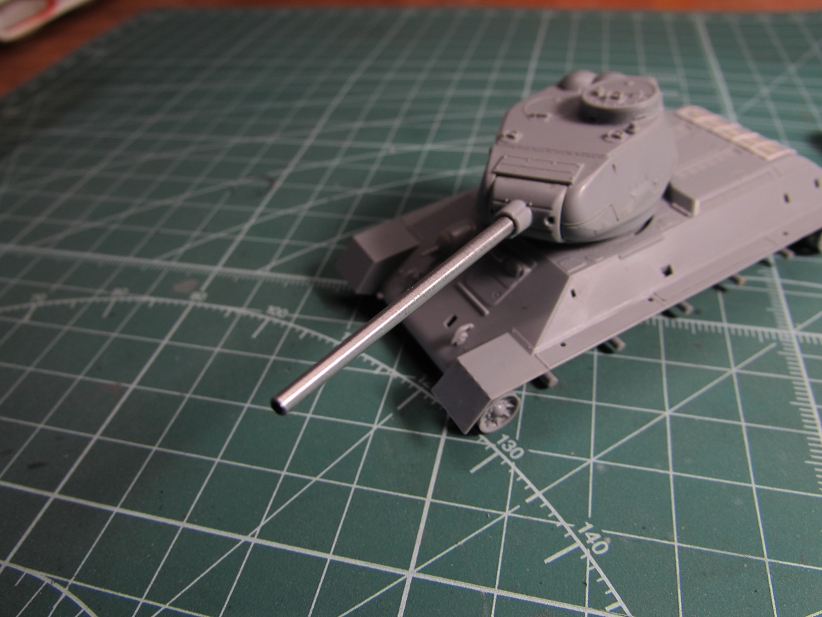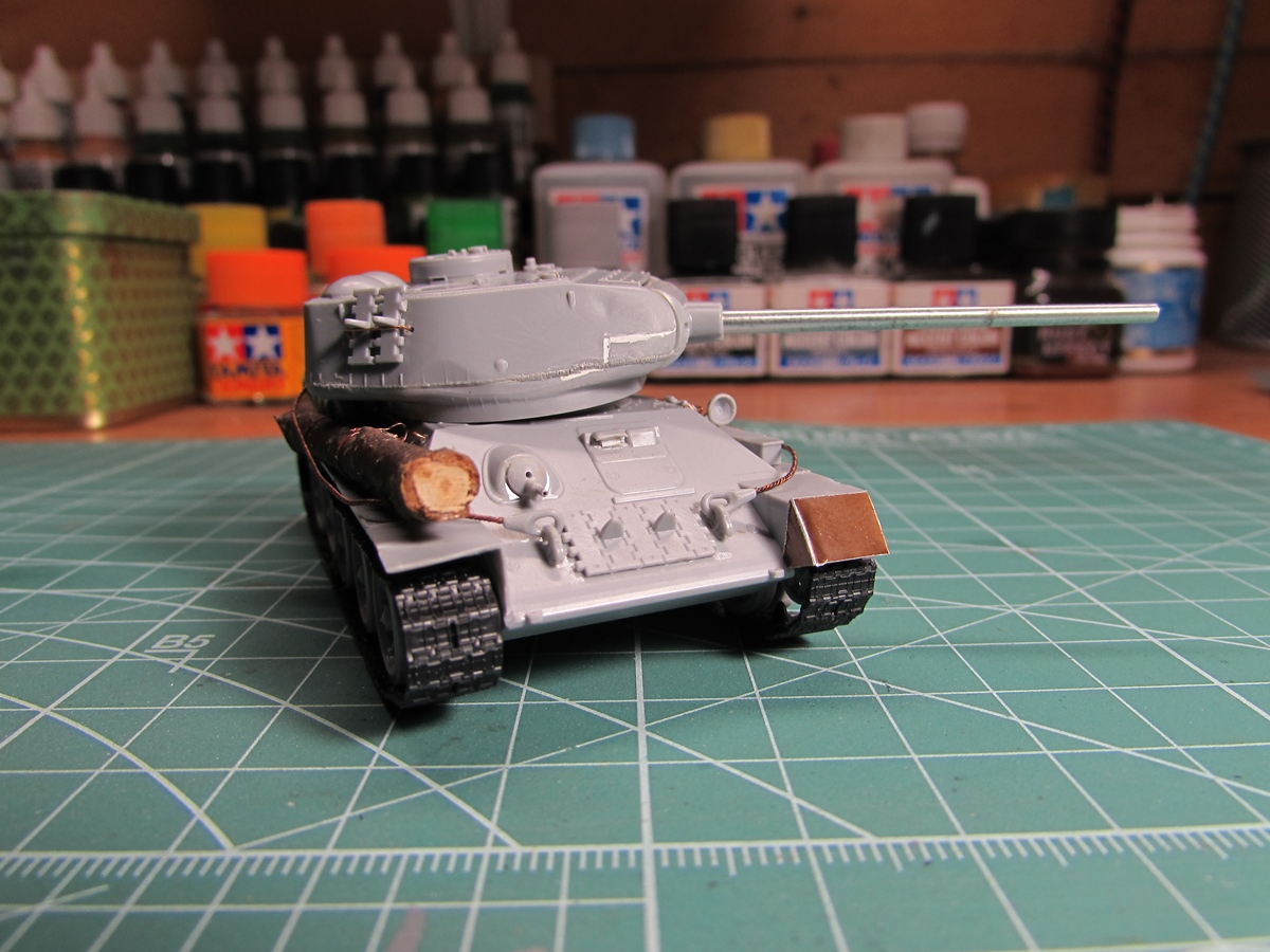 Присоединяюсь к стройке. Имеется начатый несколько лет назад Т-34-85. Доработки: металлический ствол, решетка МТО из чайного пакетика и дрширакопласта, открыт один из перископов мехвода. За прототип был выбран Т-34-85 50-й Гвардейской танковой бригады 9-го танкового корпуса. Танк поздних серий выпуска, построен на заводе 183 в Нижнем Тагиле.