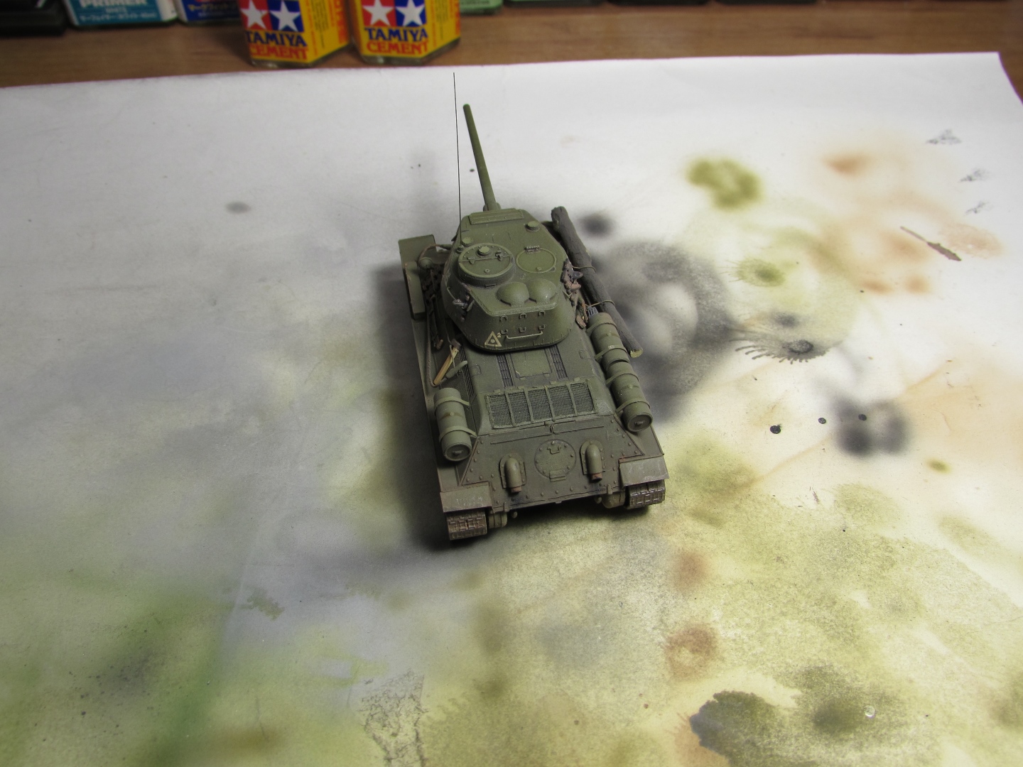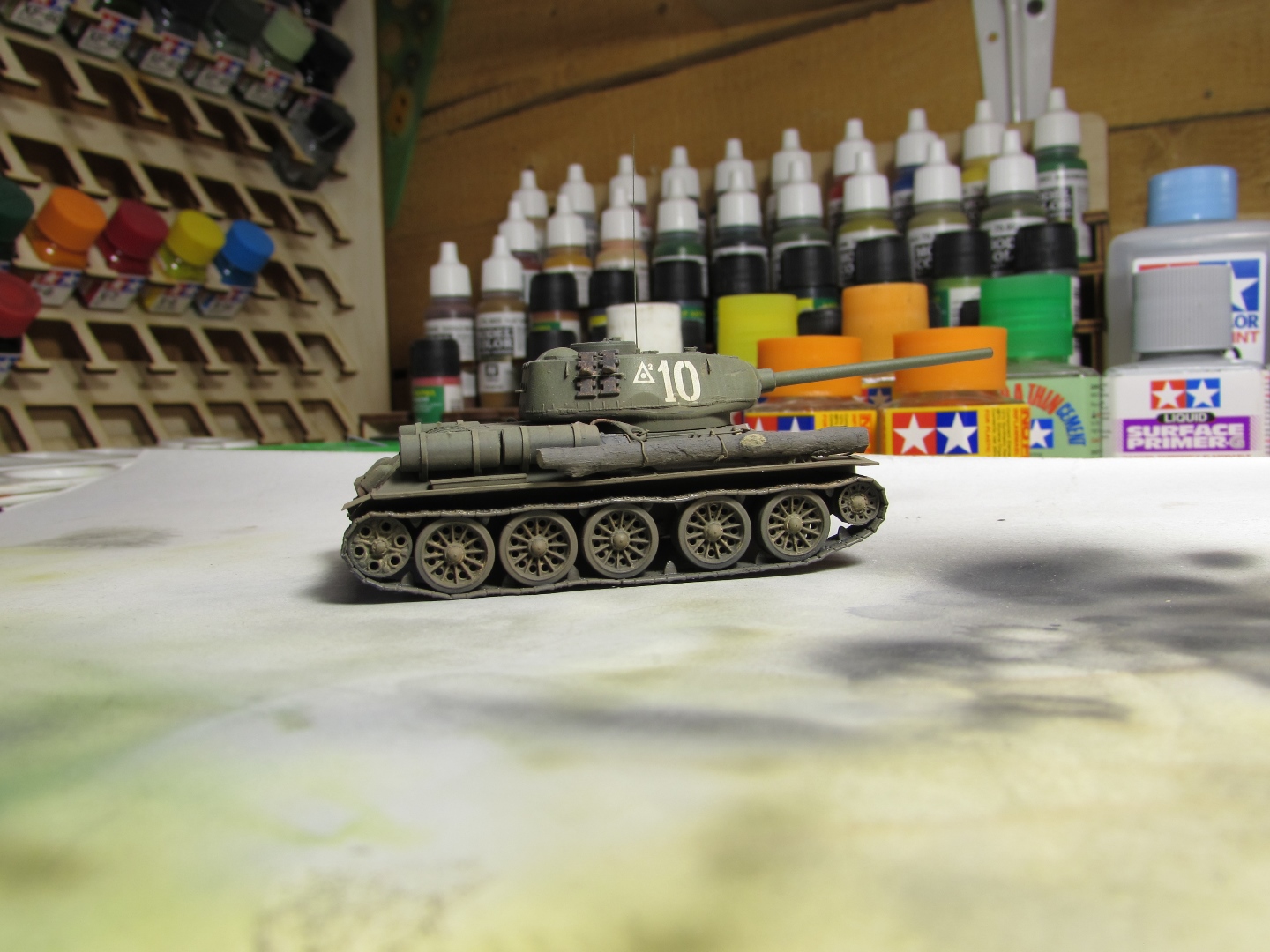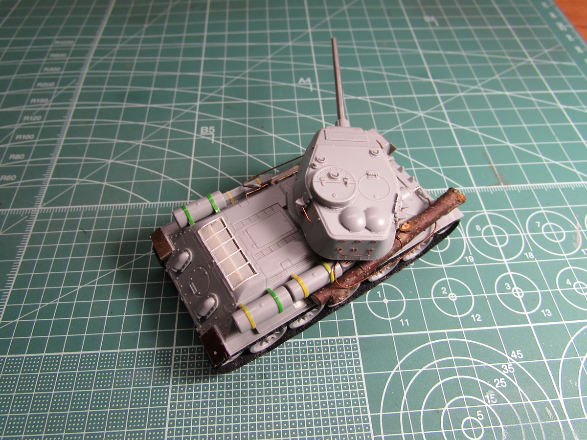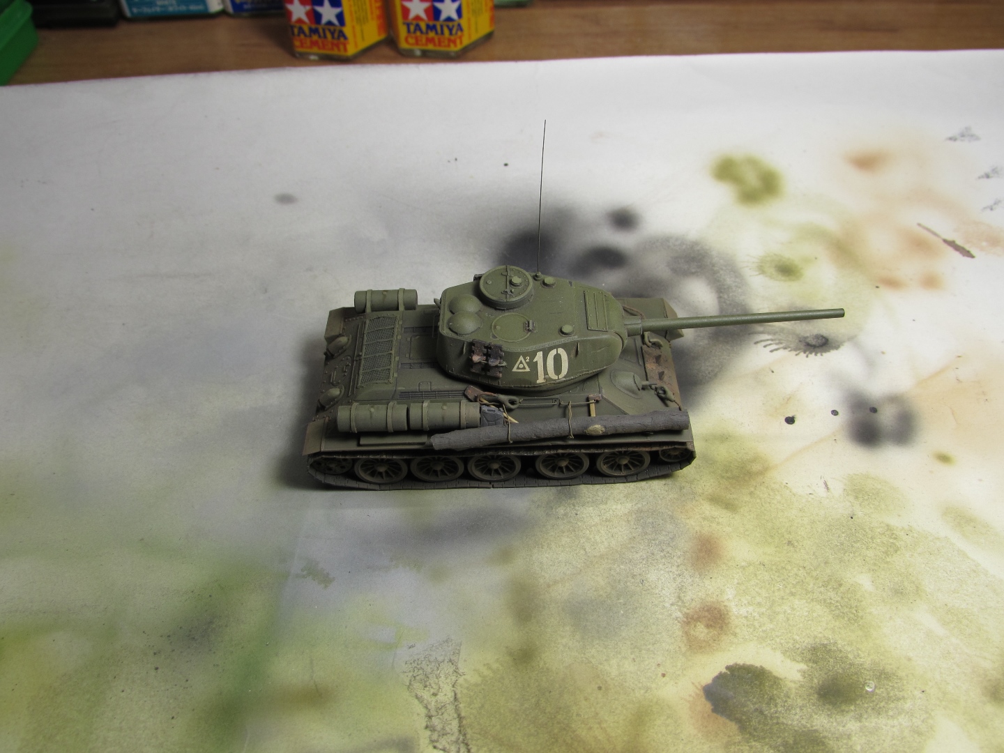 Присоединяюсь к стройке. Имеется начатый несколько лет назад Т-34-85. Доработки: металлический ствол, решетка МТО из чайного пакетика и дрширакопласта, открыт один из перископов мехвода. За прототип был выбран Т-34-85 50-й Гвардейской танковой бригады 9-го танкового корпуса. Танк поздних серий выпуска, построен на заводе 183 в Нижнем Тагиле.