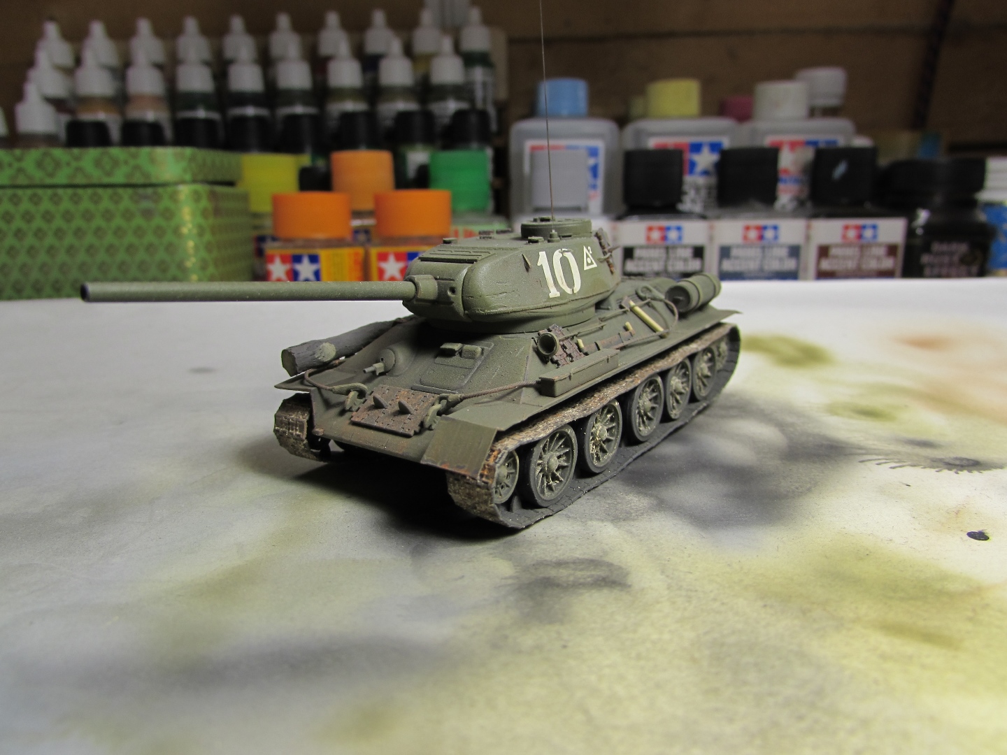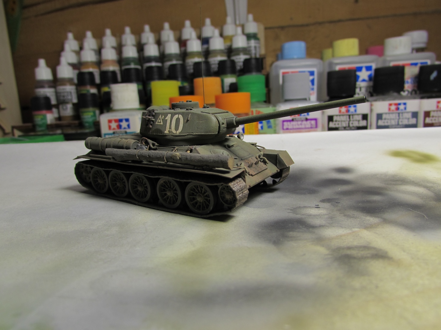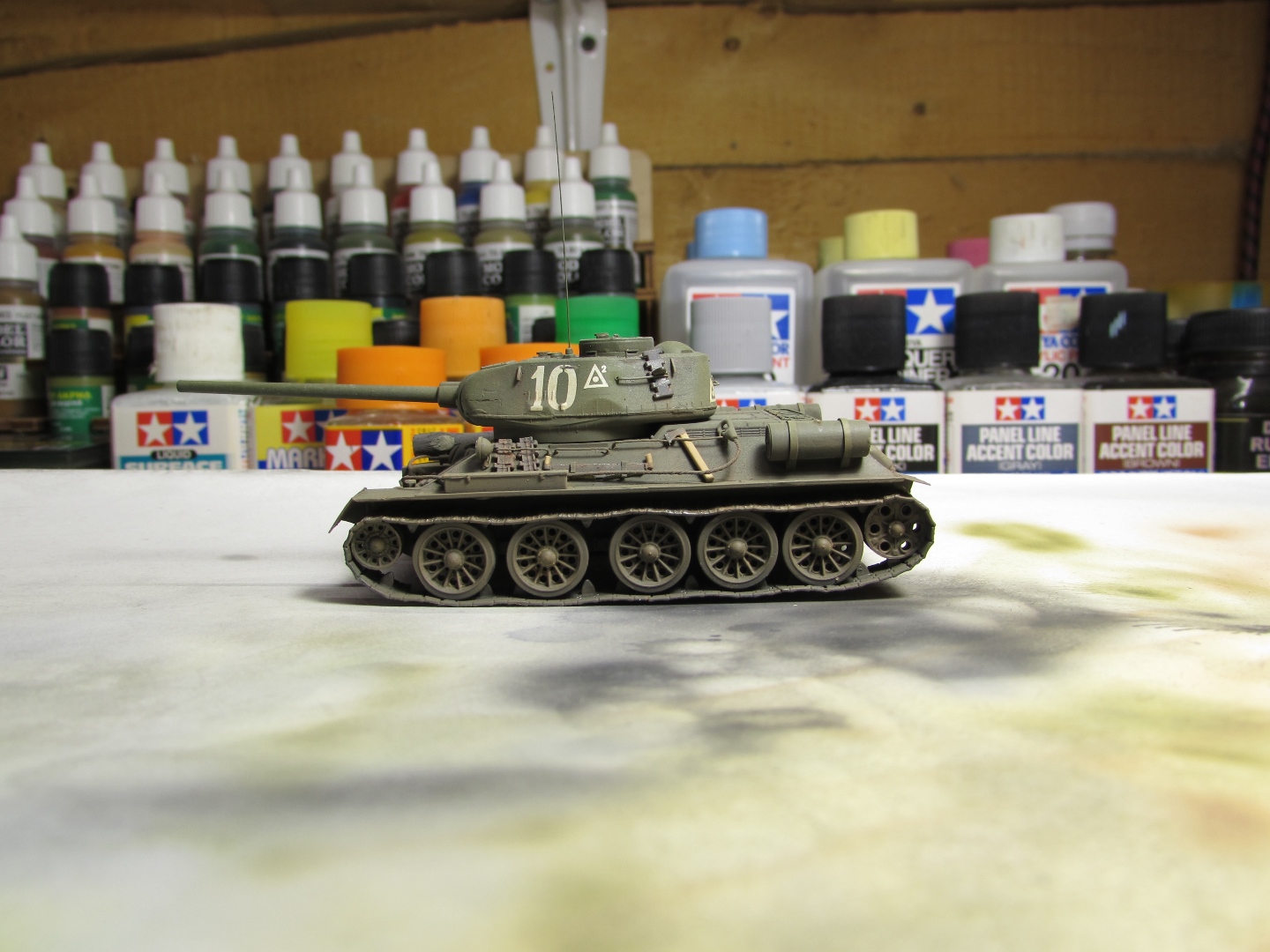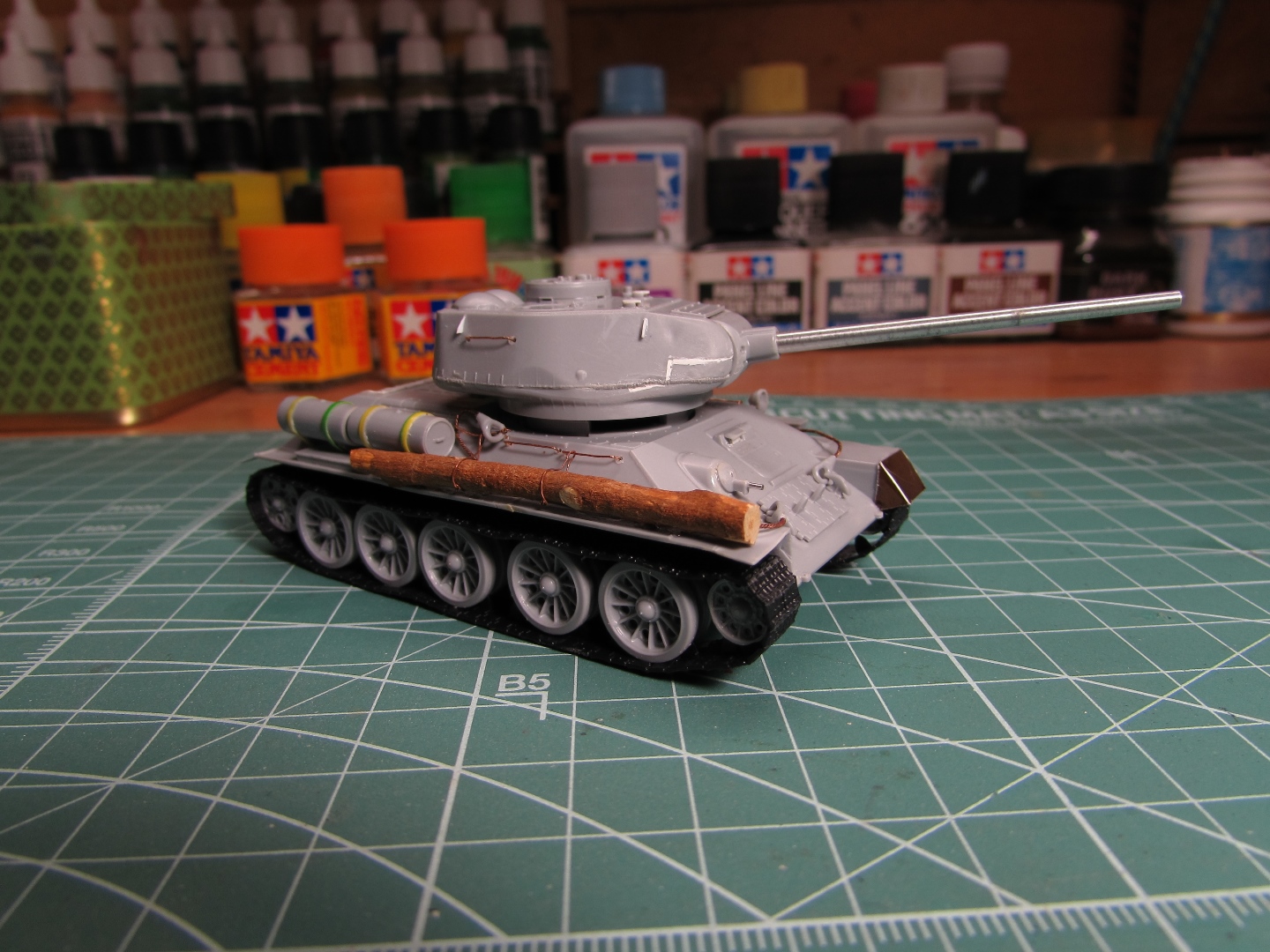 Присоединяюсь к стройке. Имеется начатый несколько лет назад Т-34-85. Доработки: металлический ствол, решетка МТО из чайного пакетика и дрширакопласта, открыт один из перископов мехвода. За прототип был выбран Т-34-85 50-й Гвардейской танковой бригады 9-го танкового корпуса. Танк поздних серий выпуска, построен на заводе 183 в Нижнем Тагиле.