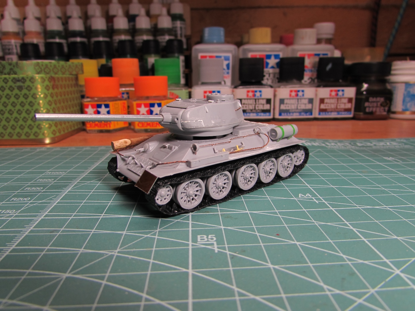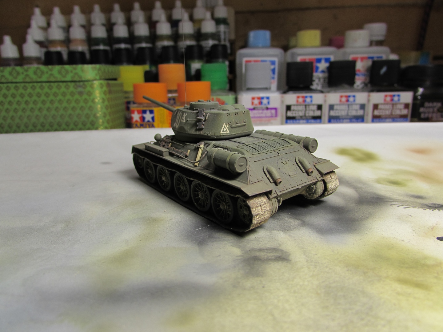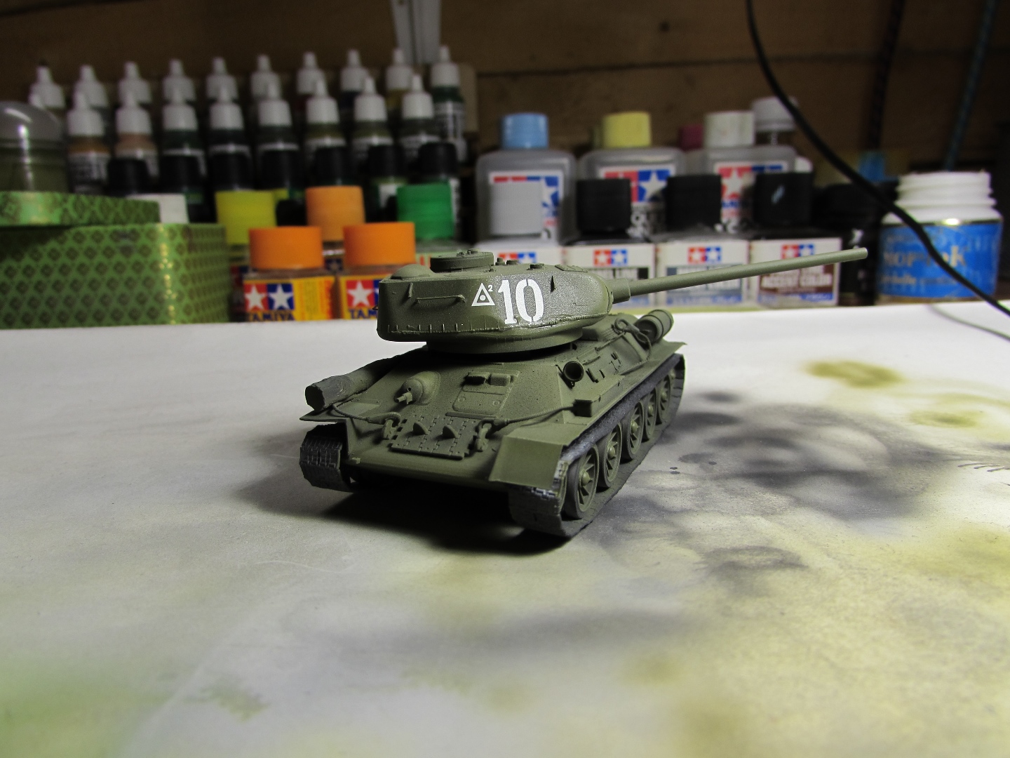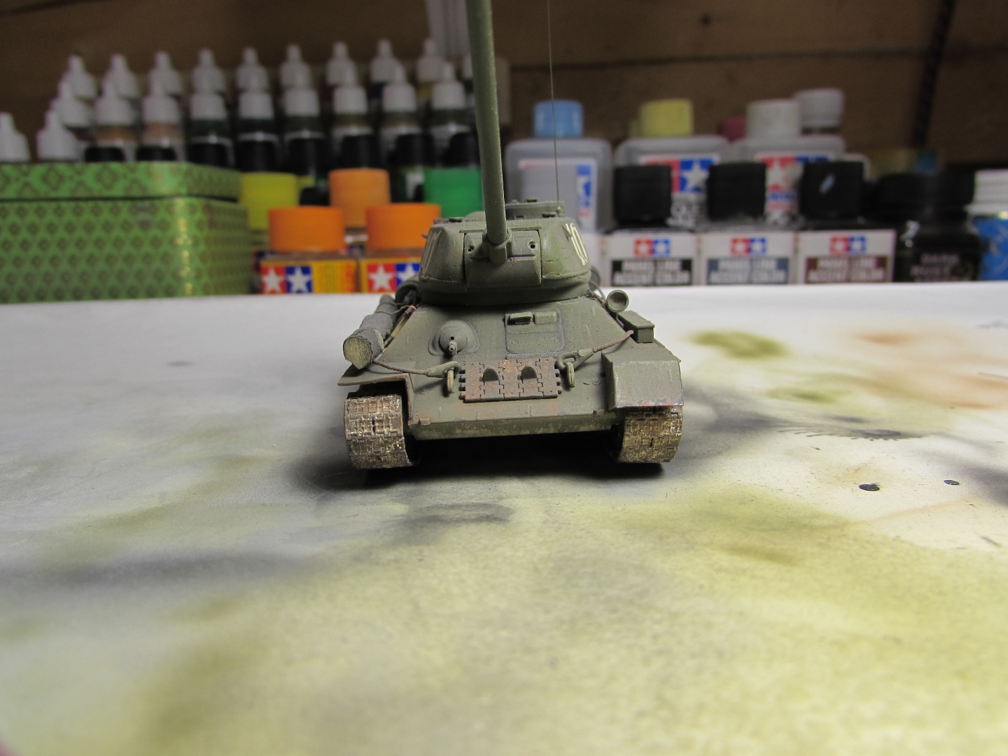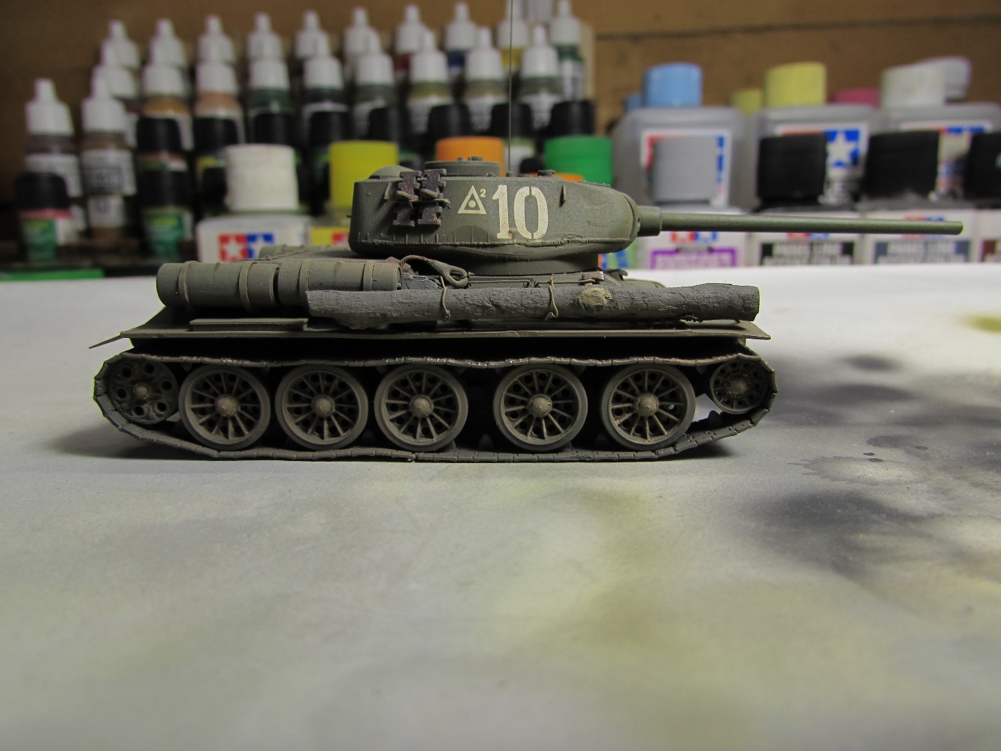 Присоединяюсь к стройке. Имеется начатый несколько лет назад Т-34-85. Доработки: металлический ствол, решетка МТО из чайного пакетика и дрширакопласта, открыт один из перископов мехвода. За прототип был выбран Т-34-85 50-й Гвардейской танковой бригады 9-го танкового корпуса. Танк поздних серий выпуска, построен на заводе 183 в Нижнем Тагиле.