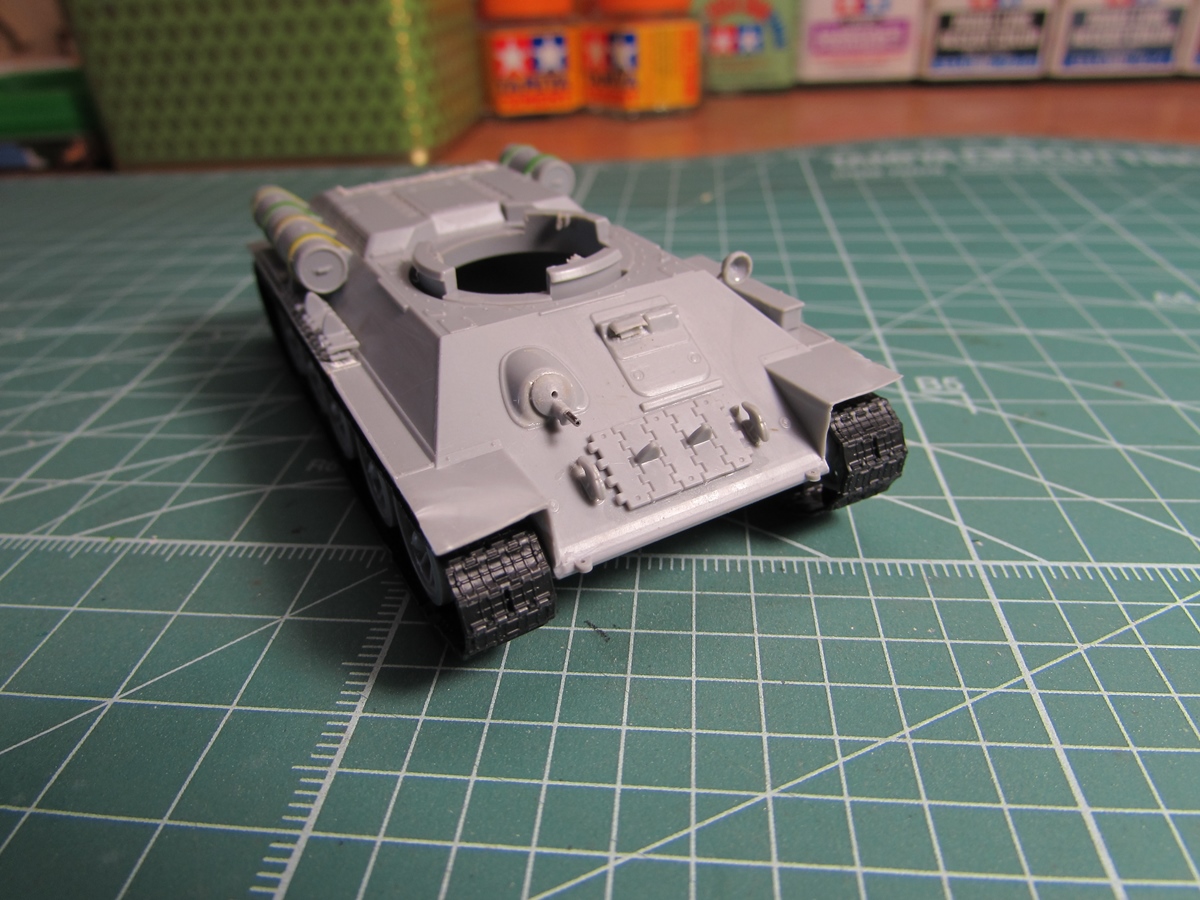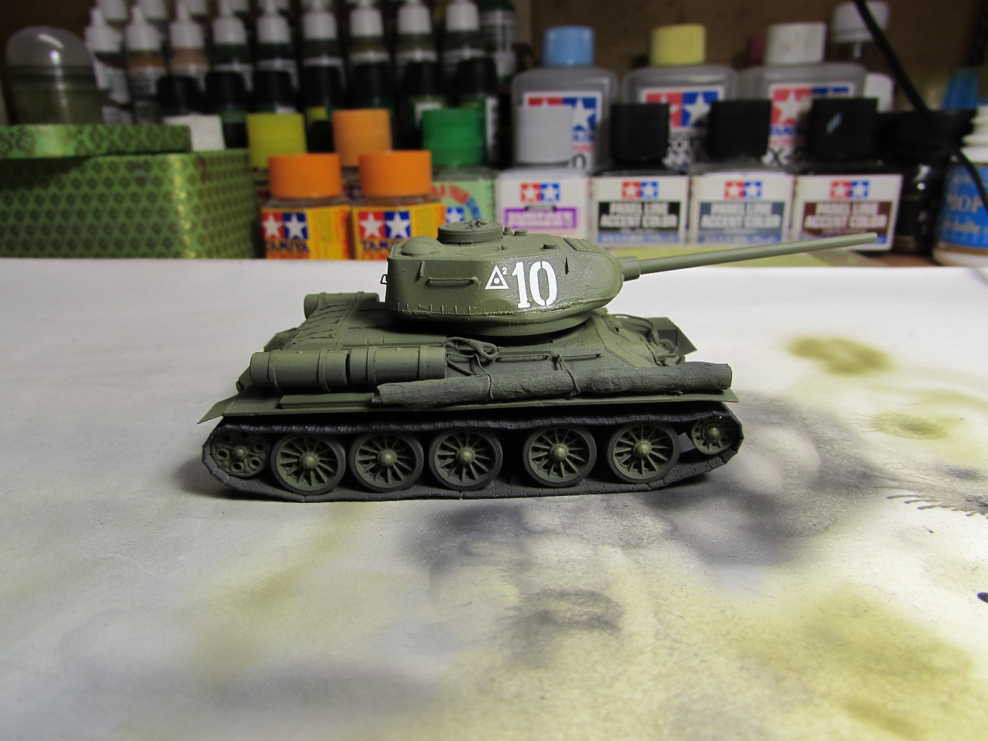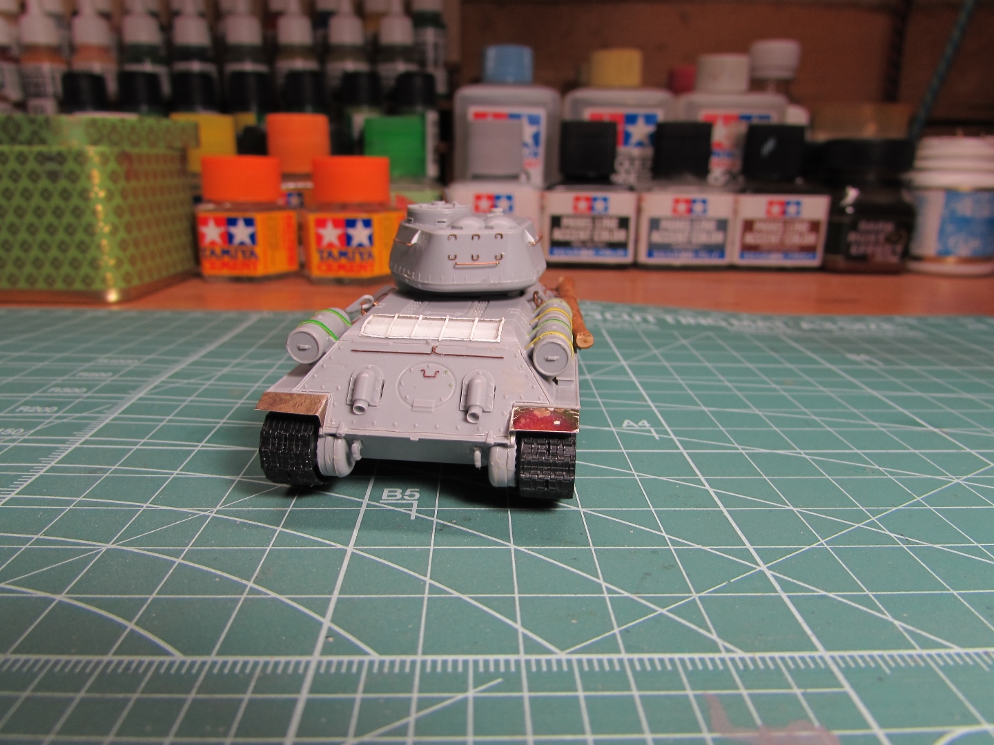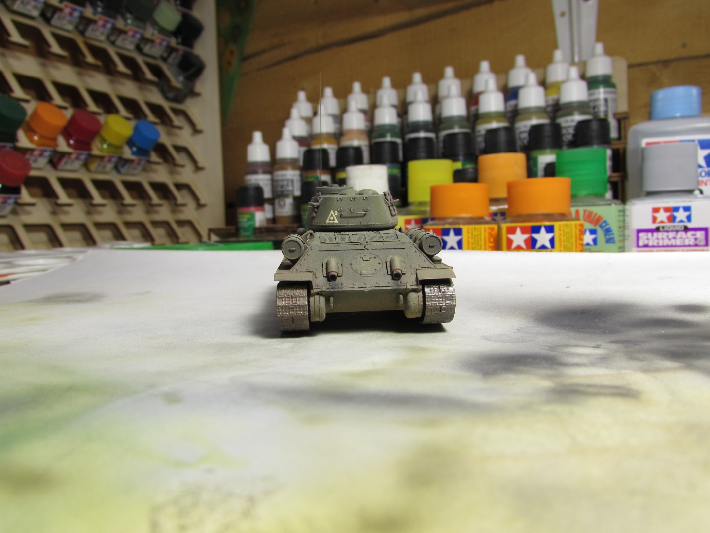 Присоединяюсь к стройке. Имеется начатый несколько лет назад Т-34-85. Доработки: металлический ствол, решетка МТО из чайного пакетика и дрширакопласта, открыт один из перископов мехвода. За прототип был выбран Т-34-85 50-й Гвардейской танковой бригады 9-го танкового корпуса. Танк поздних серий выпуска, построен на заводе 183 в Нижнем Тагиле.