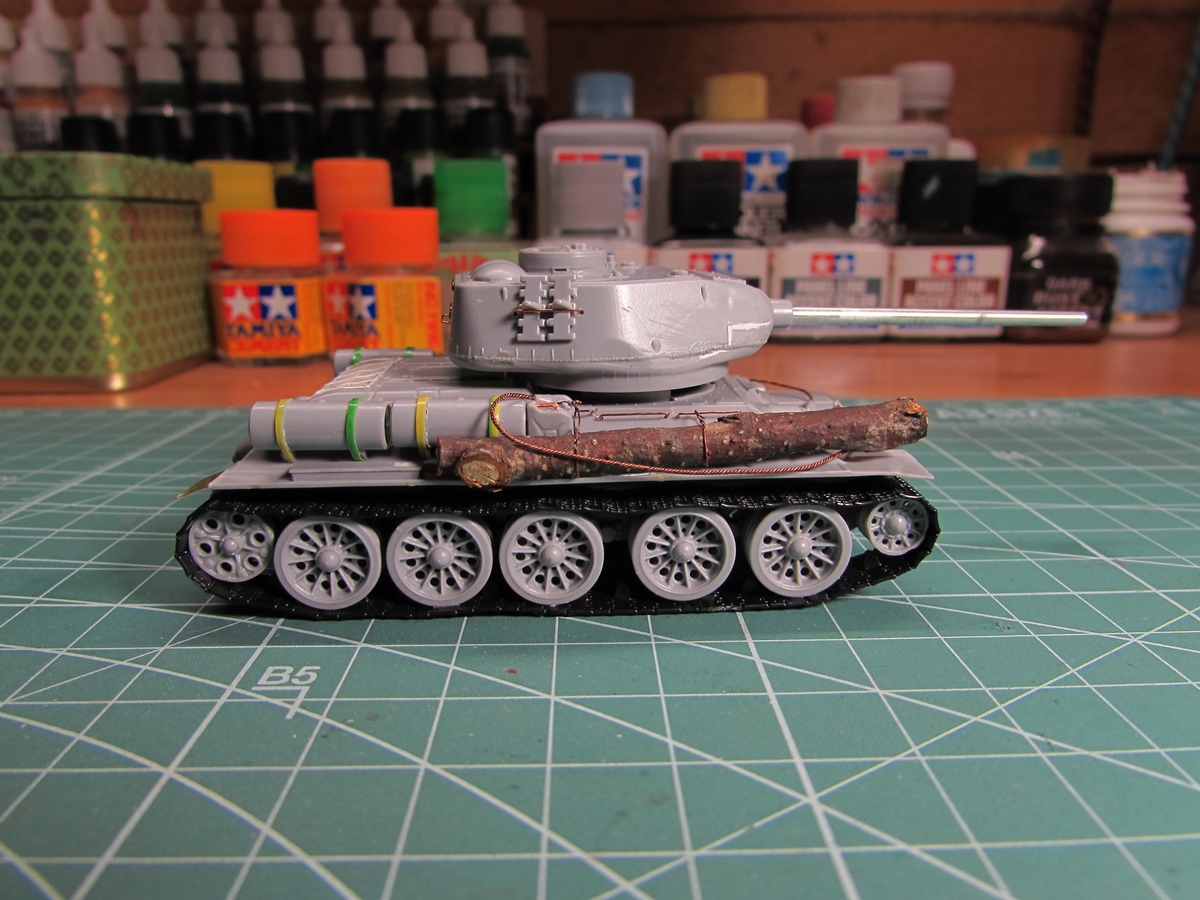 чисто мое мнение и не более. Вы делаете сцену в городе / это из Вашего пояснения к работе/, тогда вопрос? Зачем на машине бревно? К штурму готовились и в бой с марша не вступали, да и на марше шли с тяжелыми боями. А до бревен ли было? Да и в городе лишний обвес мешал и его просто сметало огневым противодействием. Много фото после штурма - где даже баков и лент крепления просто нет, как нет и прочей мелочи словно и не было. К тому же считаю, что оно слишком великовато. Это не бревно, а ствол векового исполина! Его не то что пара человек, а весь экипаж мучаясь будет волочить. Посмотрите сами. Что борт по размеру, что бревно...