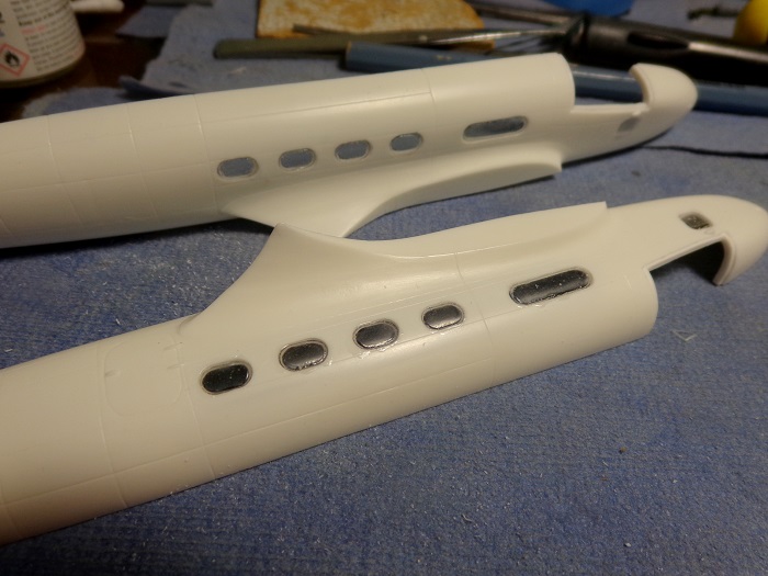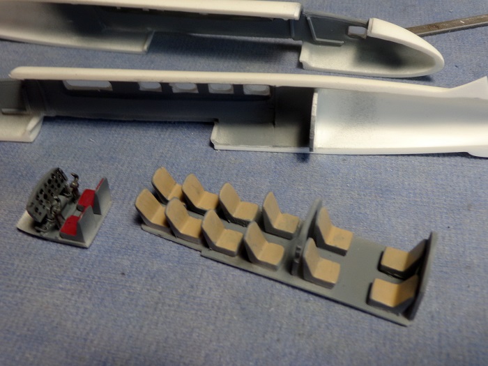 Обычно все эти кабинки, стульчики предполагается предварительно вклеить в одну из половинок фюзеляжа, а потом склеивать уже эти самые половинки. Но у меня возникли сомнения, что эти внутренности могут помешать, т.к. процесс должен быть быстрым и точным. Поэтому решил проигнорировать инструкцию, сначала склею половинки, а потом вставлю в фюзеляж "внутренности". Вроде так должно получиться, уже примерился. Заднюю стенку салона только переставил подальше внутрь, чтоб не мешала при сборке.