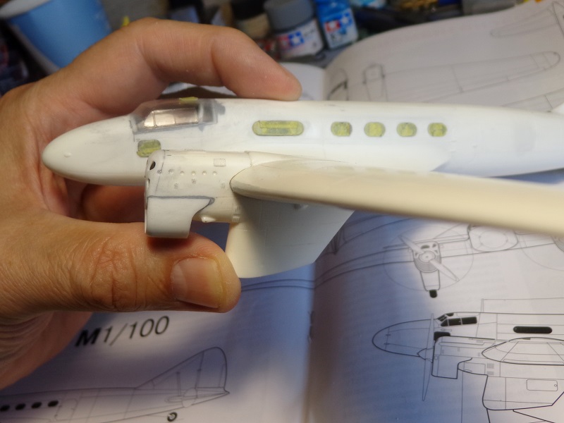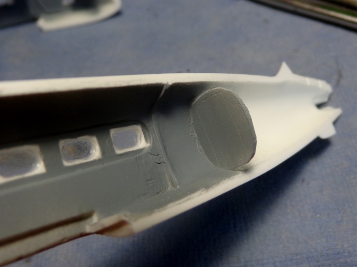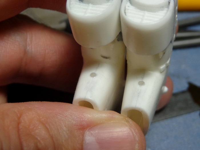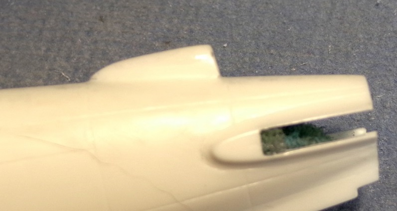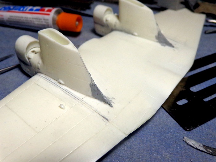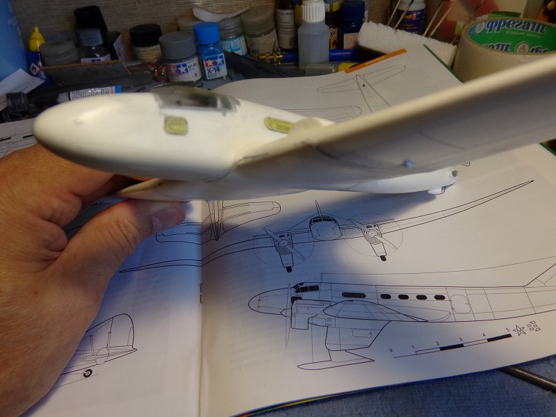Всё же я попробую изобразить "зализы" на задней кромке "штанов". Приклеил два кусочка пластика, замазал шпаклевкой.