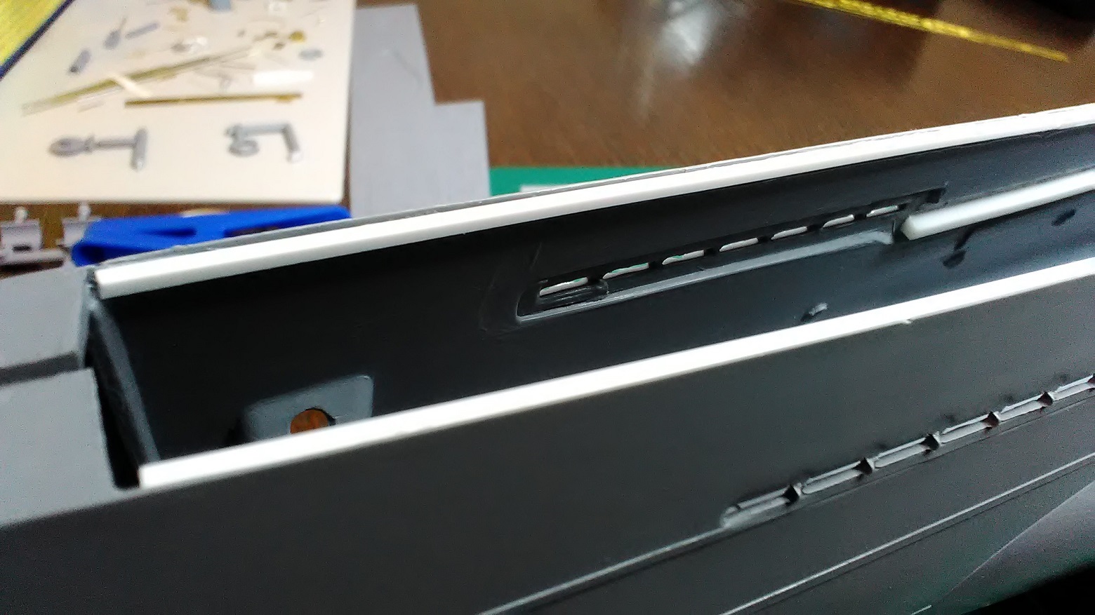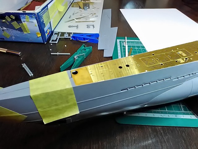 Да, для плотной укладки травленой палубы, приклеил полоски Эвергрин, заодно заклеил ненужные шпигаты.